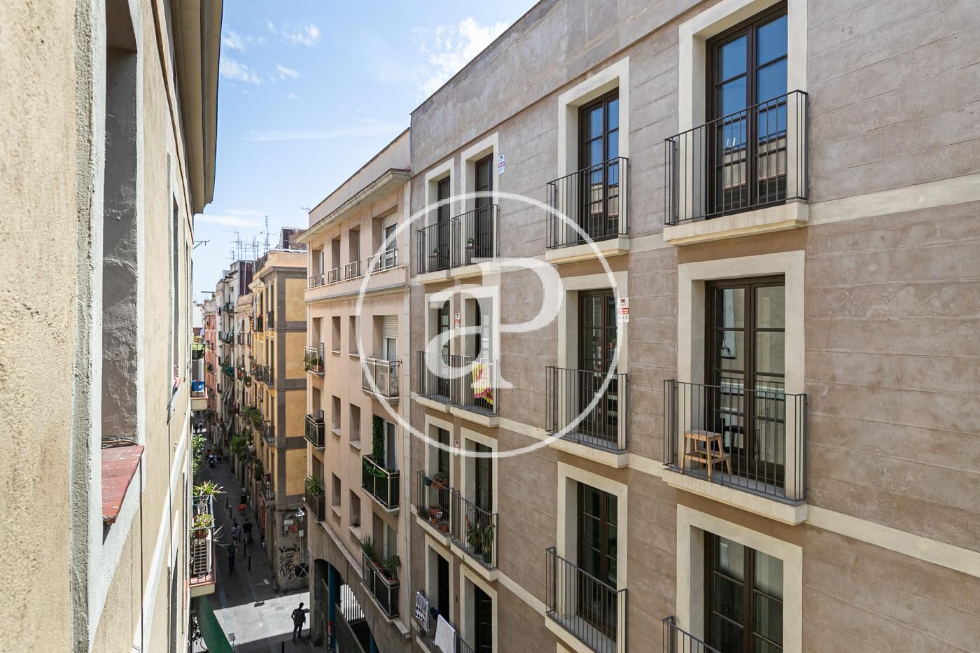 En un enclave estratégico del cosmopolita y atractivo barrio de Raval, en Barcelona, a 100mts de la Ronda Sant Pau y el mercado de Sant Antoni, encontramos este edificio que fue construido en 1846, esquinero e íntegramente rehabilitado. Este loft de 85m², tiene techos altos con viga de madera recuperada y salida a dos balcones con doble orientación (sureste y suroeste), al entrar encontramos un primer espacio sin reformar donde se encuentra la cocina - recibidor, y a continuación un amplio espacio tipo loft totalmente reformado (2005), que con una separación del salón - comedor con pladur a medio techo, sería una habitación doble con armario empotrado, un baño completo con bañera y un aseo. Terraza para uso comunitario en la azotea del edificio. Piso en cuarta planta real sin ascensor.