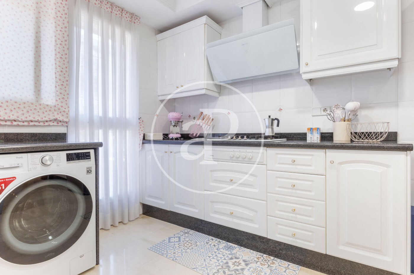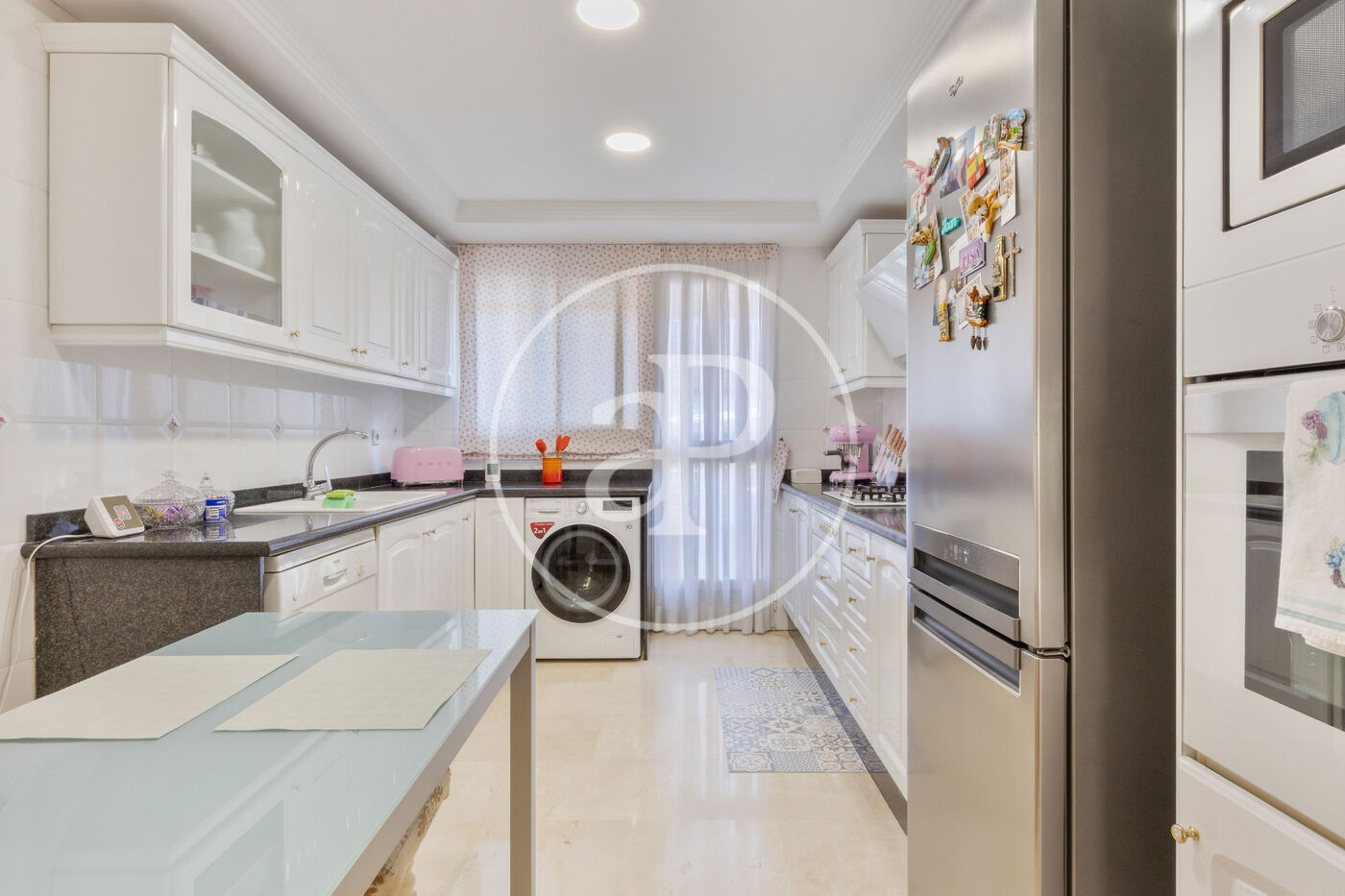 En la misma planta, encontramos una cocina totalmente equipada, con muebles lacados en blanco que aportan un aire de modernidad y sofisticación, complementada por una práctica zona office que tiene acceso a una segunda terraza más íntima, perfecta para momentos de paz. También cuenta con un elegante aseo de cortesía en esta misma área.
