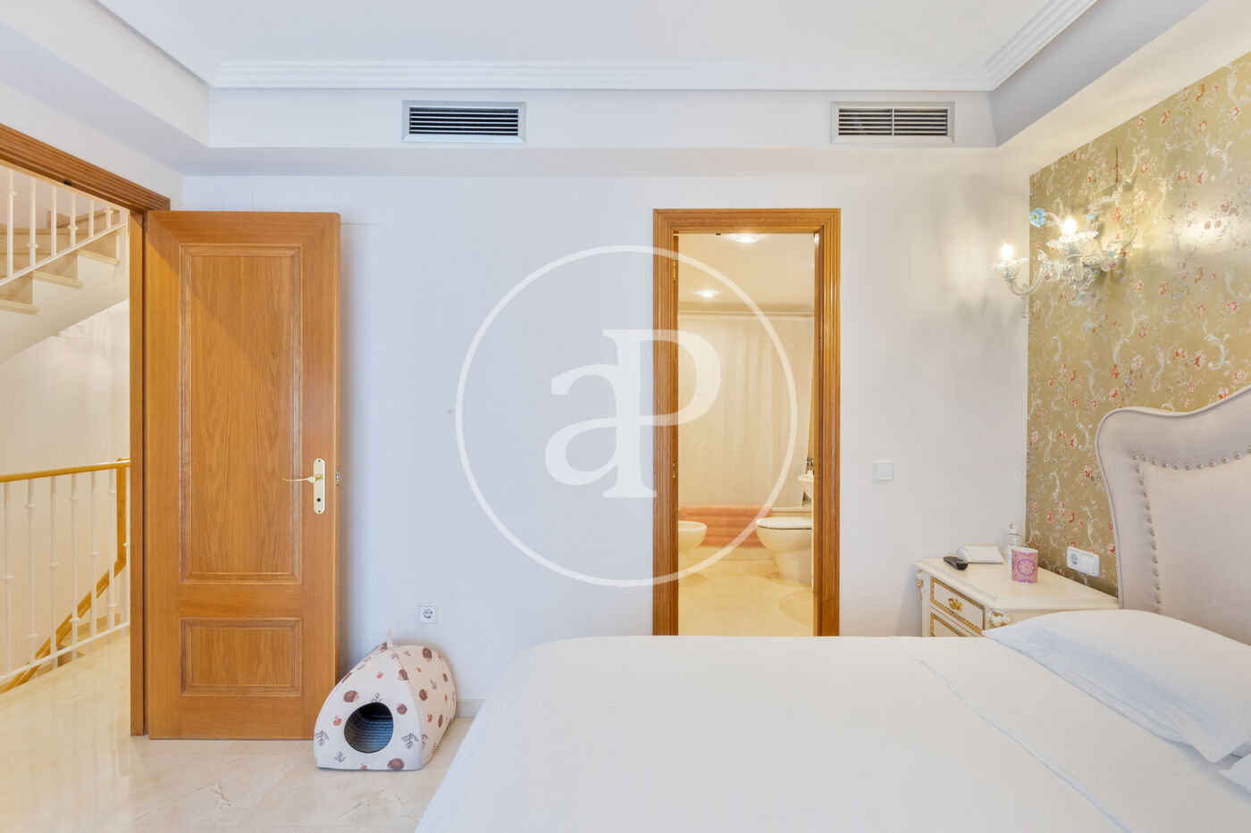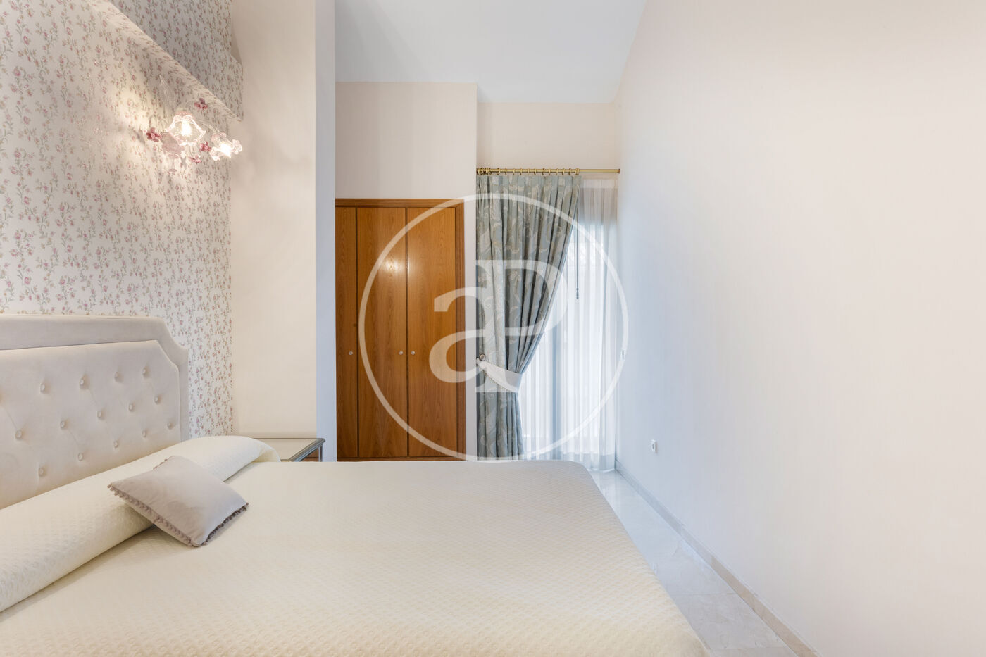 La primera planta está destinada a la zona privada de descanso, compuesta por tres habitaciones. Dos de ellas son dobles; la habitación principal cuenta con un lujoso baño en suite y un vestidor, mientras que la tercera habitación es individual. Todas las estancias están dotadas de techos altos abuhardillados y armarios empotrados, proporcionando un glamour adicional. En esta planta también se aprecia un baño completo equipado con bañera, ofreciendo comodidad y funcionalidad. Cada habitación dispone de acceso a un balcón privado, donde se puede respirar el aire mediterráneo sin necesidad de salir del hogar.