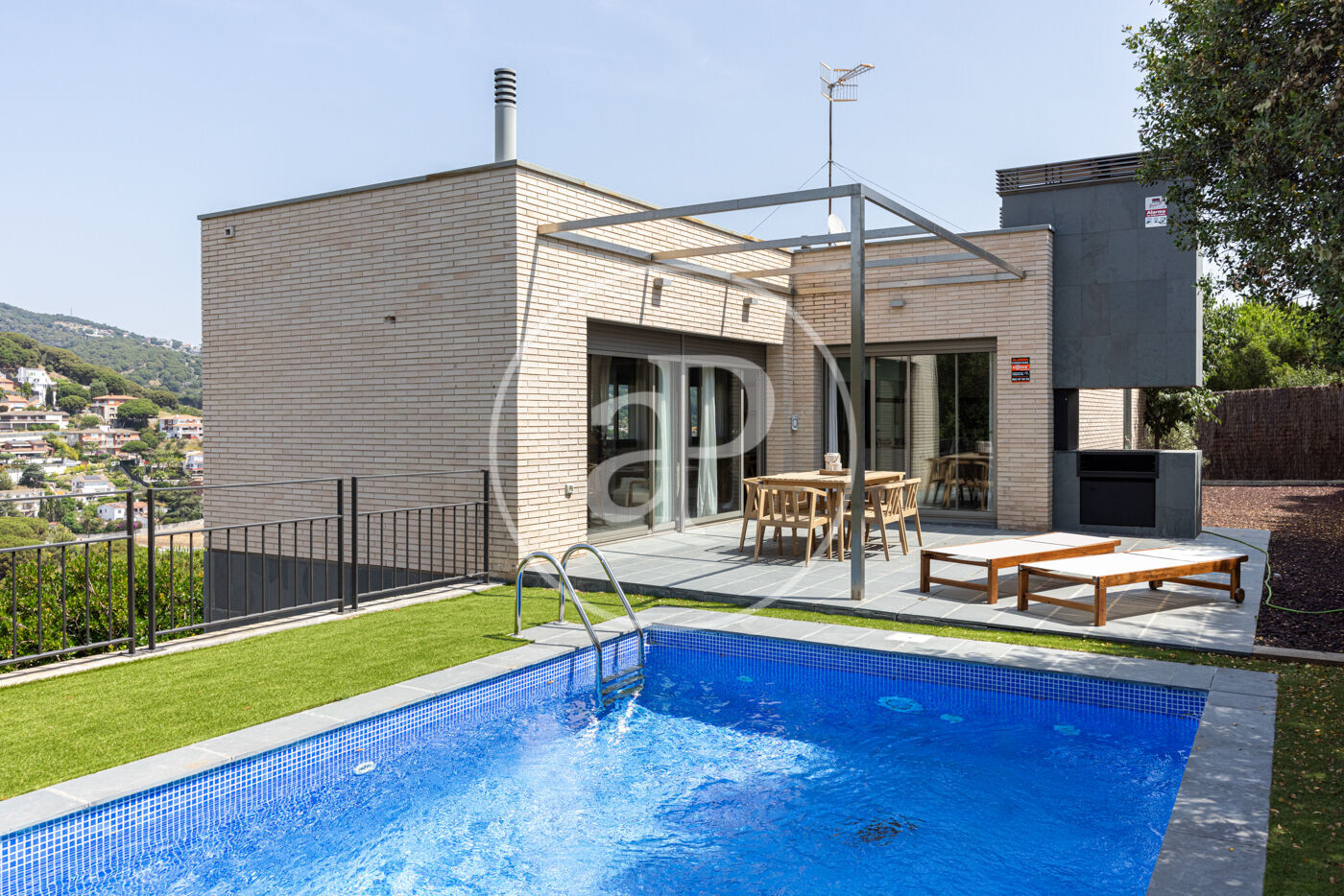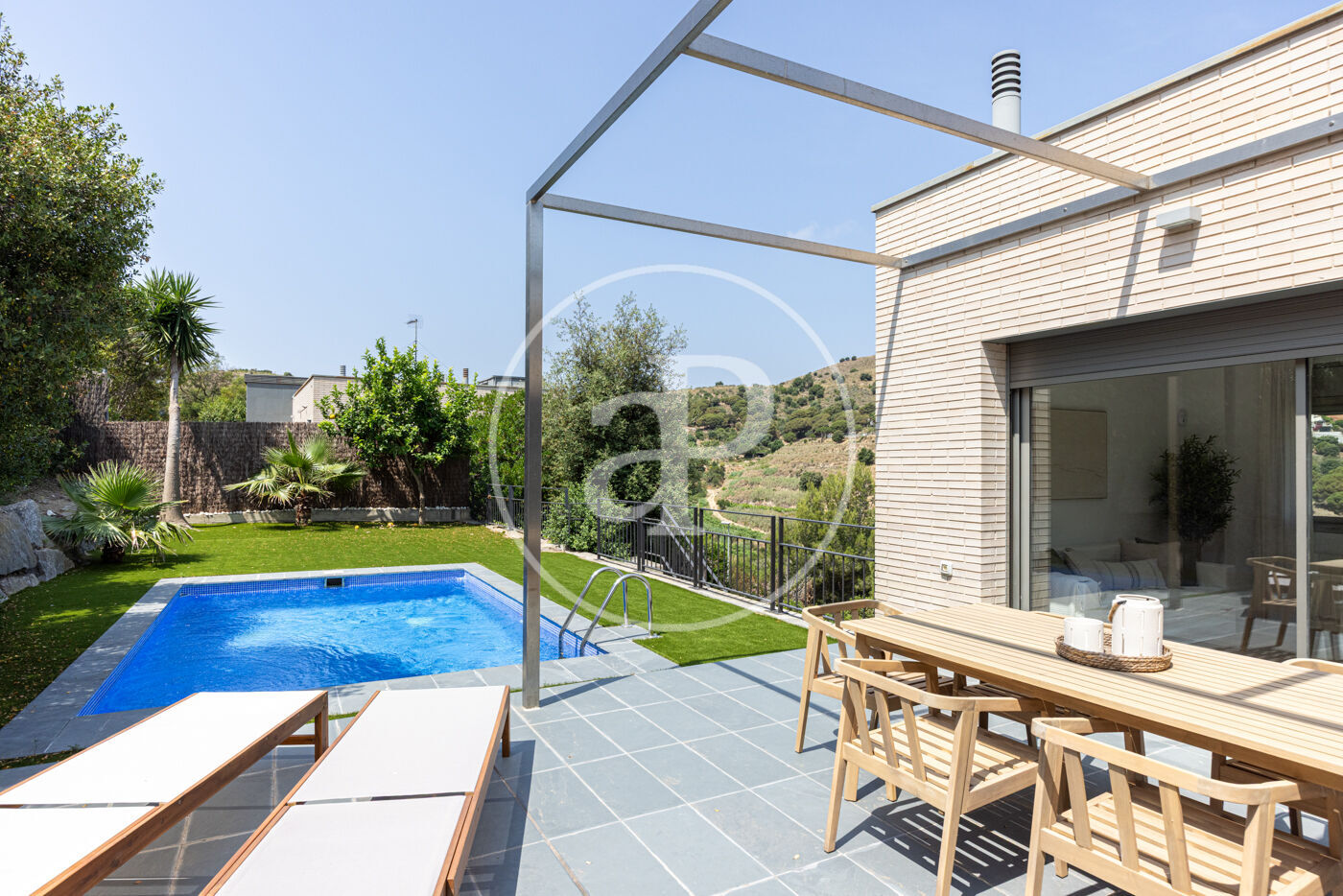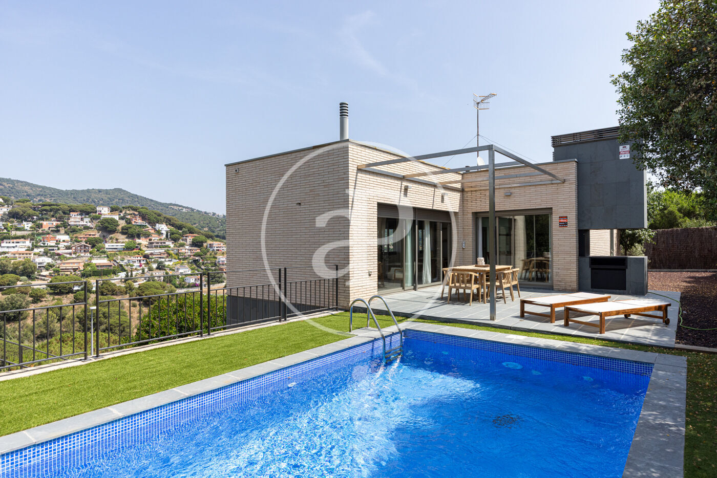 En el exterior, la casa cuenta con un jardín privado, una piscina ideal para disfrutar del clima mediterráneo y una zona de barbacoa para reuniones al aire libre. Las vistas a la montaña brindan un entorno tranquilo y exclusivo.