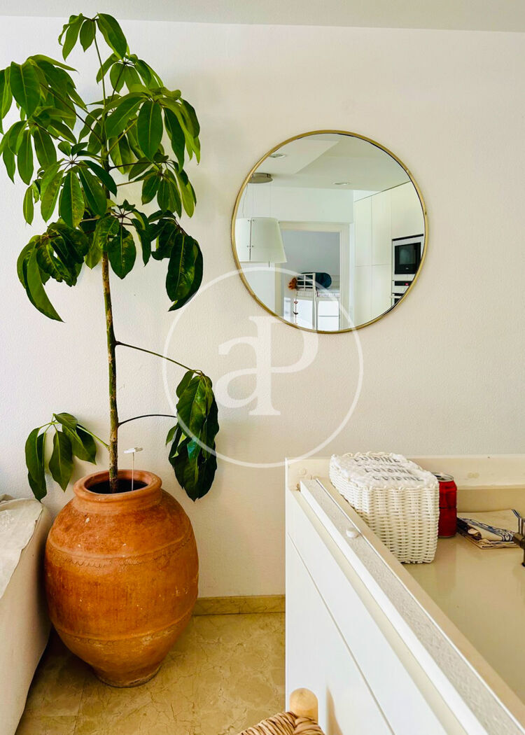 Desde la puerta de entrada a la vivienda accedemos a un acogedor salón-comedor con salida a una terraza muy agradable y espaciosa con vistas al mar, al jardín y a la piscina. La cocina,integrada en el salón ,se encuentra completamente amueblada y equipada. Dispone de una zona de coladuría independiente y un pequeño cuarto ideal para utilizarlo de habitación de servicio o cuarto de plancha.