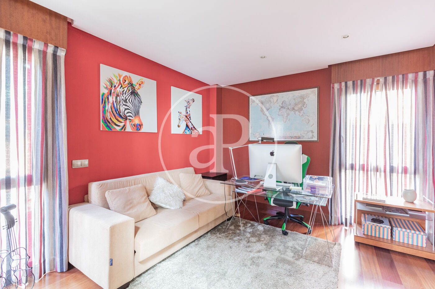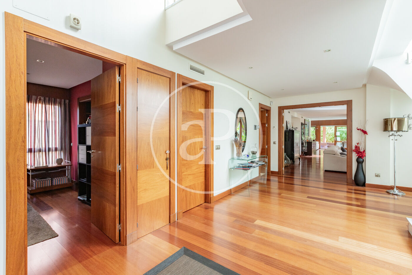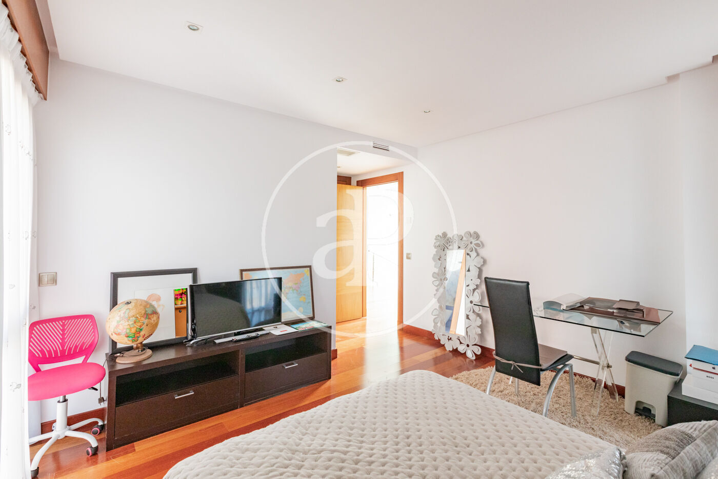 Primera planta: - Habitación principal en suite, amplia y luminosa, con grandes ventanales, doble vestidor,doble baño y jacuzzi. - Dos habitaciones secundarias en suite con armarios empotrados. Segunda Planta: - Buhardilla de aproximadamente 90 m² con techos de doble altura, baño completo y terraza. Actualmente, está habilitada como salón de cine y despacho.