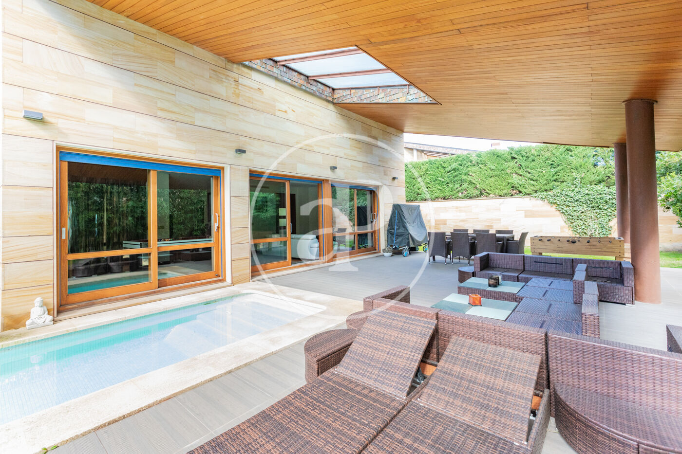 • Amplio espacio exterior: la parcela rodea la casa, contando con una pared de bambú de 12 metros de altura en la zona frontal, jardín, piscina y una zona solada con barbacoa, ideal para disfrutar de momentos al aire libre.