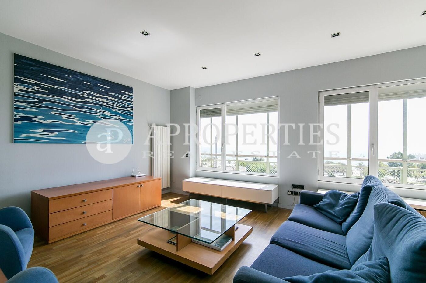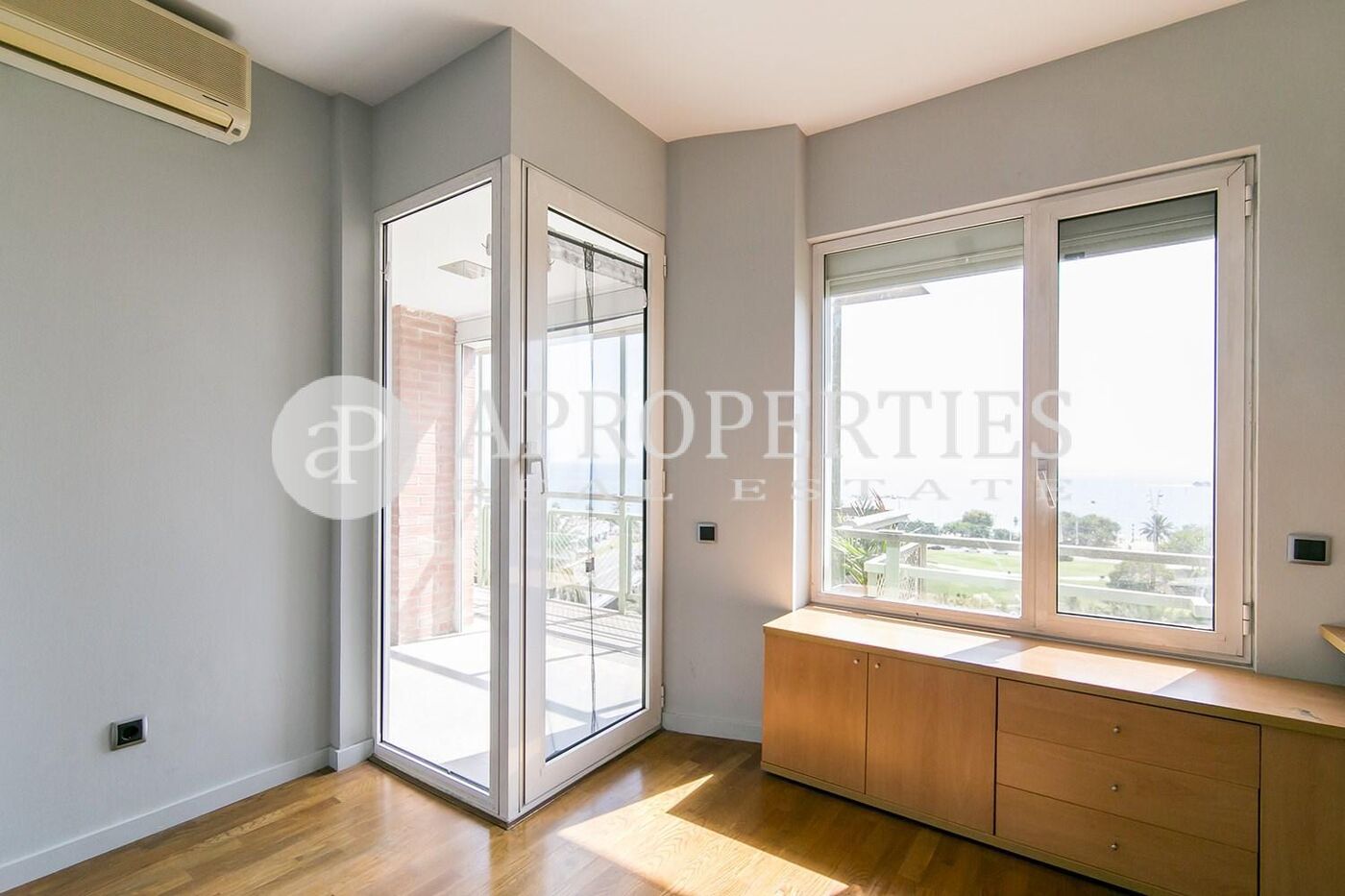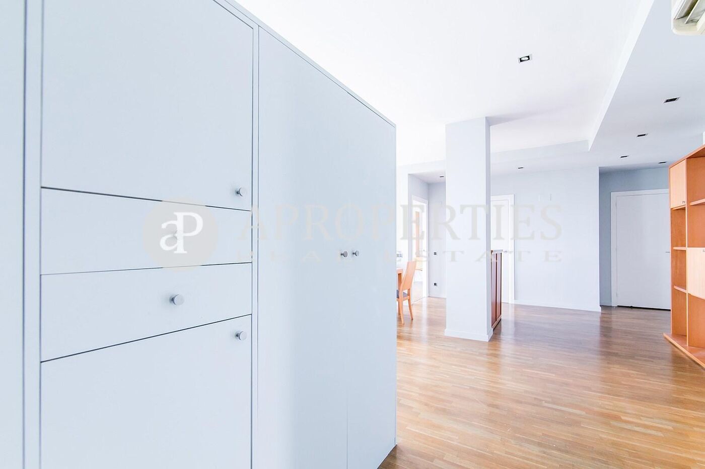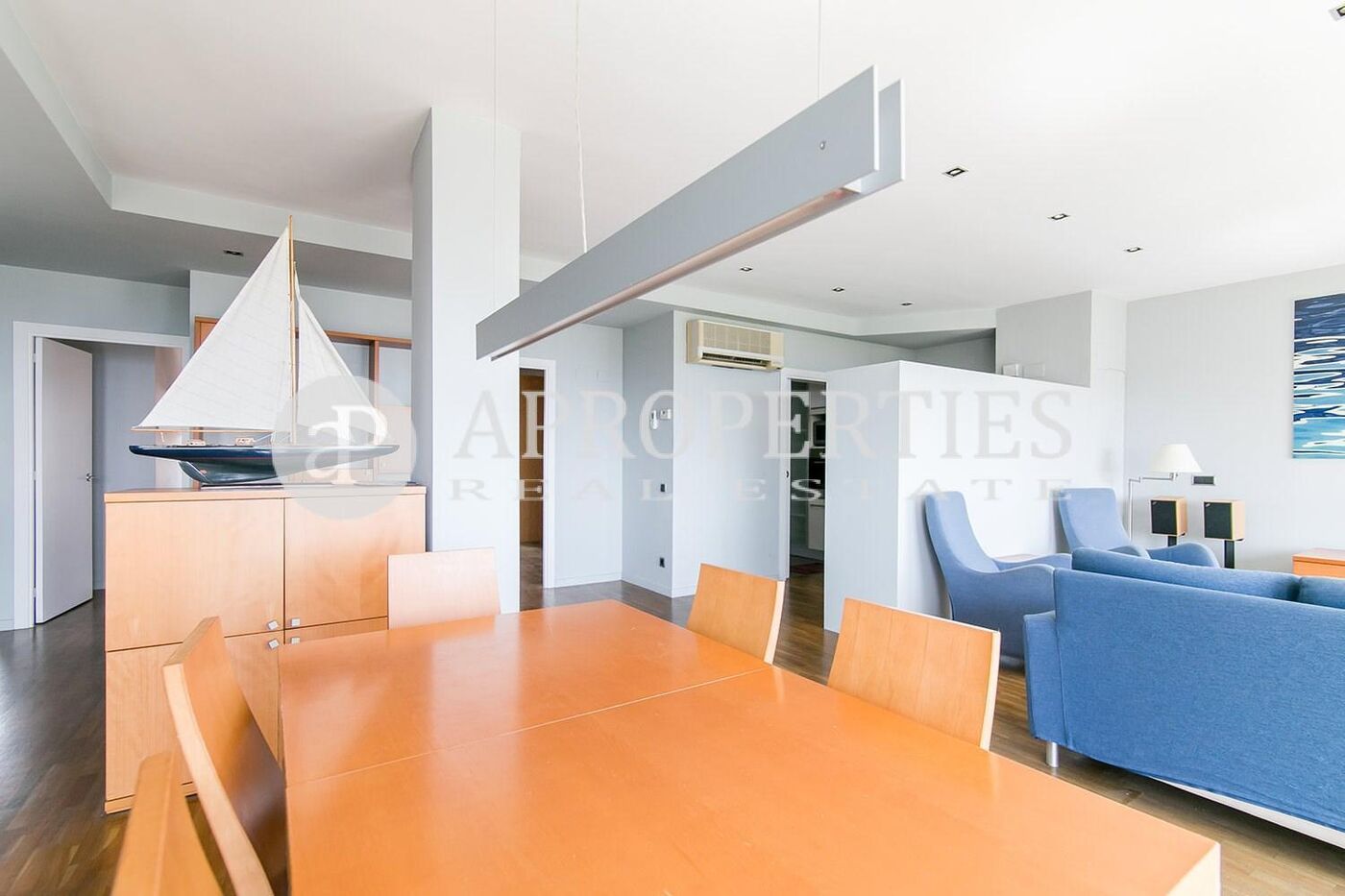 En primera línea de mar con espectaculares vistas al mar, se encuentra este piso semi-amueblado en la Villa Olímpica, totalmente exterior, rodeado de jardines y parques, muy bien comunicado con la Ronda Litoral, autobuses y transporte público. Piso alto exterior de 140 m2 con tres dormitorios; dos dobles con vistas al Tibidabo, armarios empotrados, salida a un balcón, y dos baños. La entrada recibidor conduce al salón-comedor de 40m2 con salida a una terraza de 8m2 con espectaculares vistas al mar y una habitación polivalente con armario, actualmente acondicionada como estudio con salida a la terraza. Suelos de parquet, cocina office equipada y zona de aguas. Calefacción y aire acondicionado y una plaza doble de parking. Vigilancia 24 horas. Reformado en 2005.