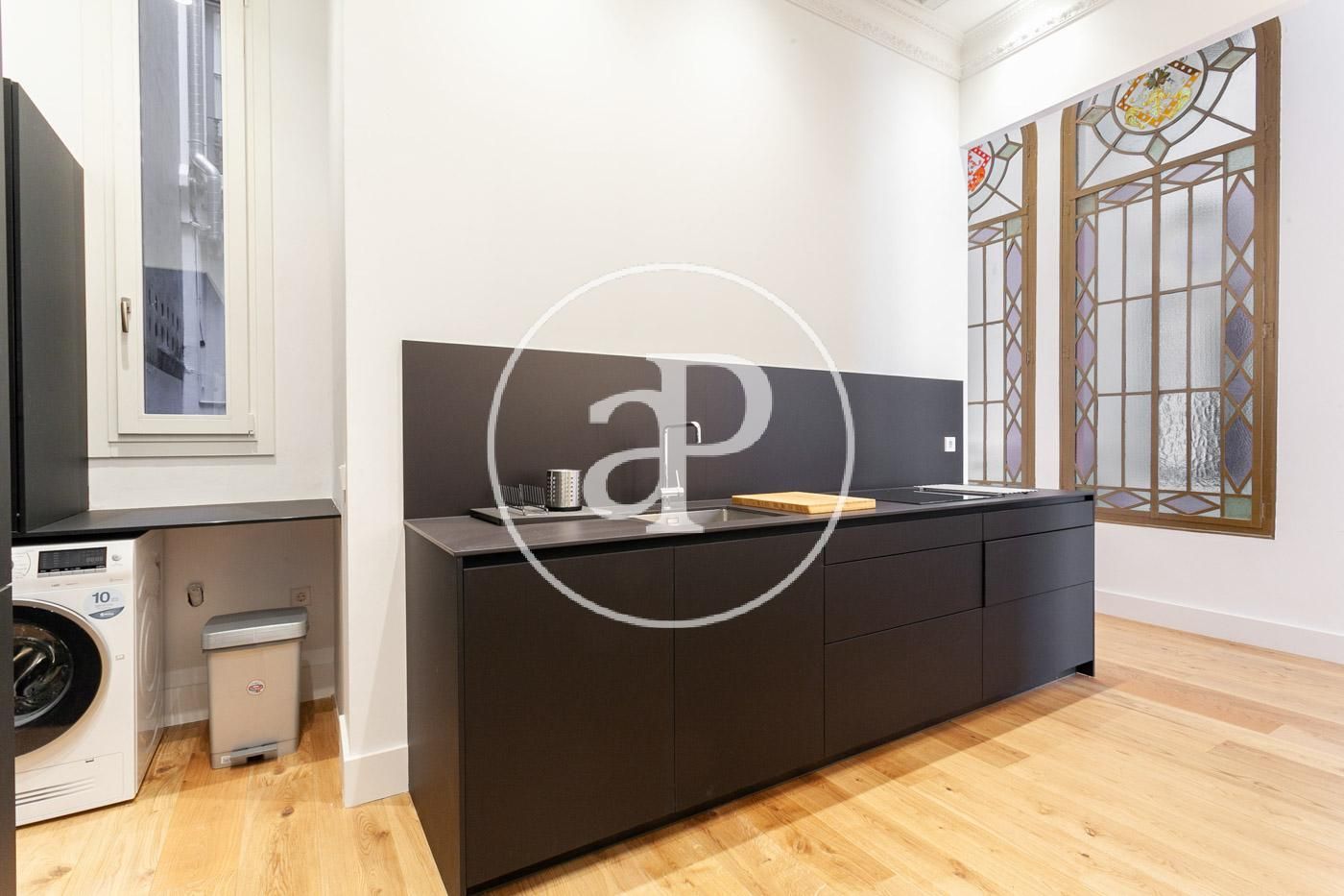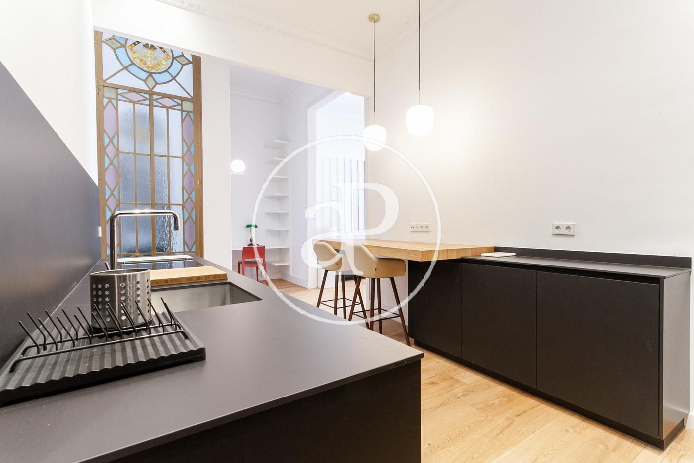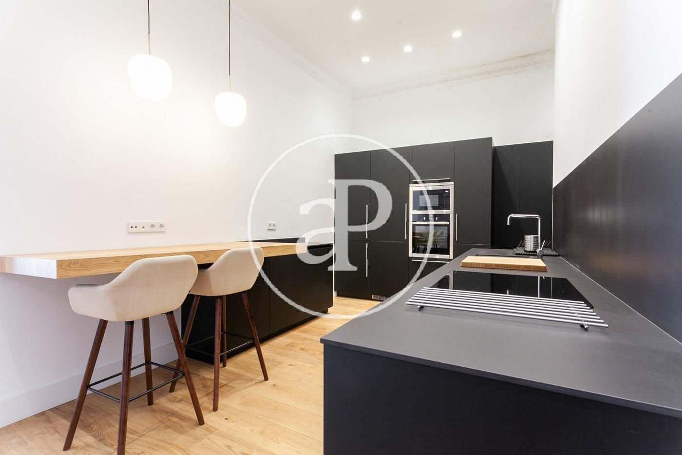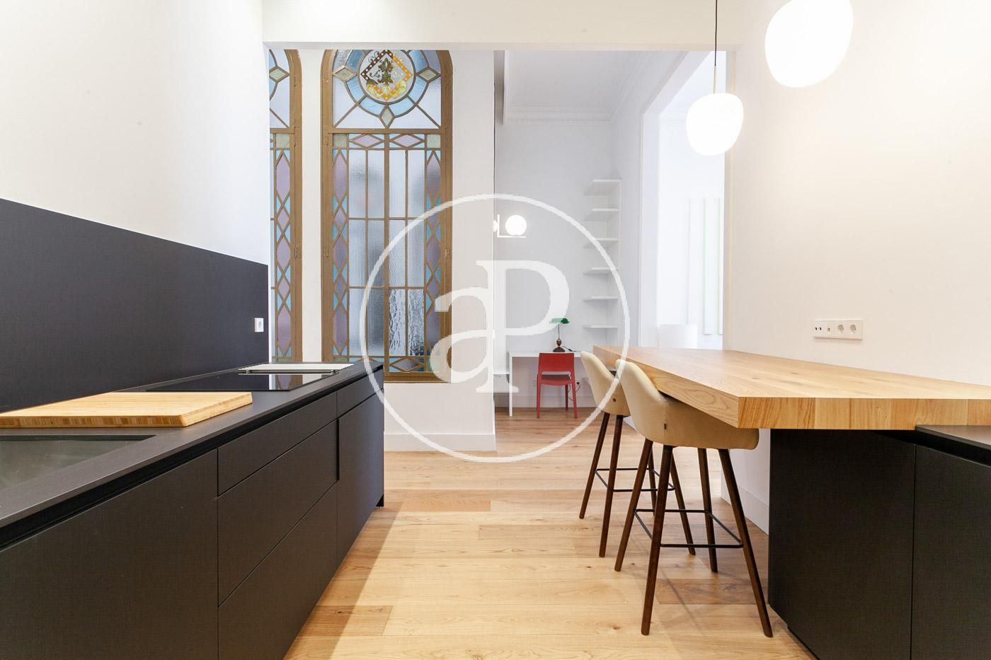En un fantástico emplazamiento perteneciente al entorno protegido de conservación de L´Eixample Esquerra, encontramos esta magnífica vivienda modernista, reformada y a estrenar. Se encuentra ubicado en una quinta planta real de una hermosa finca modernista del año 1895 con una representativa escalera de mármol con barandilla de madera noble y con ascensor. El Ático es exterior y pasante y por la disposición de sus estancias y altura disfruta de una vibrante luz natural. Está orientado por un lado a un tranquilo patio de manzana con vistas abiertas desde sus balcones, recibiendo sol de tarde y por el otro lado, con una galería a la calle con grandes ventanas aisladas 100% acústica y térmicamente, con sol de mañana Cuenta con 155 m2 construidos, contabilizando unos 3m2 en sus dos balcones, distribuidos de la siguiente forma. La gran estancia de día, correspondiente a la fachada principal contiene una galería con espacio para generar un segundo estar o sala de lectura y se encuentra comunicado con el salón comedor principal y la cocina abierta, totalmente equipada con mobiliario de diseño y electrodomésticos de alta gama, encontrando frente a ella un aseo de cortesía muy amplio con espacio de guardado y zona de lavadero. La zona de noche es reservada a la parte interior, con un gran dormitorio doble con espacio para vestidor y baño completo y buscando la máxima tranquilidad del patio de manzana, encontramos la impresionante master suite con un muy completo espacio para vestidor, dressoire o escritorio y un espacioso baño completo, con detalle de pica doble y moderna bañera exenta con patas asemejando las de época. Dispone de un trastero de 5m2 en el terrado del edificio. El diseño es muy cuidado y plagado de detalles, recuperando todos los elementos originales modernistas como los suelos hidráulicos, cristales emplomados, volta catalana, techo de ladrillos, techos artesonados, carpintería exterior e interior, muros de obra vista, amalgamando así, la convivencia de los mismos con materiales e instalaciones nuevas de una alta calidad, con marcas reconocidas internacionalmente como Bosch, Grohe, Fujitsu. La reforma consigue devolver el carácter original tan preciado de la época, restaurando todos sus elementos antiguos y utilizando acabados y materiales que reproducen los originales, así como también su distribución, genera espacios diáfanos y amplios, aprovechando al máximo la luz natural y potenciando la transparencia entre los diferentes espacios. ¡Contacta hoy con nosotros para visitar este exclusivo piso de L’Eixample!