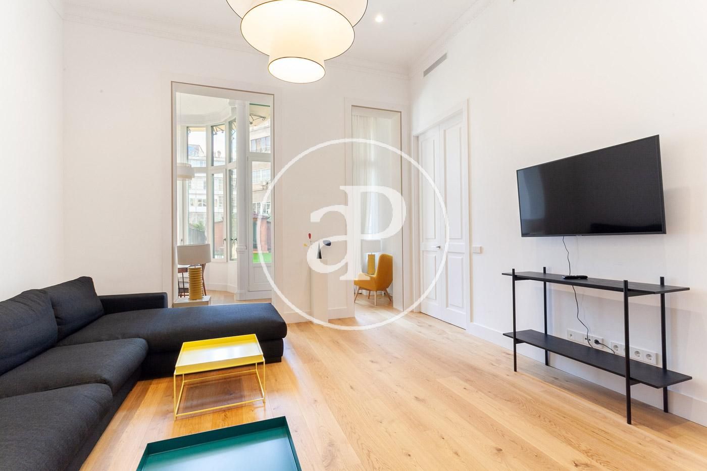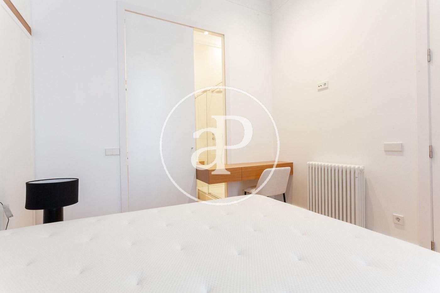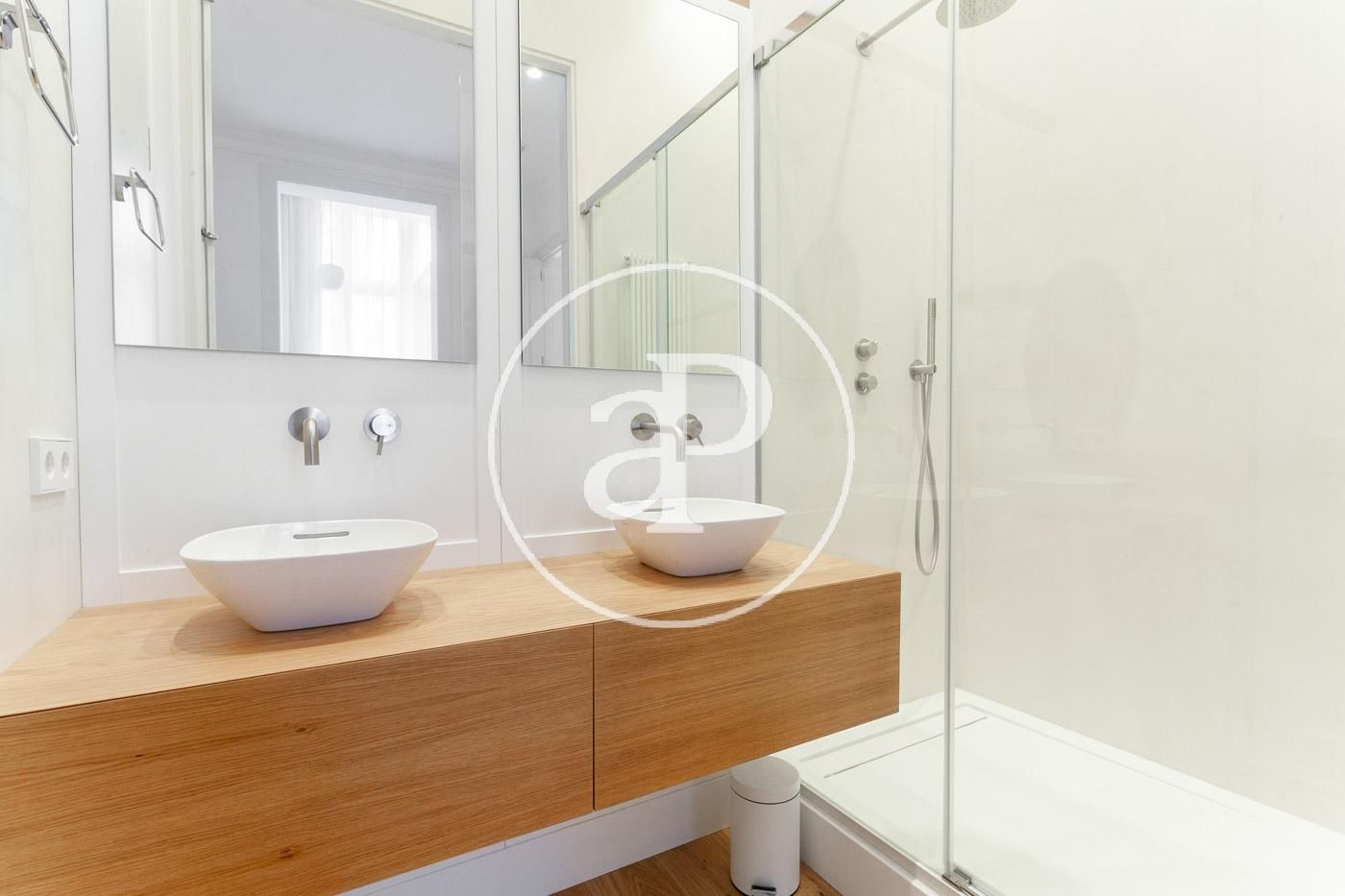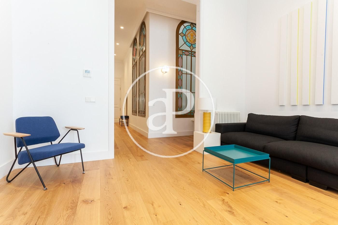 En un fantástico emplazamiento perteneciente al entorno protegido de conservación de L´Eixample Esquerra, encontramos esta magnífica vivienda modernista, reformada y a estrenar. Se encuentra ubicado en una quinta planta real de una hermosa finca modernista del año 1895 con una representativa escalera de mármol con barandilla de madera noble y con ascensor. El Ático es exterior y pasante y por la disposición de sus estancias y altura disfruta de una vibrante luz natural. Está orientado por un lado a un tranquilo patio de manzana con vistas abiertas desde sus balcones, recibiendo sol de tarde y por el otro lado, con una galería a la calle con grandes ventanas aisladas 100% acústica y térmicamente, con sol de mañana Cuenta con 155 m2 construidos, contabilizando unos 3m2 en sus dos balcones, distribuidos de la siguiente forma. La gran estancia de día, correspondiente a la fachada principal contiene una galería con espacio para generar un segundo estar o sala de lectura y se encuentra comunicado con el salón comedor principal y la cocina abierta, totalmente equipada con mobiliario de diseño y electrodomésticos de alta gama, encontrando frente a ella un aseo de cortesía muy amplio con espacio de guardado y zona de lavadero. La zona de noche es reservada a la parte interior, con un gran dormitorio doble con espacio para vestidor y baño completo y buscando la máxima tranquilidad del patio de manzana, encontramos la impresionante master suite con un muy completo espacio para vestidor, dressoire o escritorio y un espacioso baño completo, con detalle de pica doble y moderna bañera exenta con patas asemejando las de época. Dispone de un trastero de 5m2 en el terrado del edificio. El diseño es muy cuidado y plagado de detalles, recuperando todos los elementos originales modernistas como los suelos hidráulicos, cristales emplomados, volta catalana, techo de ladrillos, techos artesonados, carpintería exterior e interior, muros de obra vista, amalgamando así, la convivencia de los mismos con materiales e instalaciones nuevas de una alta calidad, con marcas reconocidas internacionalmente como Bosch, Grohe, Fujitsu. La reforma consigue devolver el carácter original tan preciado de la época, restaurando todos sus elementos antiguos y utilizando acabados y materiales que reproducen los originales, así como también su distribución, genera espacios diáfanos y amplios, aprovechando al máximo la luz natural y potenciando la transparencia entre los diferentes espacios. ¡Contacta hoy con nosotros para visitar este exclusivo piso de L’Eixample!