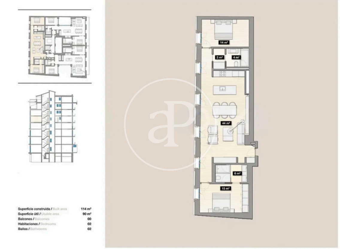 La zona de día ofrece un gran salón-comedor con cocina abierta, moderna y equipada con electrodomésticos de alta gama, ideal para quienes valoran el diseño y la practicidad. La zona de noche se compone de una espectacular suite principal con baño privado y una segunda habitación doble, acompañada de un segundo baño completo que también sirve a las visitas.