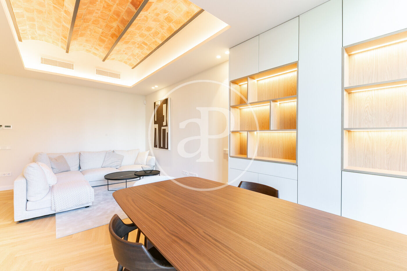 La decoración ha sido cuidada al más mínimo detalle: los techos conservan la típica volta catalana que aporta carácter, combinada con muebles de diseño contemporáneo en tonos neutros que potencian una sensación de calma y amplitud. La iluminación indirecta crea un ambiente acogedor y elegante. La vivienda dispone además de aire acondicionado por conductos frío/calor, conexión Wi‑Fi y alarma.