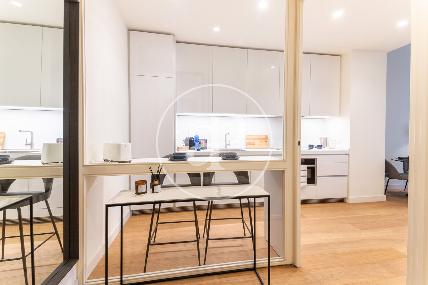 Accedemos a la vivienda por el hall de la entrada y accedemos a la zona de día que se compone de cocina americana de diseño completamente equipada con electrodomésticos Neff de alta gama abierta al gran salón comedor que tiene salida a uno de los balcones.