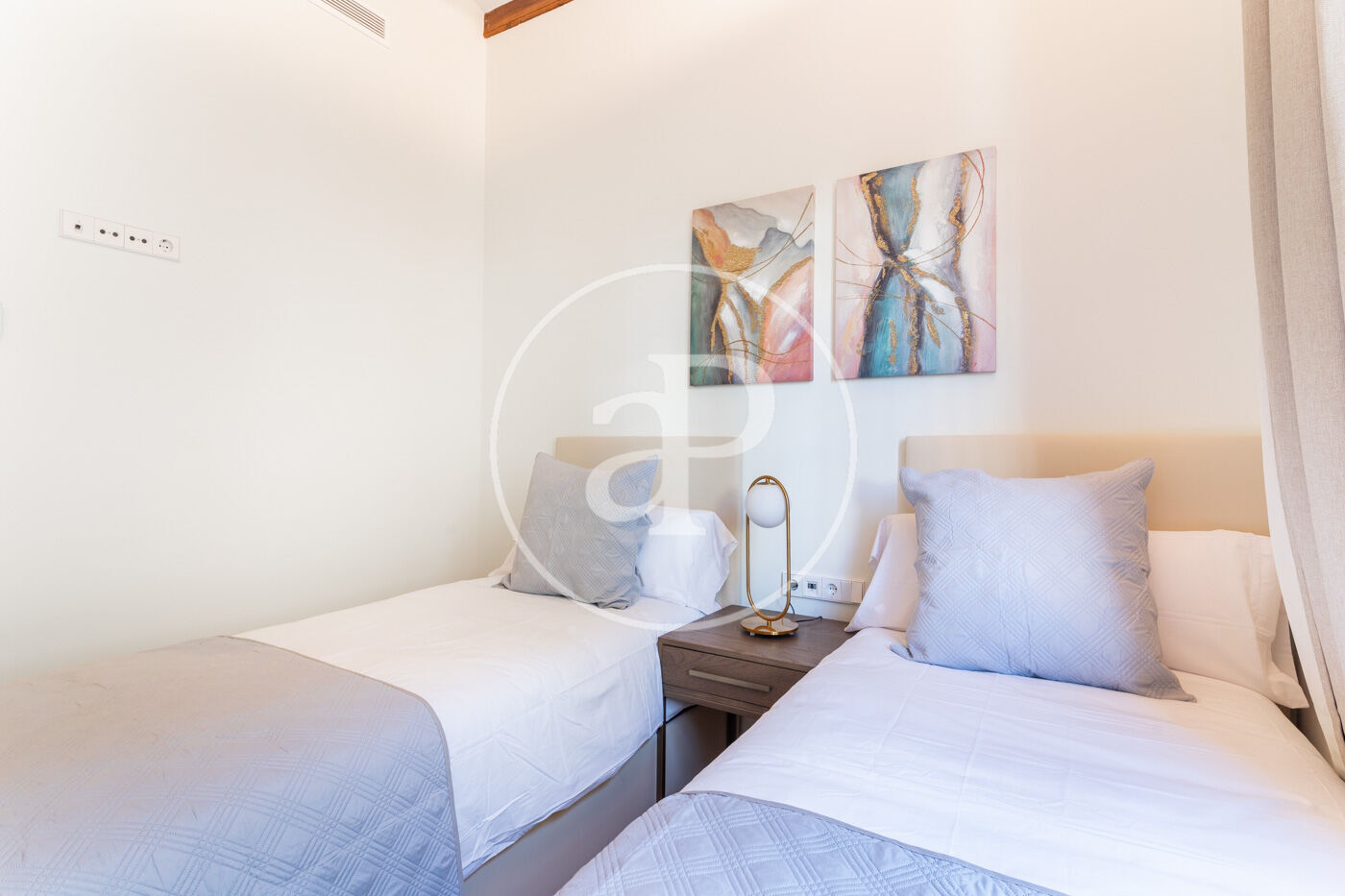 Esta vivienda está decorada con un gusto exquisito y combina suelos de roble de lama larga, techos altos con vigas de madera, mantiene los cerramientos de madera con doble cristal para aislar del exterior y dispone de aire acondicionado frío/calor por conductos en toda la vivienda.