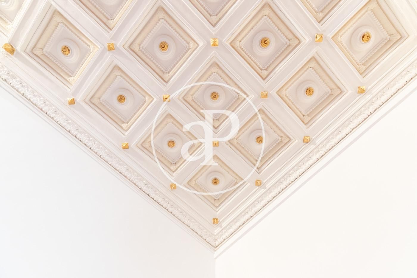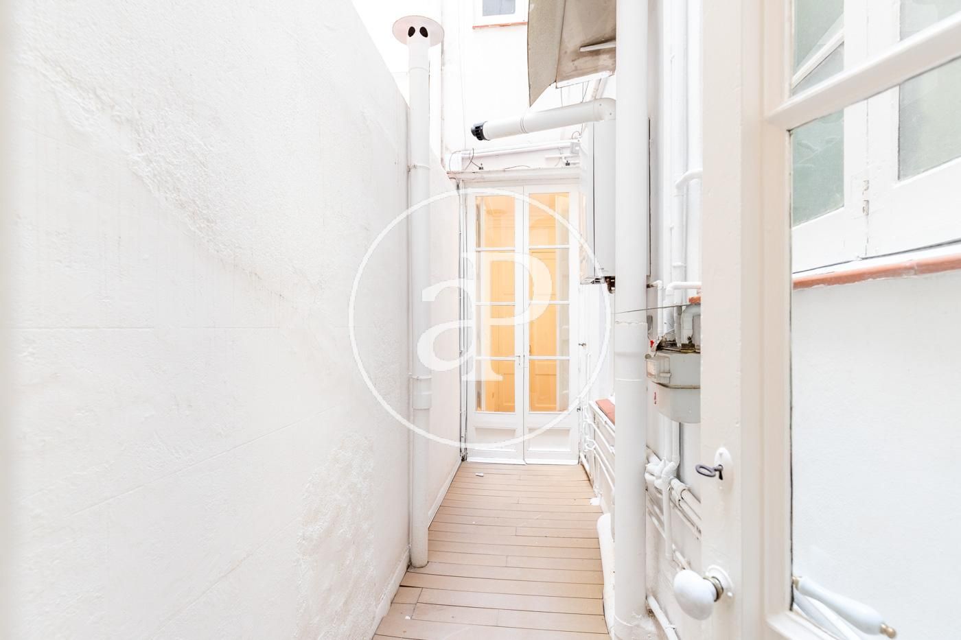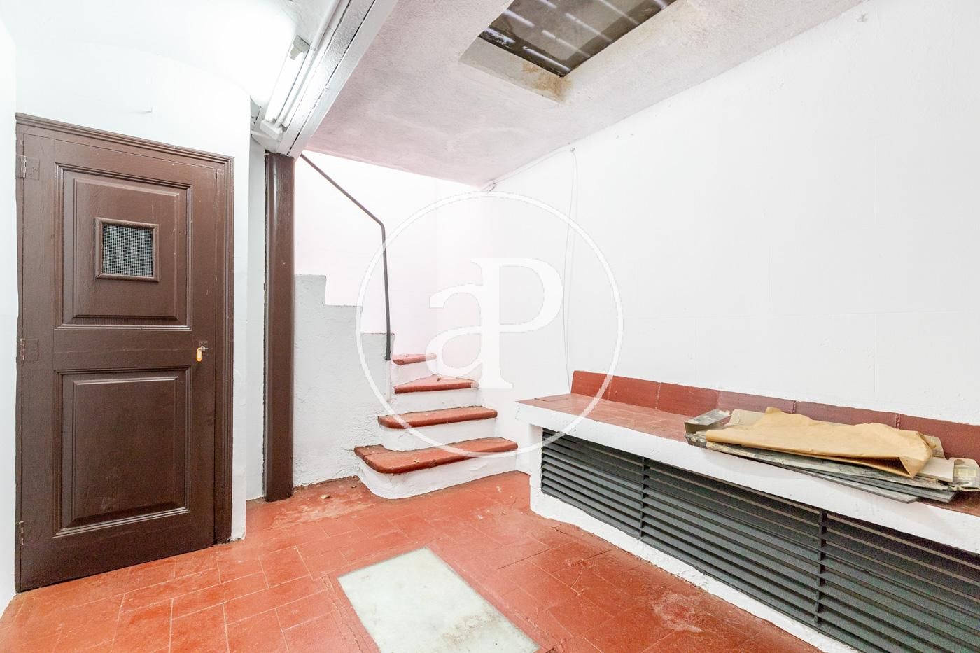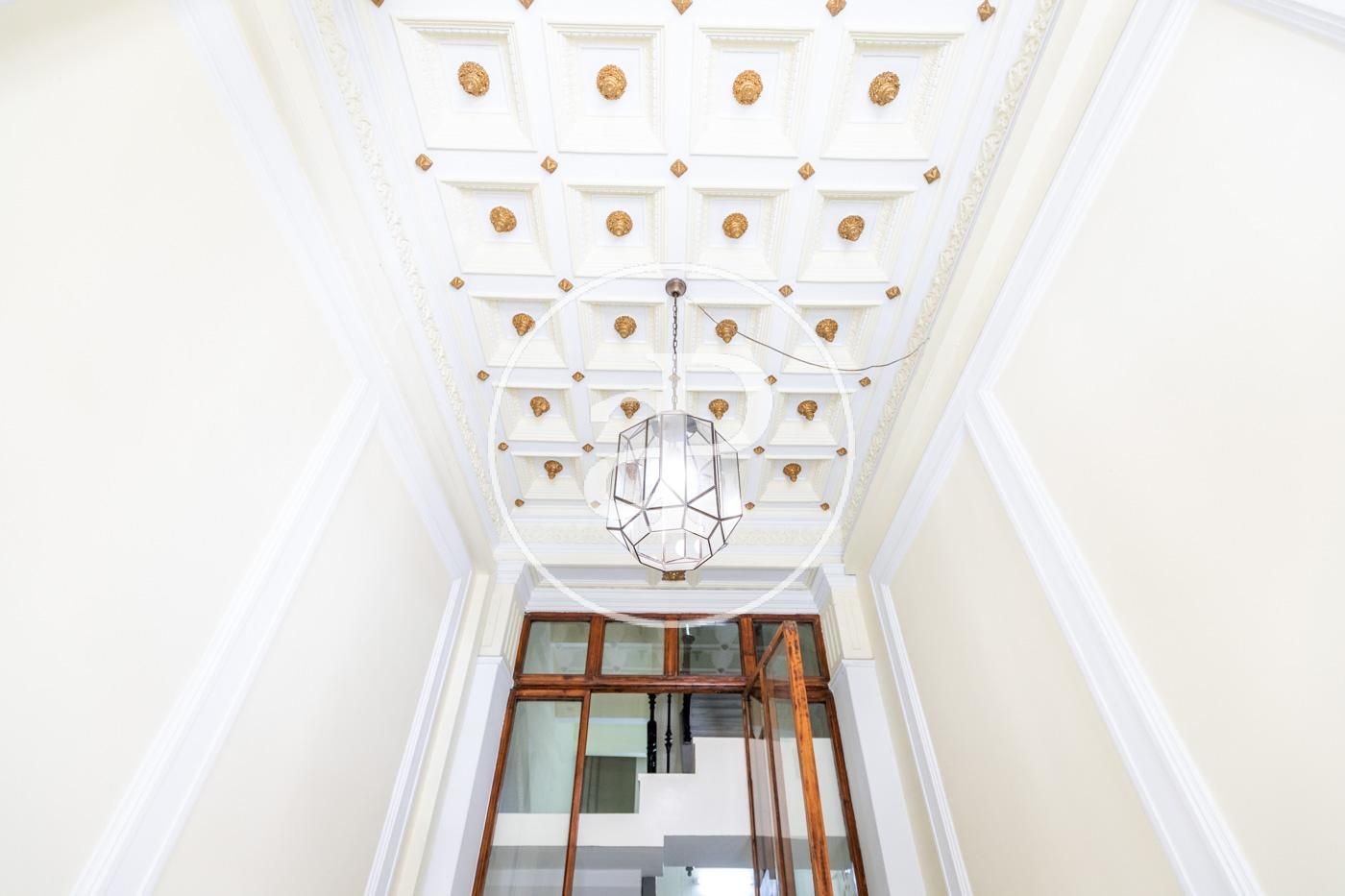 Accedemos directamente a un gran hall de entrada que da paso a una amplísima zona de salón –comedor en dos ambientes, con maravillosos techos artesonados y vitrales modernistas muy bien rehabilitados y con acceso a una pequeña pero agradable terracita.