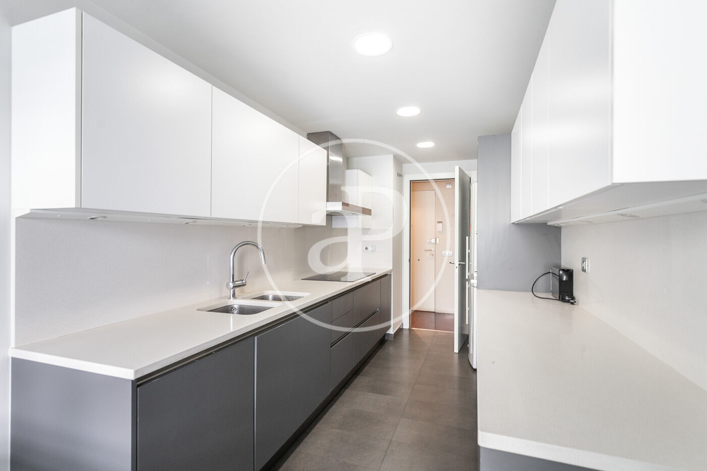 La cocina equipada con electrodomésticos de gama alta cuanta con una pequeña zona de office y salida directa a la terraza, por lo que disfruta de mucha luz, delante encontramos una zona independiente de aguas, que le da una parte muy práctica a la distribución del piso.