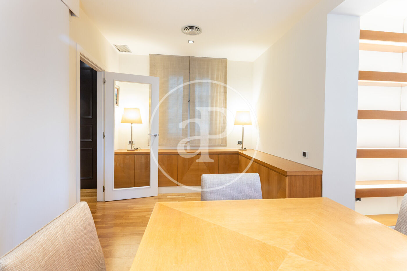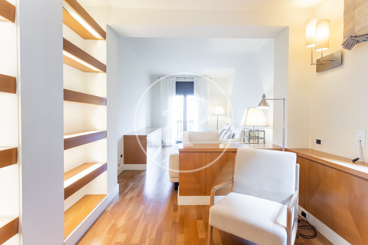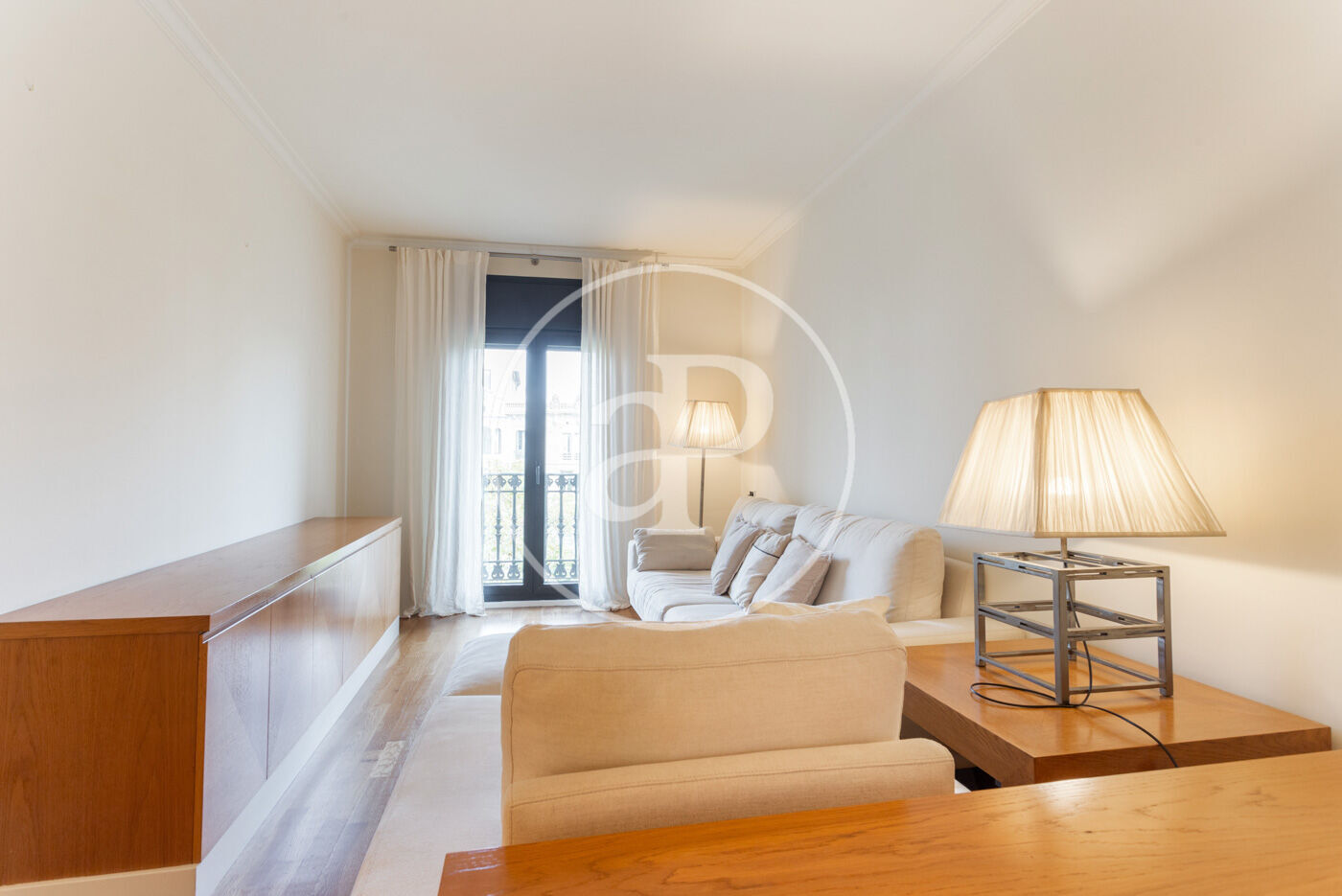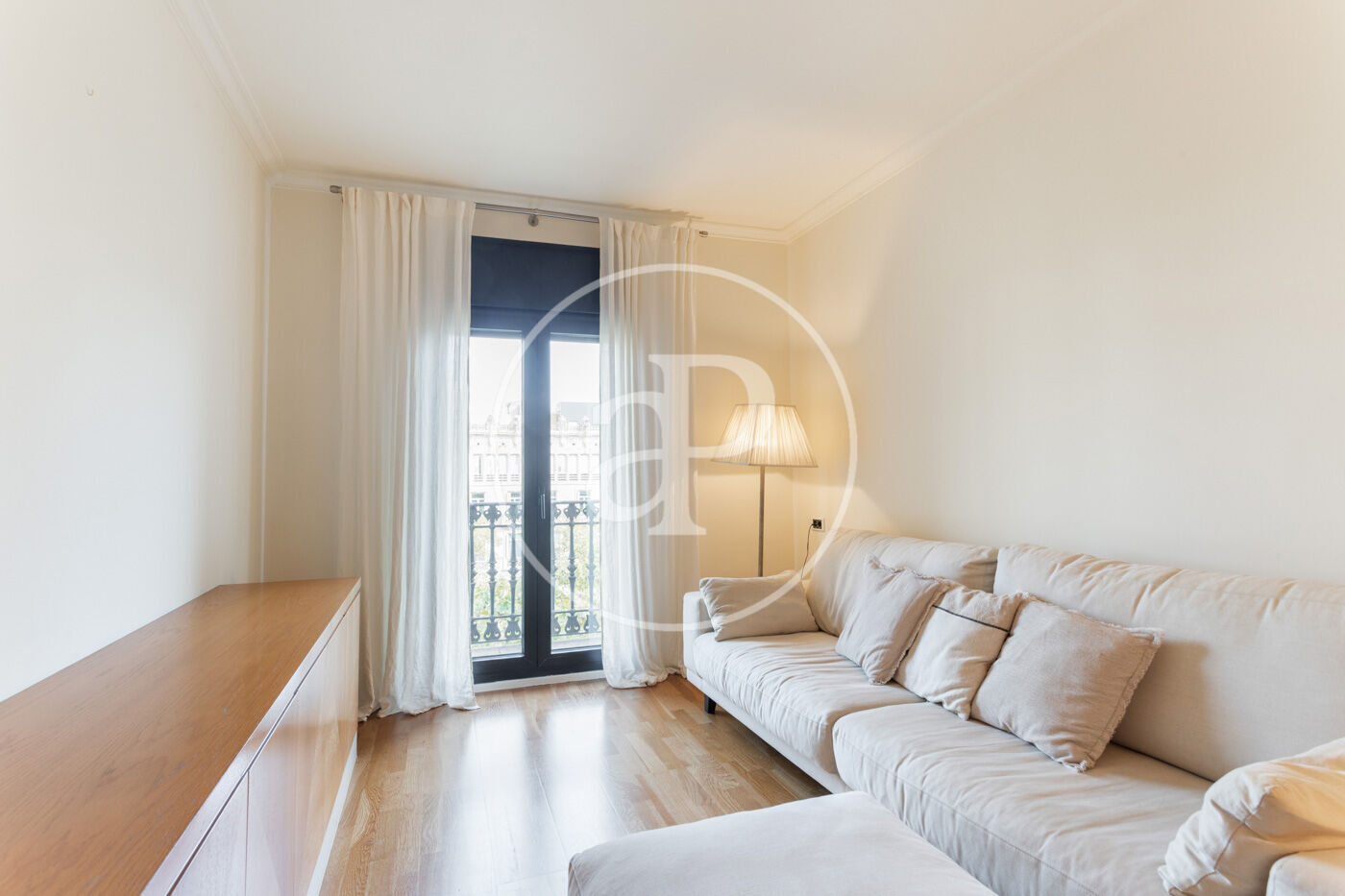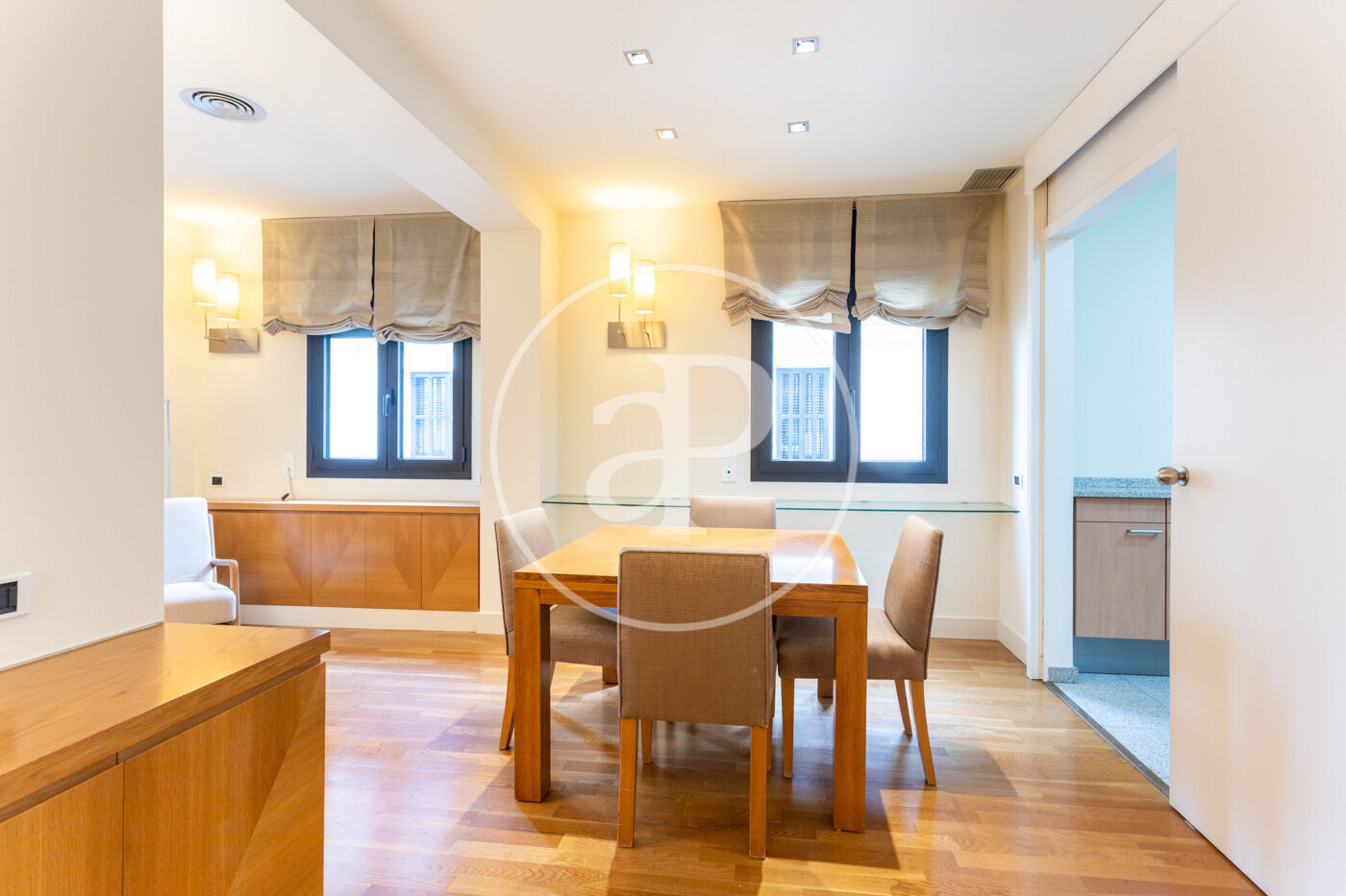 Este piso luminoso tiene 90 m², totalmente amueblado y equipado. Armarios empotrados, zona de aguas, balconcito a paseo de gracia y todo exterior. Aire acondicionado y calefacción por conductos, por todo el piso.