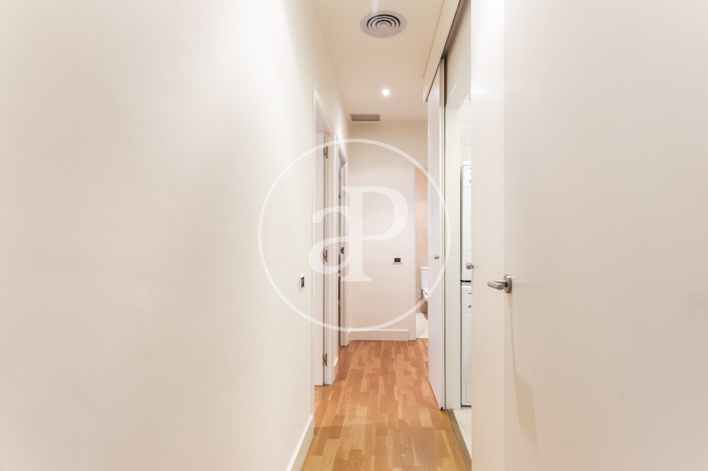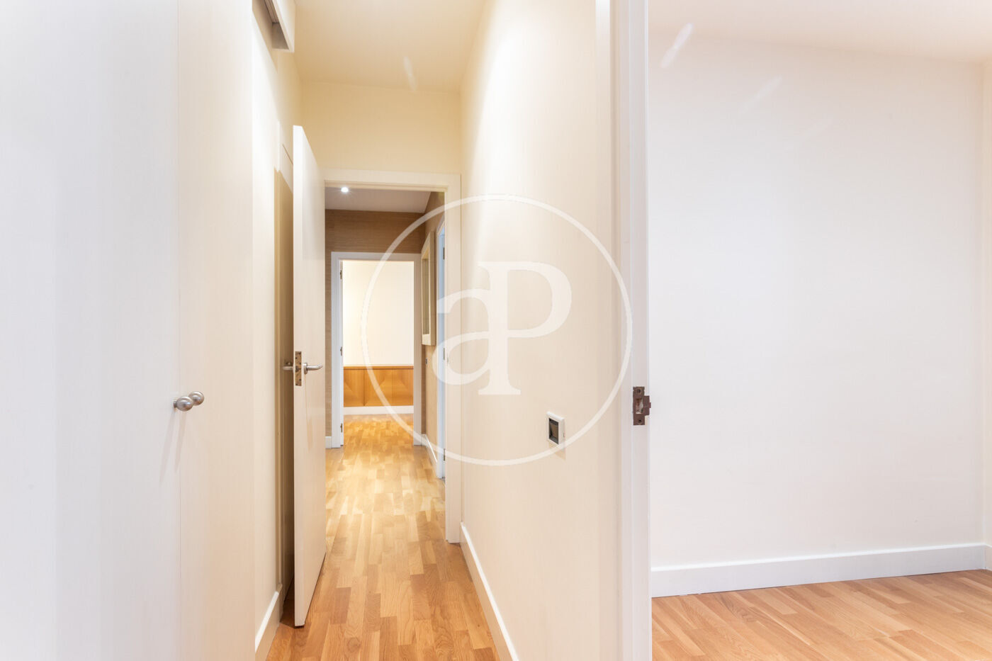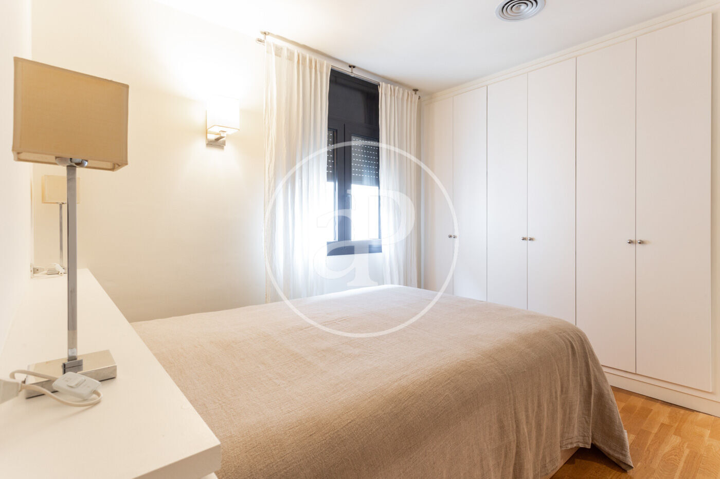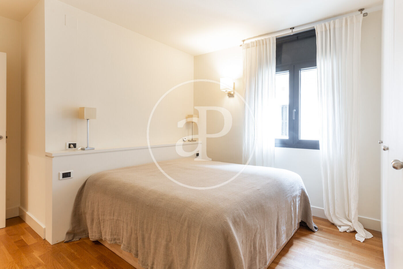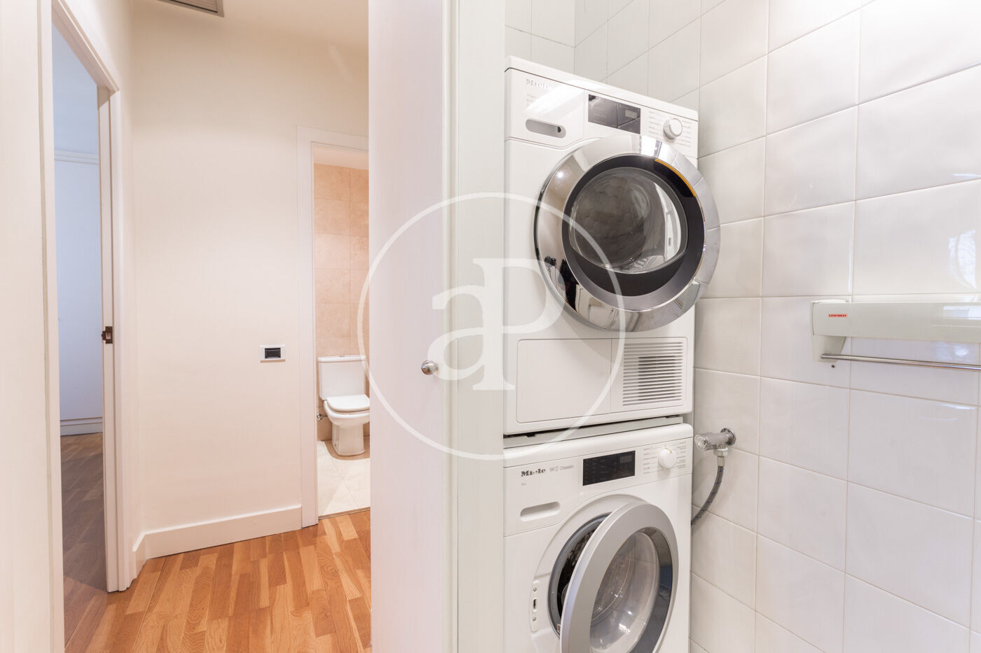 Este piso luminoso tiene 90 m², totalmente amueblado y equipado. Armarios empotrados, zona de aguas, balconcito a paseo de gracia y todo exterior. Aire acondicionado y calefacción por conductos, por todo el piso.