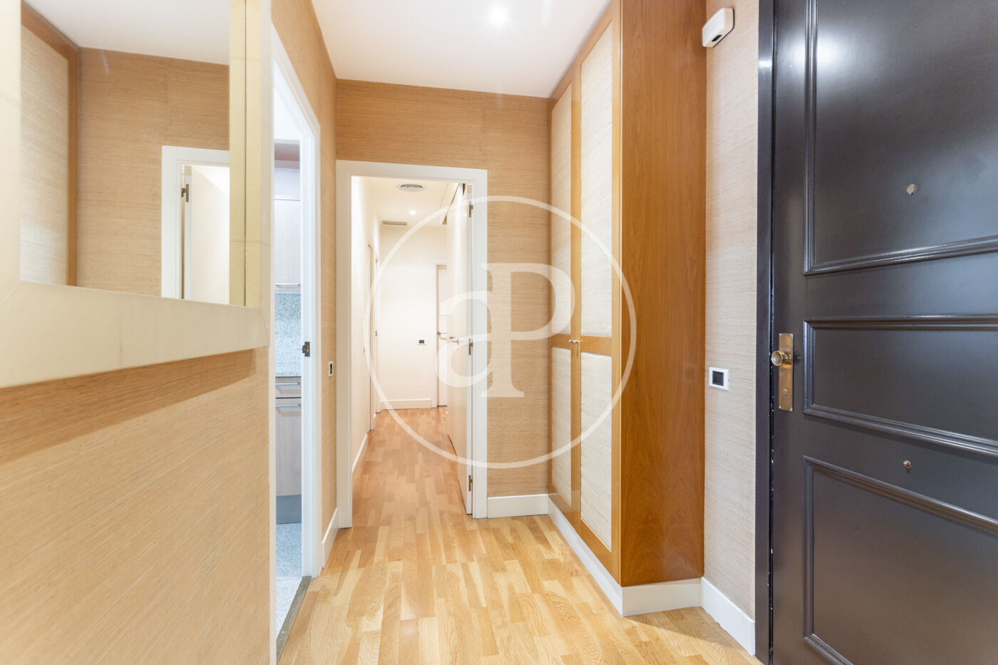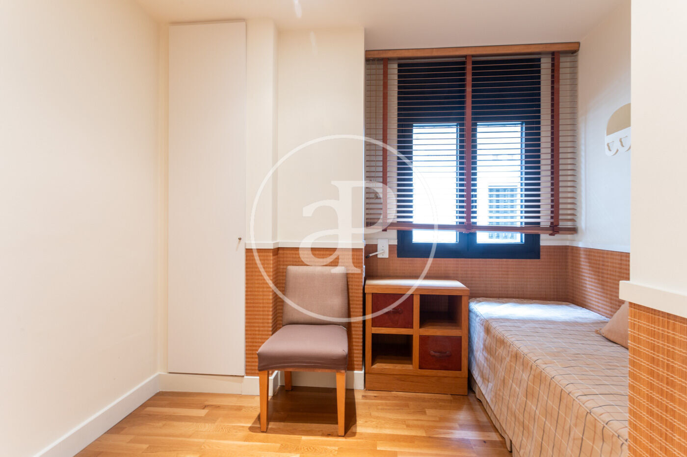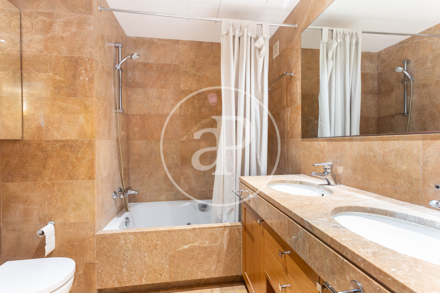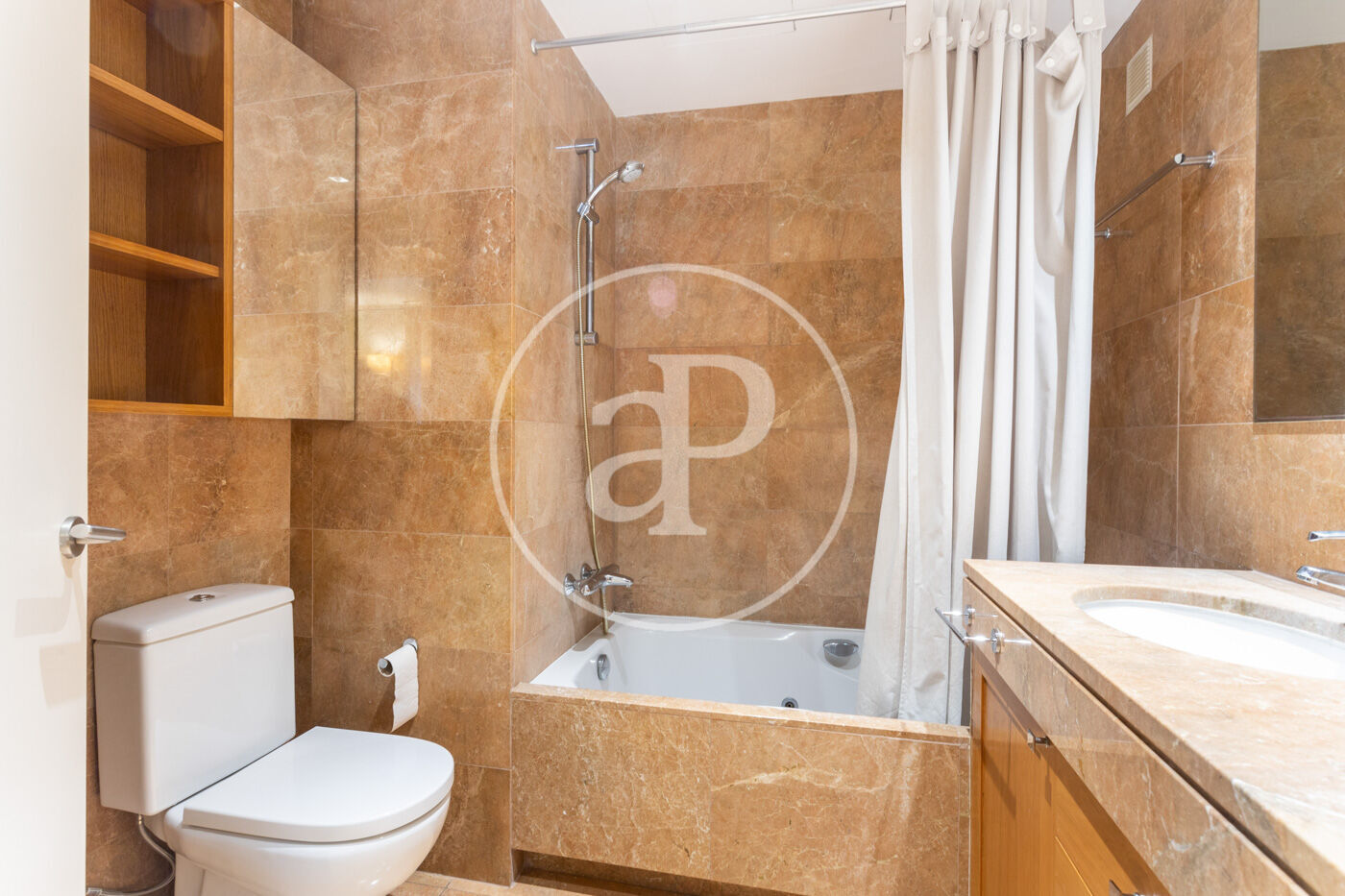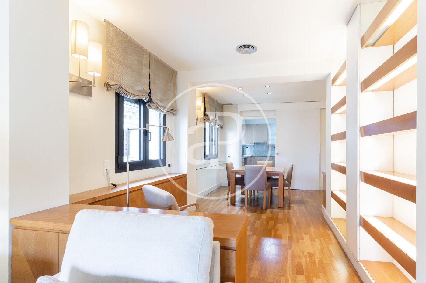 Este piso luminoso tiene 90 m², totalmente amueblado y equipado. Armarios empotrados, zona de aguas, balconcito a paseo de gracia y todo exterior. Aire acondicionado y calefacción por conductos, por todo el piso.