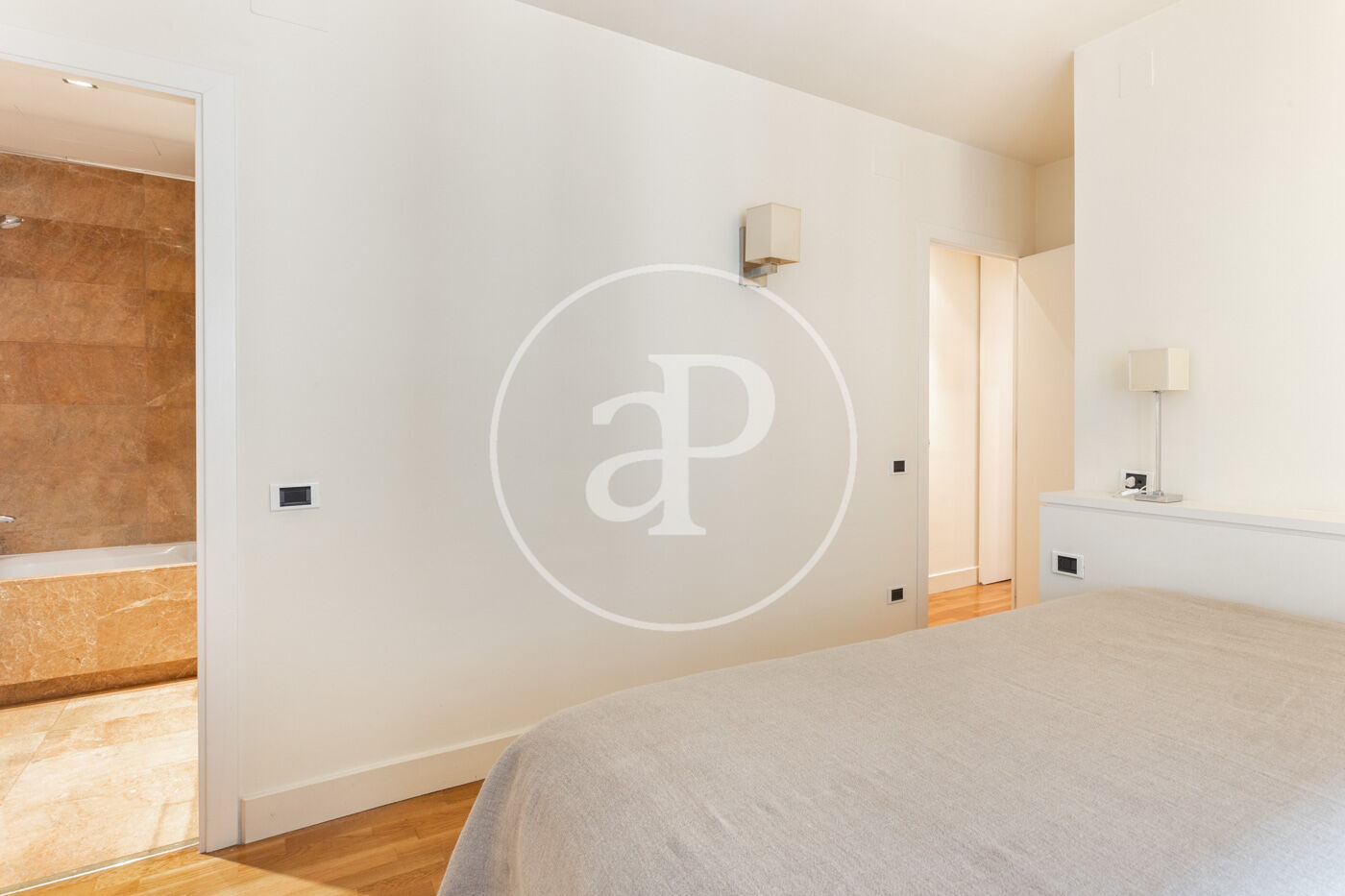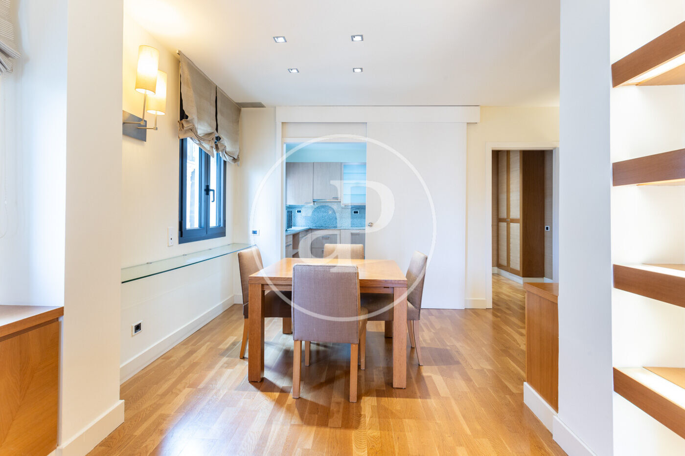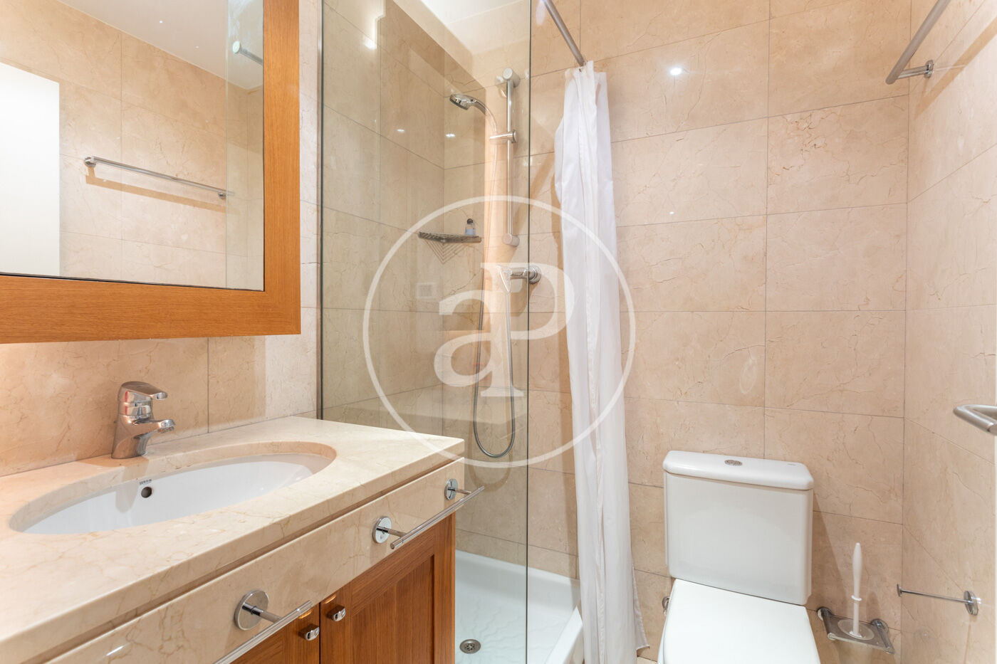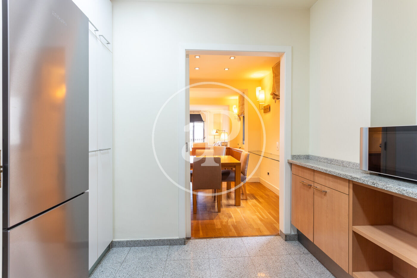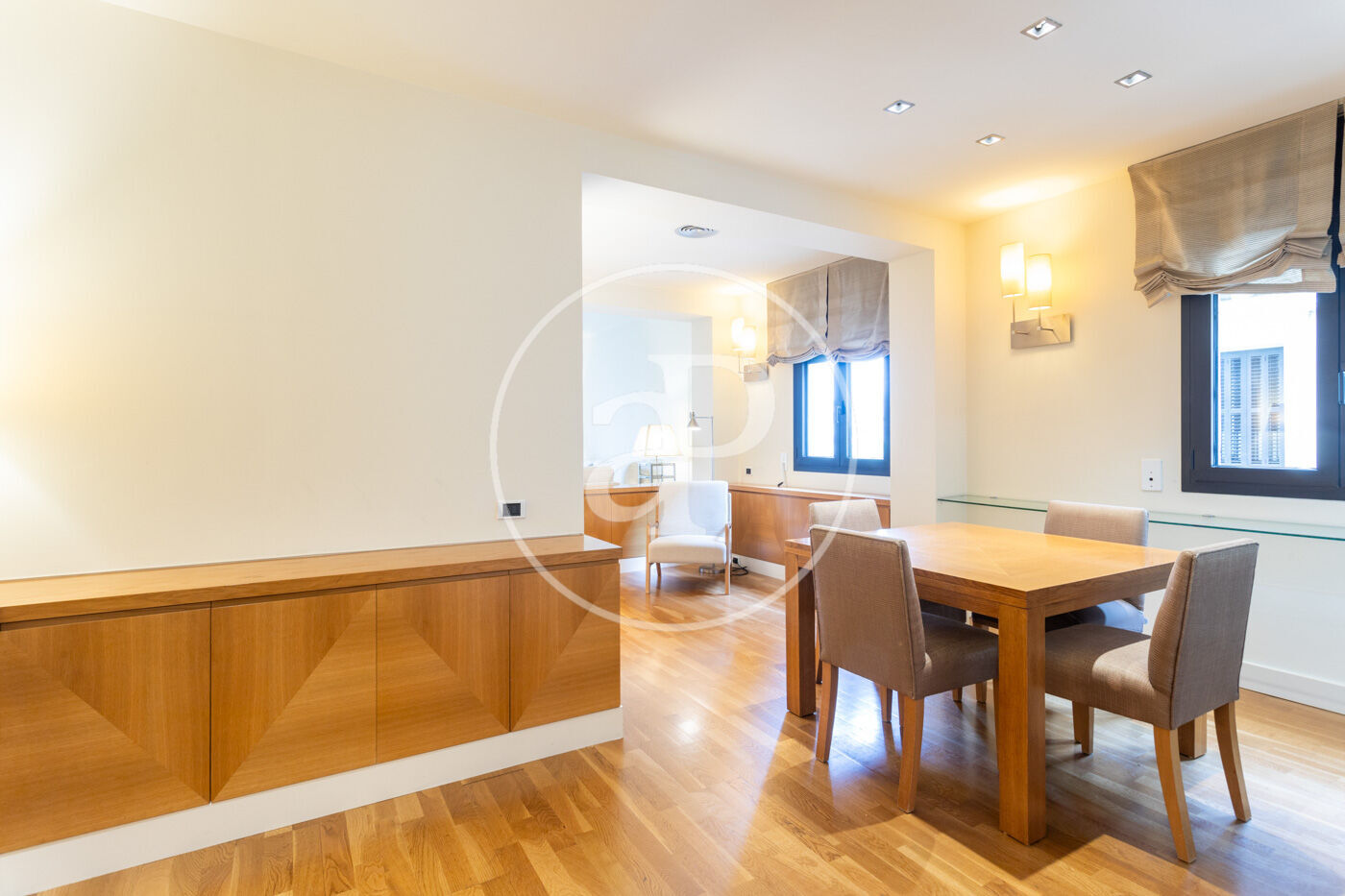 Este piso luminoso tiene 90 m², totalmente amueblado y equipado. Armarios empotrados, zona de aguas, balconcito a paseo de gracia y todo exterior. Aire acondicionado y calefacción por conductos, por todo el piso.