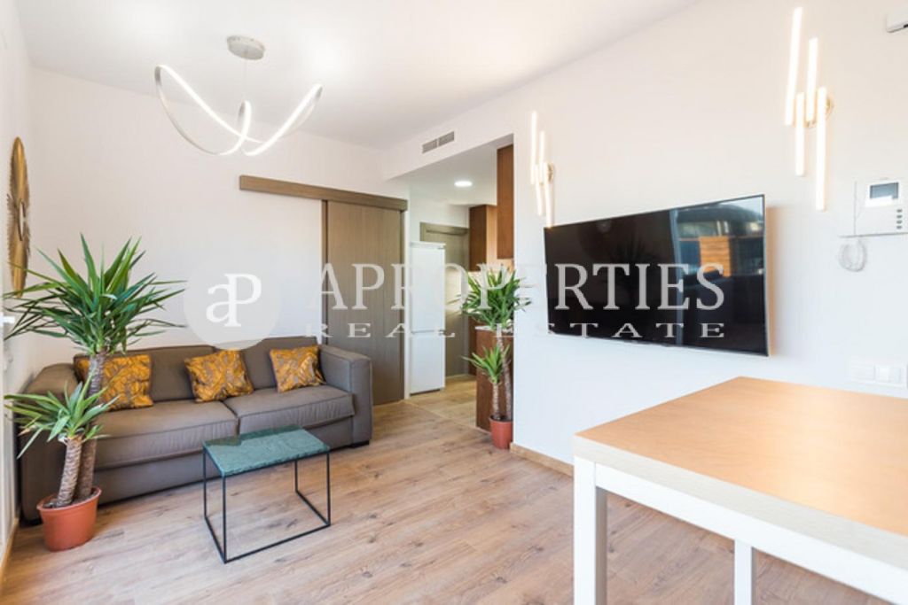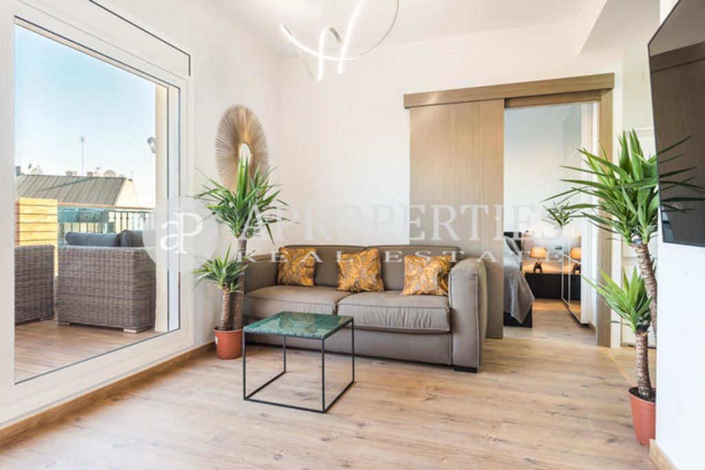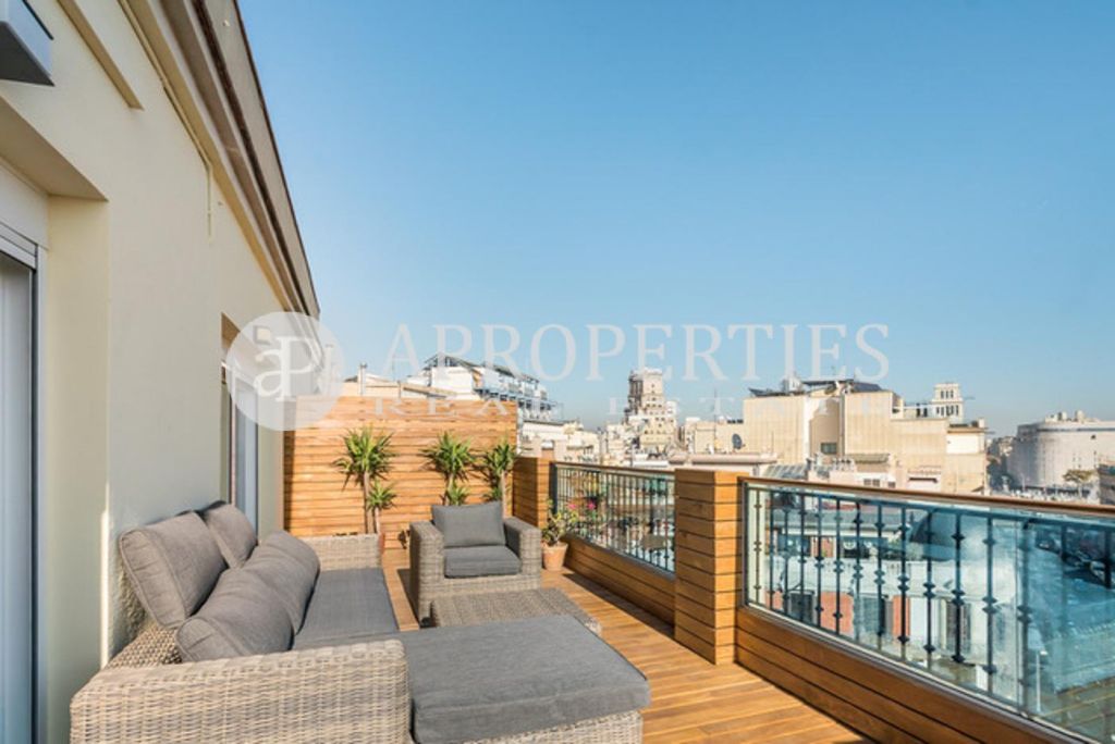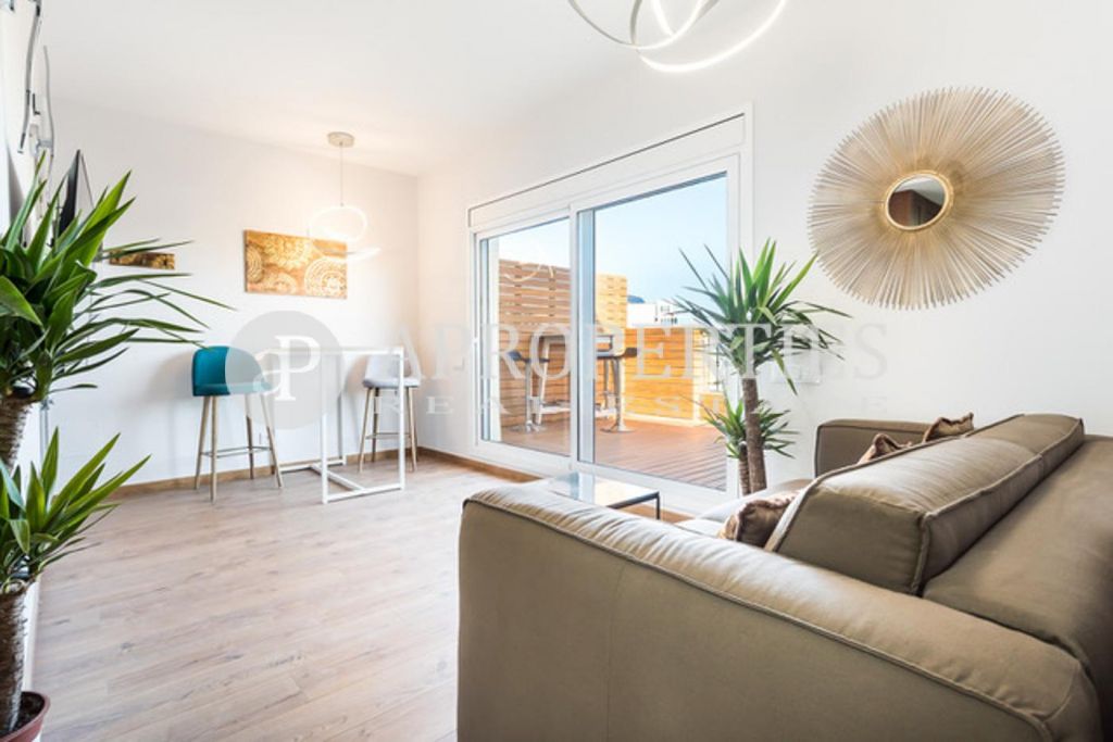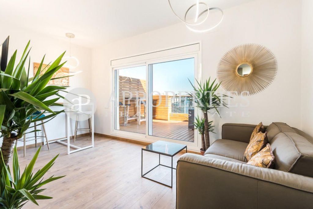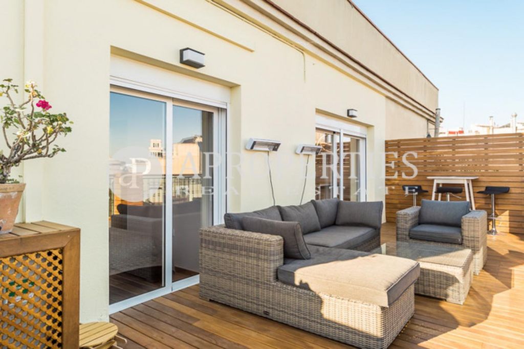 La vivienda tiene de una superficie de 50m2 y una terraza de aproximadamente 25m2 desde la que se divisa Montjuic, el mar, y las fuentes de Plaza Cataluña.