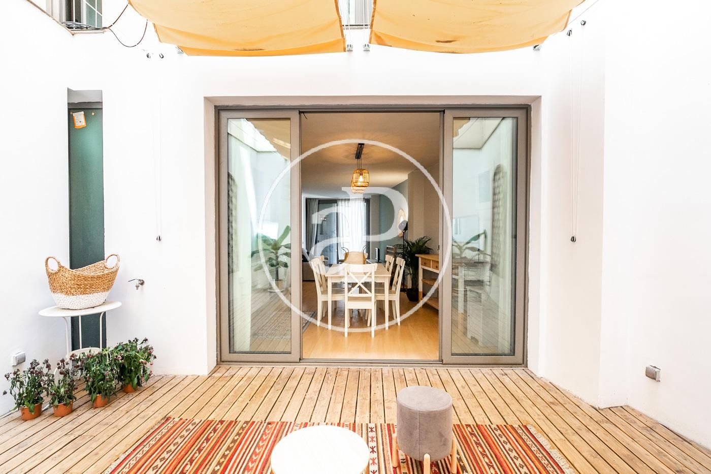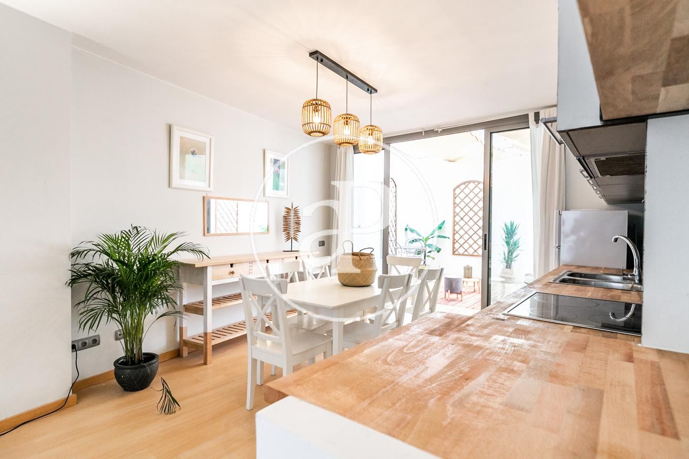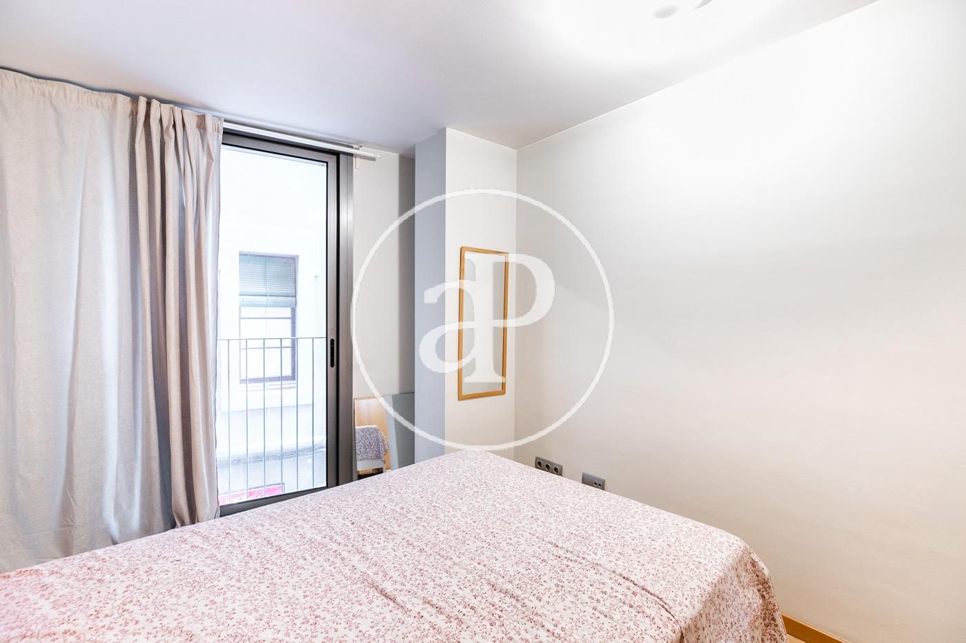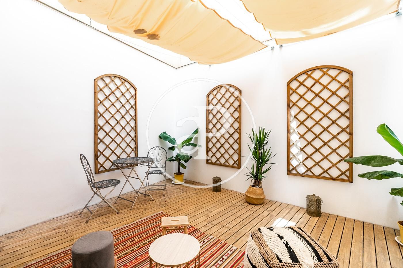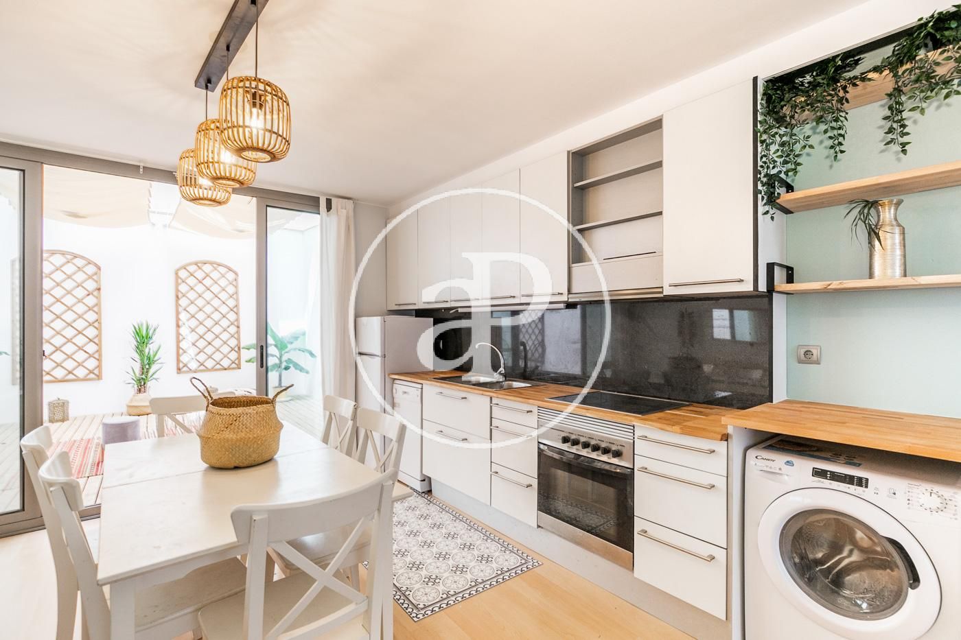 Cerca del Mercat de Santa Catarina, encontramos este piso amueblado con terraza de 21m2 a nivel del piso. Desde el ascensor accedemos al recibidor de la vivienda, ya que solo tiene un piso por planta. Al entrar nos encontramos con un baño completo con ducha grande que da servicio a las dos habitaciones. Una de ellas doble y otra individual grande, las dos con armarios empotrados y climatización por Split.