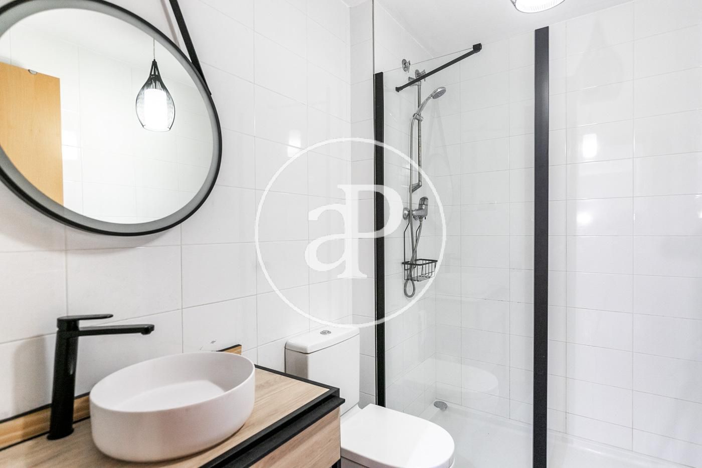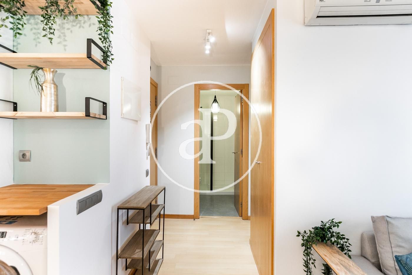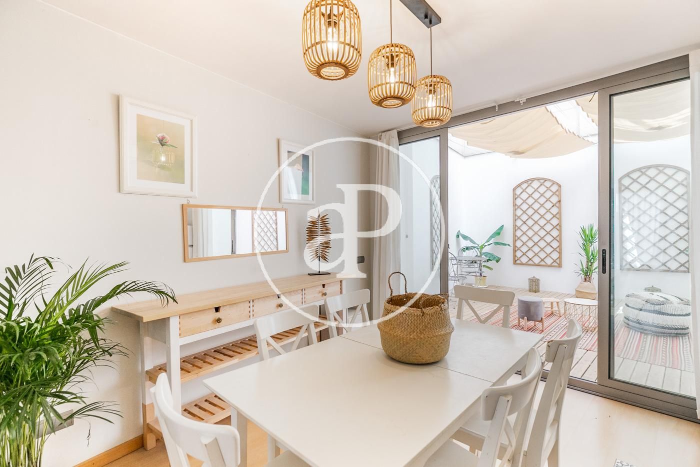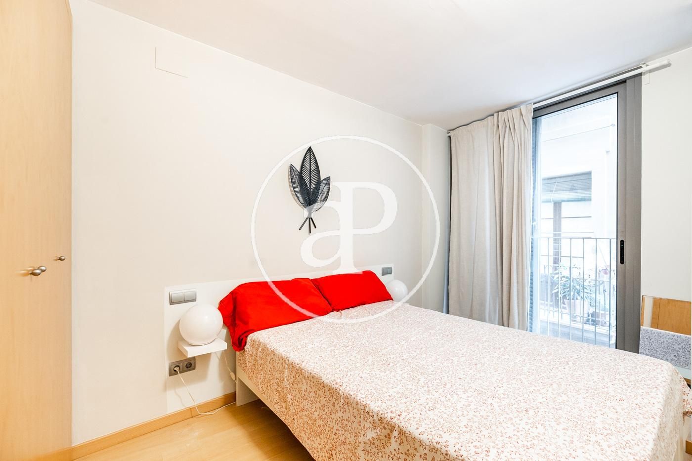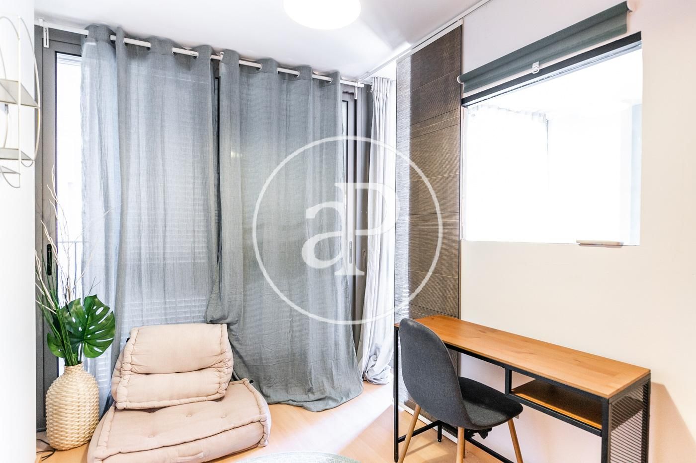 Cerca del Mercat de Santa Catarina, encontramos este piso amueblado con terraza de 21m2 a nivel del piso. Desde el ascensor accedemos al recibidor de la vivienda, ya que solo tiene un piso por planta. Al entrar nos encontramos con un baño completo con ducha grande que da servicio a las dos habitaciones. Una de ellas doble y otra individual grande, las dos con armarios empotrados y climatización por Split.