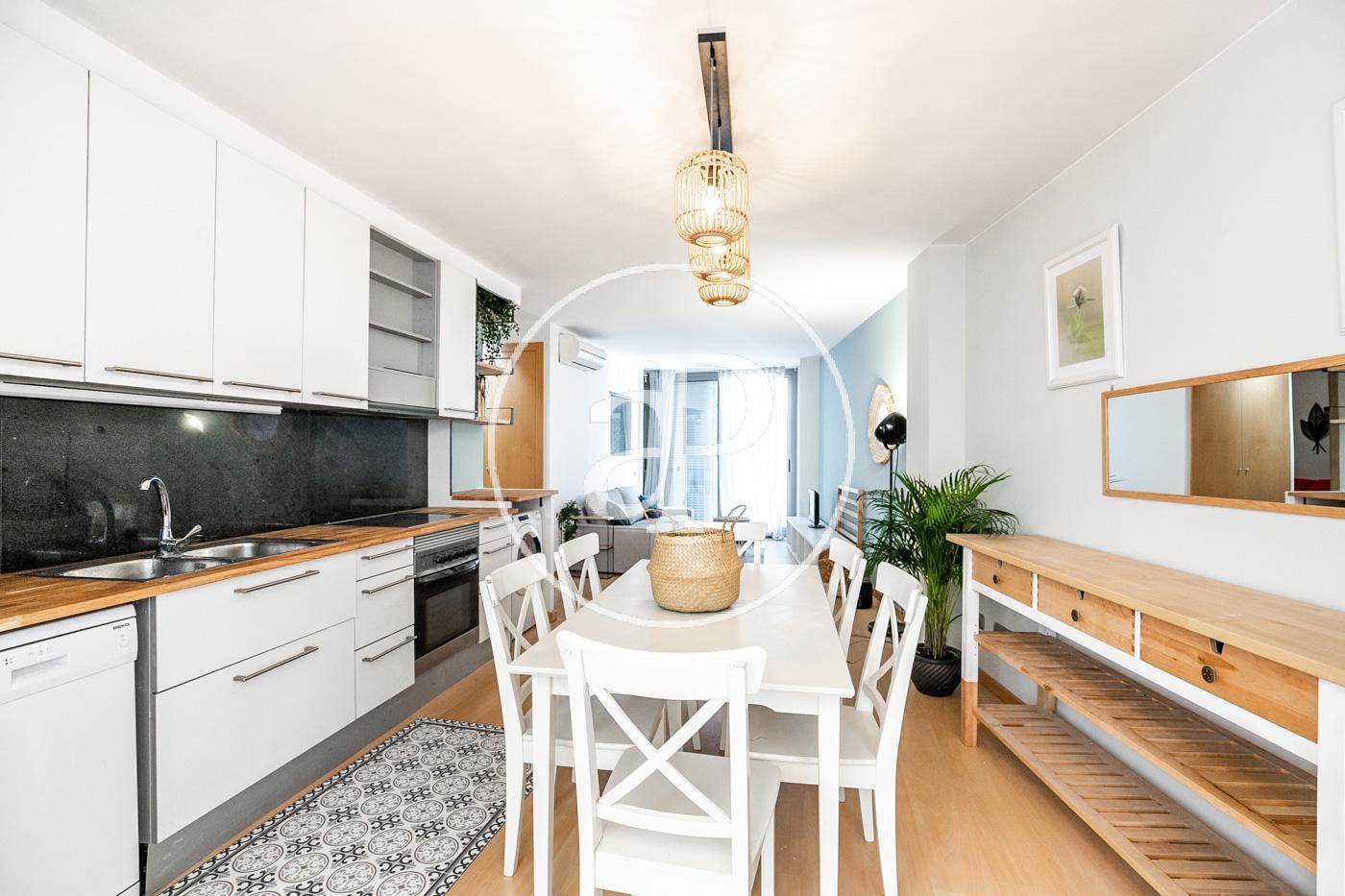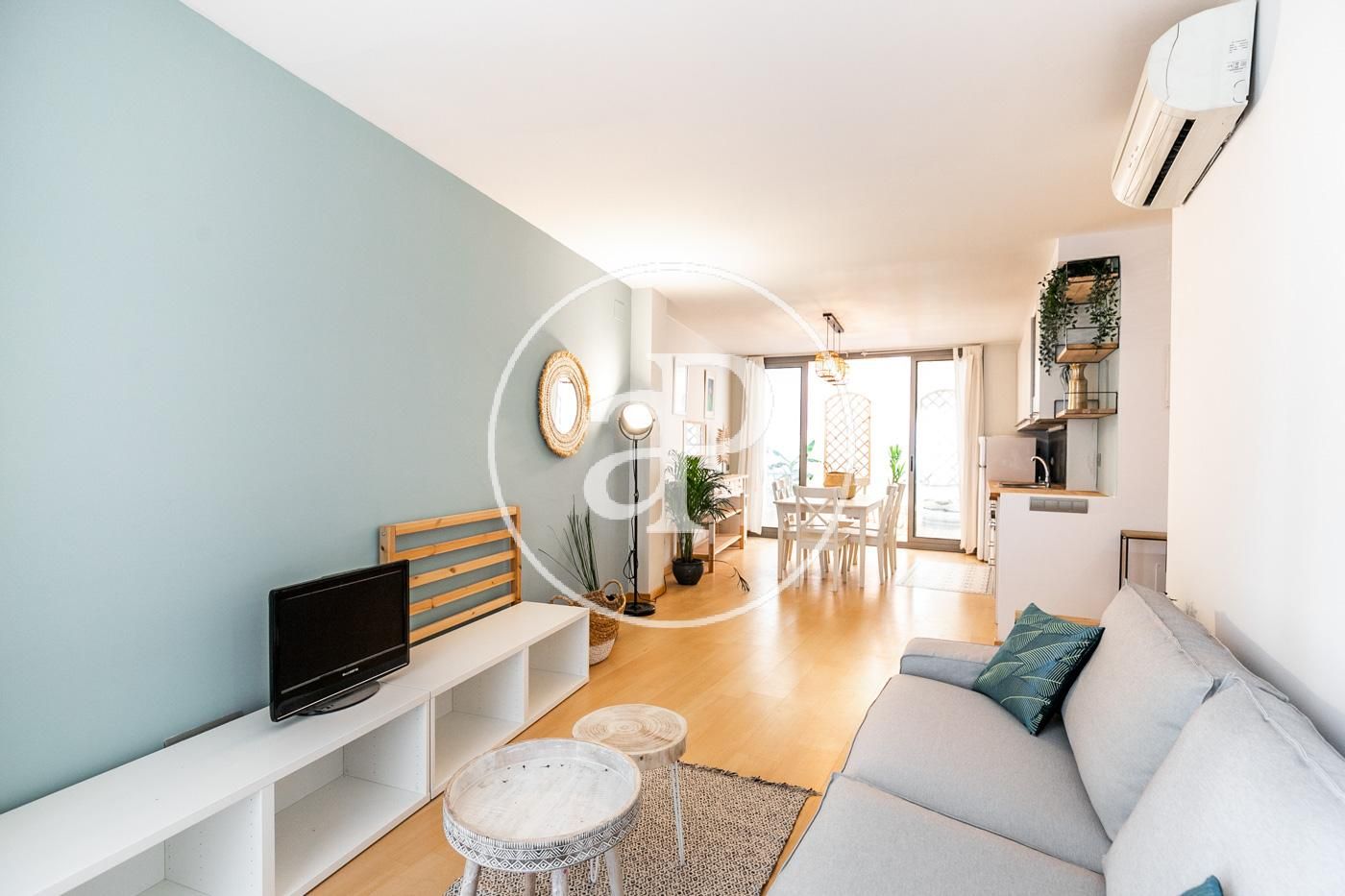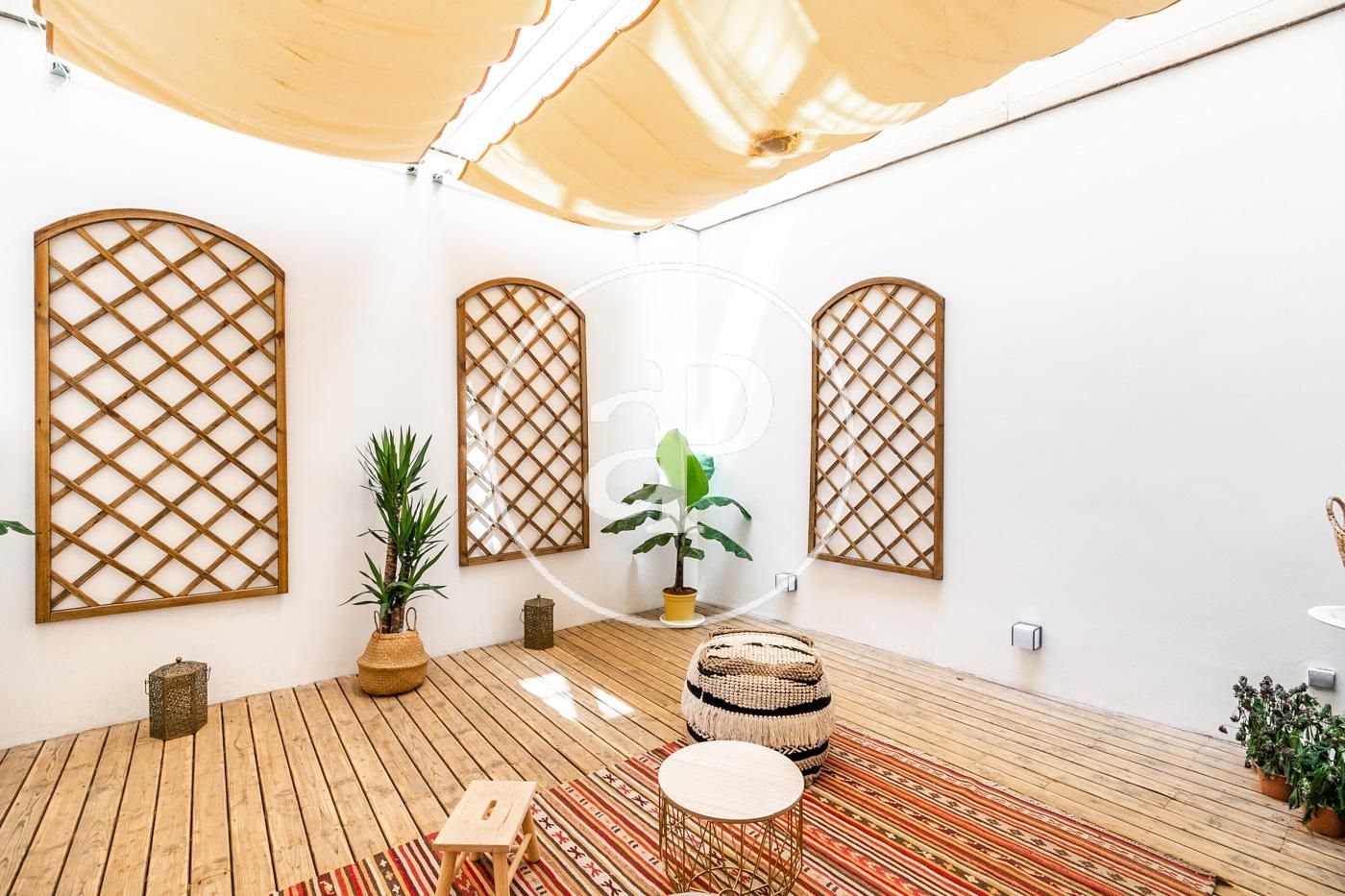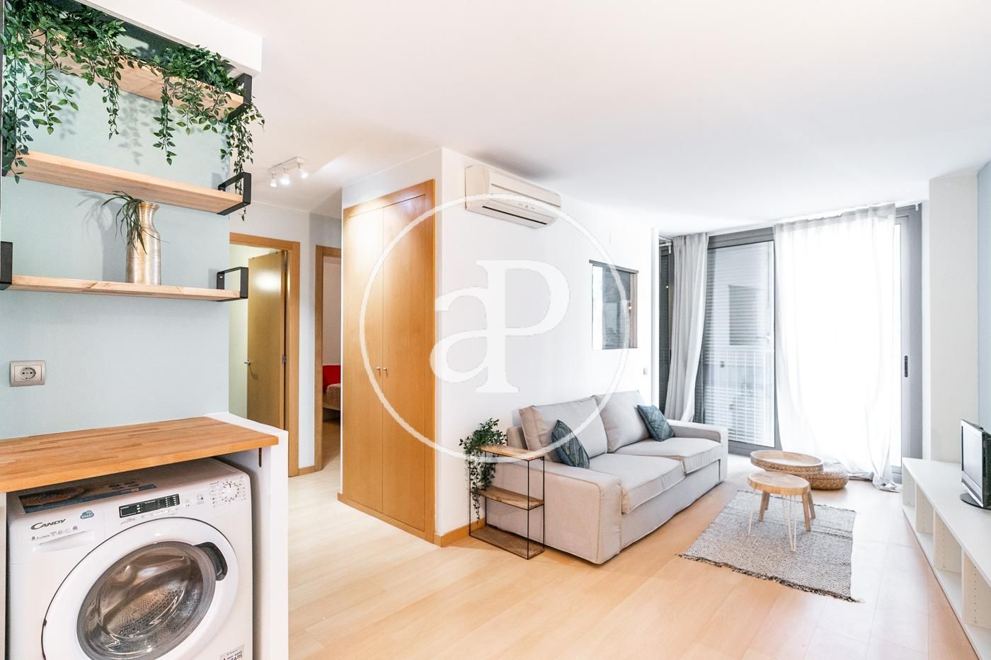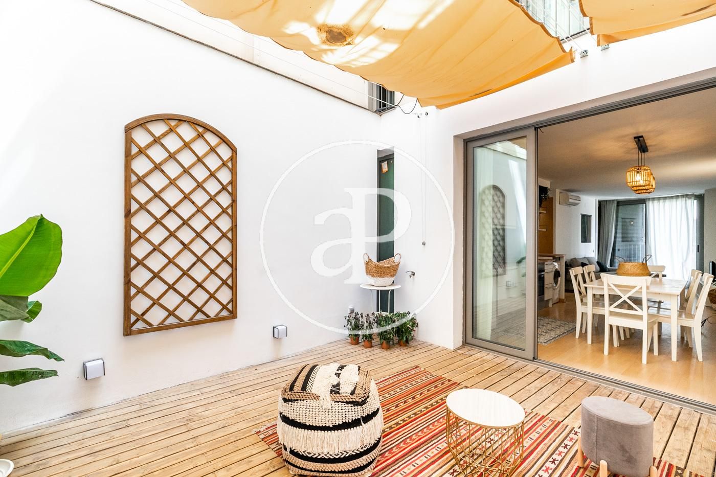 Cerca del Mercat de Santa Catarina, encontramos este piso amueblado con terraza de 21m2 a nivel del piso. Desde el ascensor accedemos al recibidor de la vivienda, ya que solo tiene un piso por planta. Al entrar nos encontramos con un baño completo con ducha grande que da servicio a las dos habitaciones. Una de ellas doble y otra individual grande, las dos con armarios empotrados y climatización por Split.