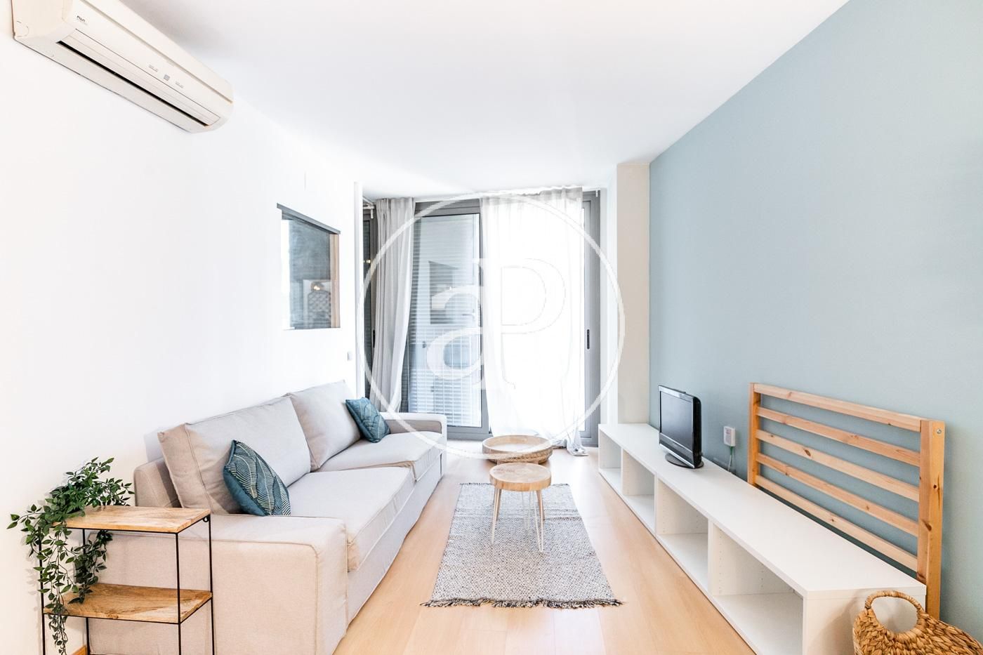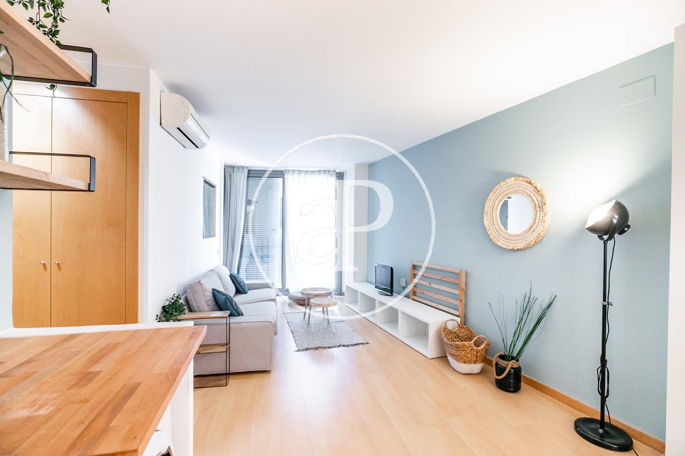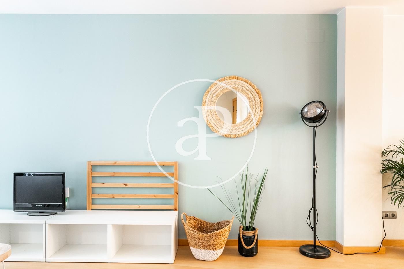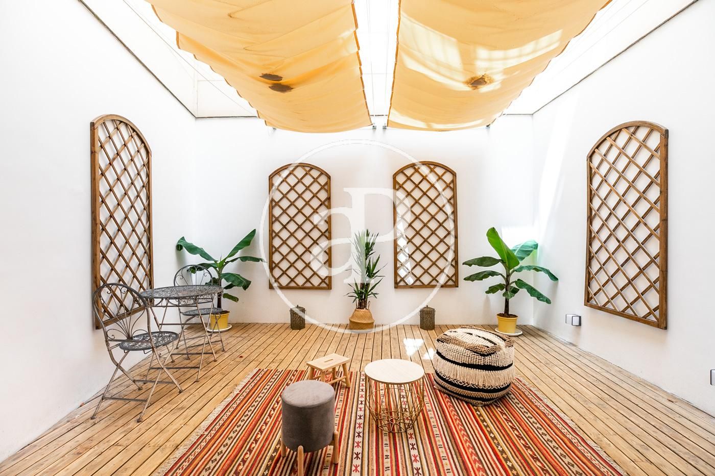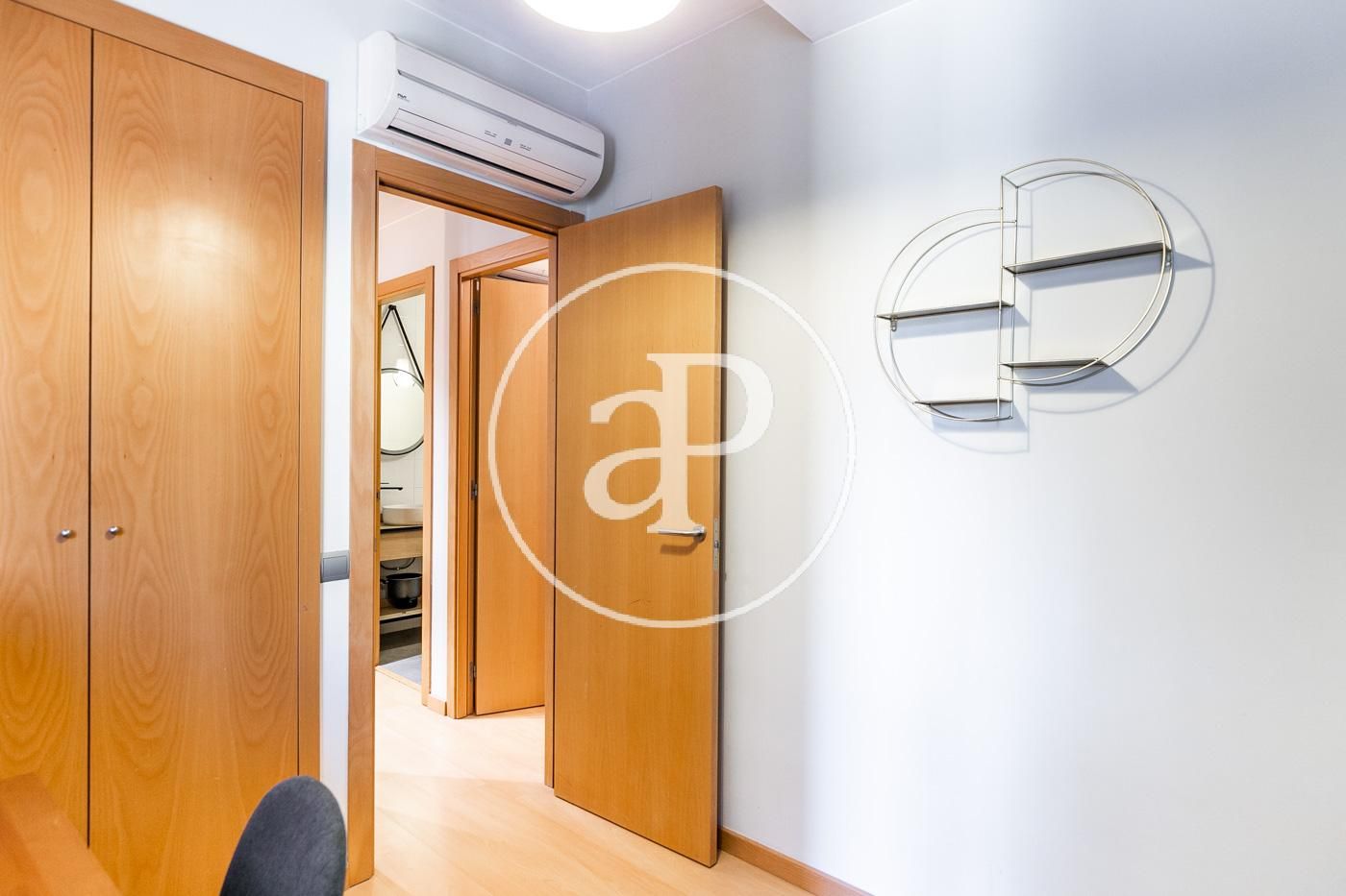 Cerca del Mercat de Santa Catarina, encontramos este piso amueblado con terraza de 21m2 a nivel del piso. Desde el ascensor accedemos al recibidor de la vivienda, ya que solo tiene un piso por planta. Al entrar nos encontramos con un baño completo con ducha grande que da servicio a las dos habitaciones. Una de ellas doble y otra individual grande, las dos con armarios empotrados y climatización por Split.