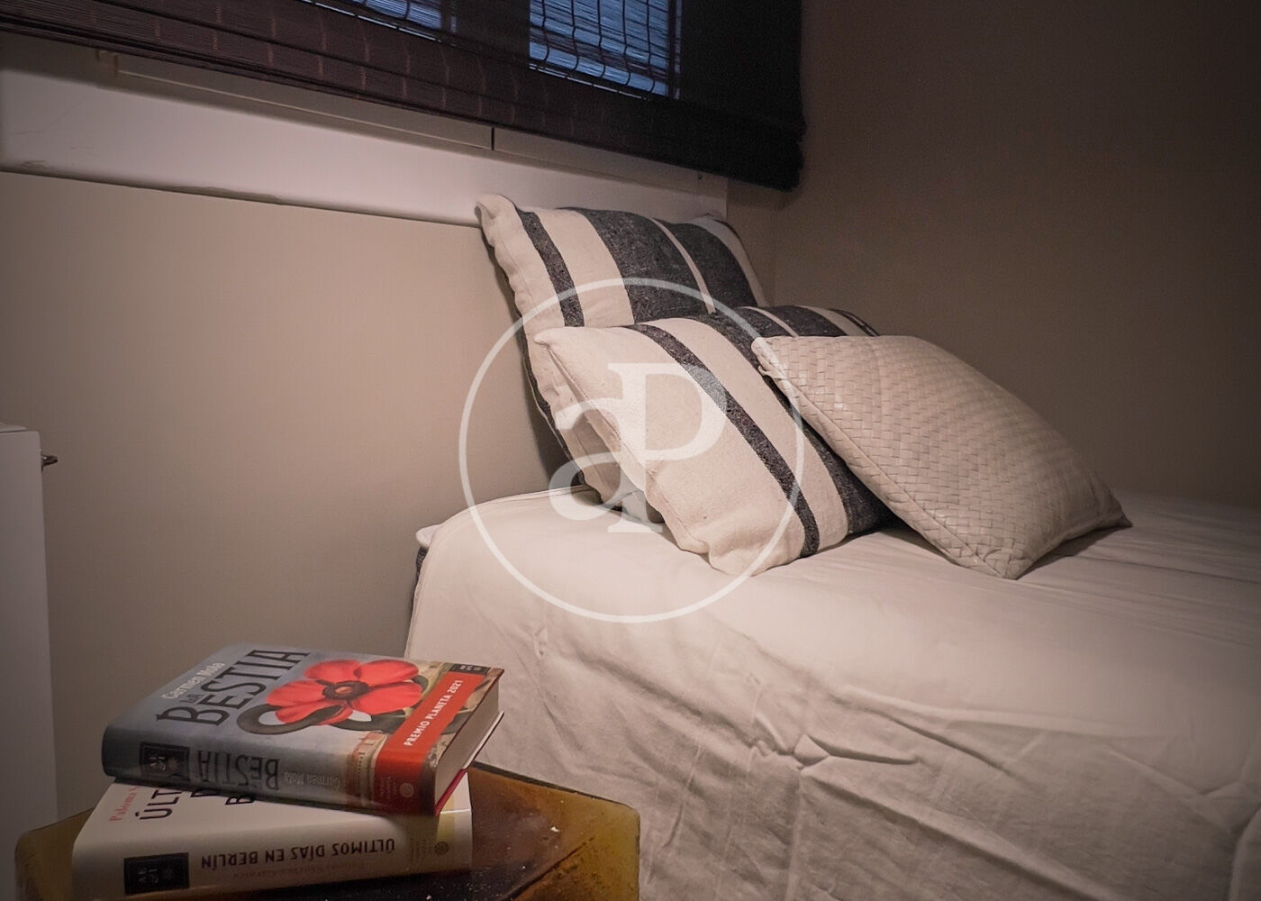 La reforma efectuada ha aprovechado cada centímetro de su superficie construida. Al entrar un pasillo muy acogedor y excelentemente iluminado nos da paso a las dos habitaciones individuales y los dos baños completos. Tras el pasillo llegamos a la zona social, donde se encuentra un maravilloso y acogedor salón abierto a una cocina con isla perfectamente equipada con electrodomésticos de última generación y un lavadero independiente.