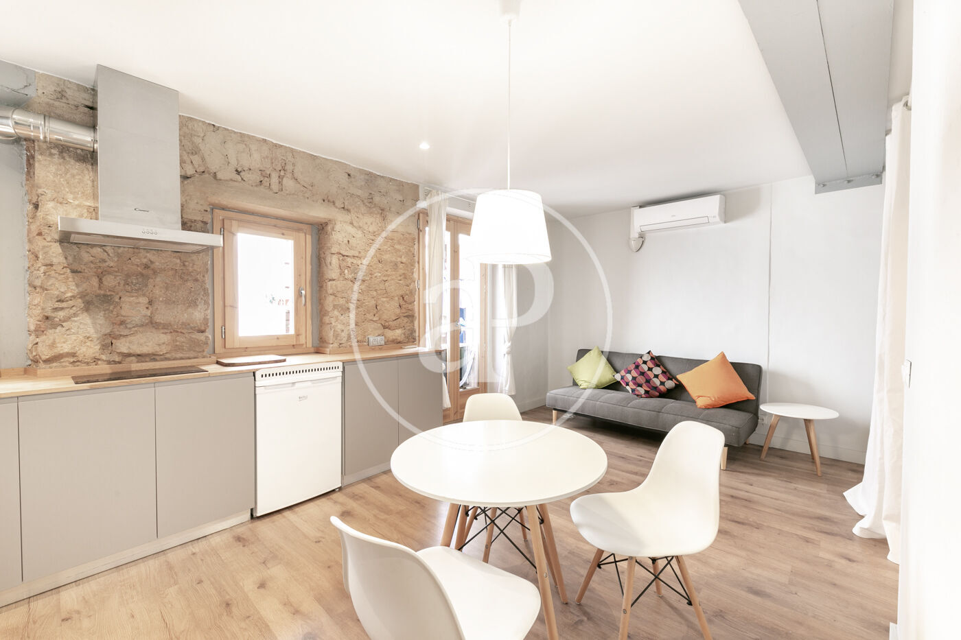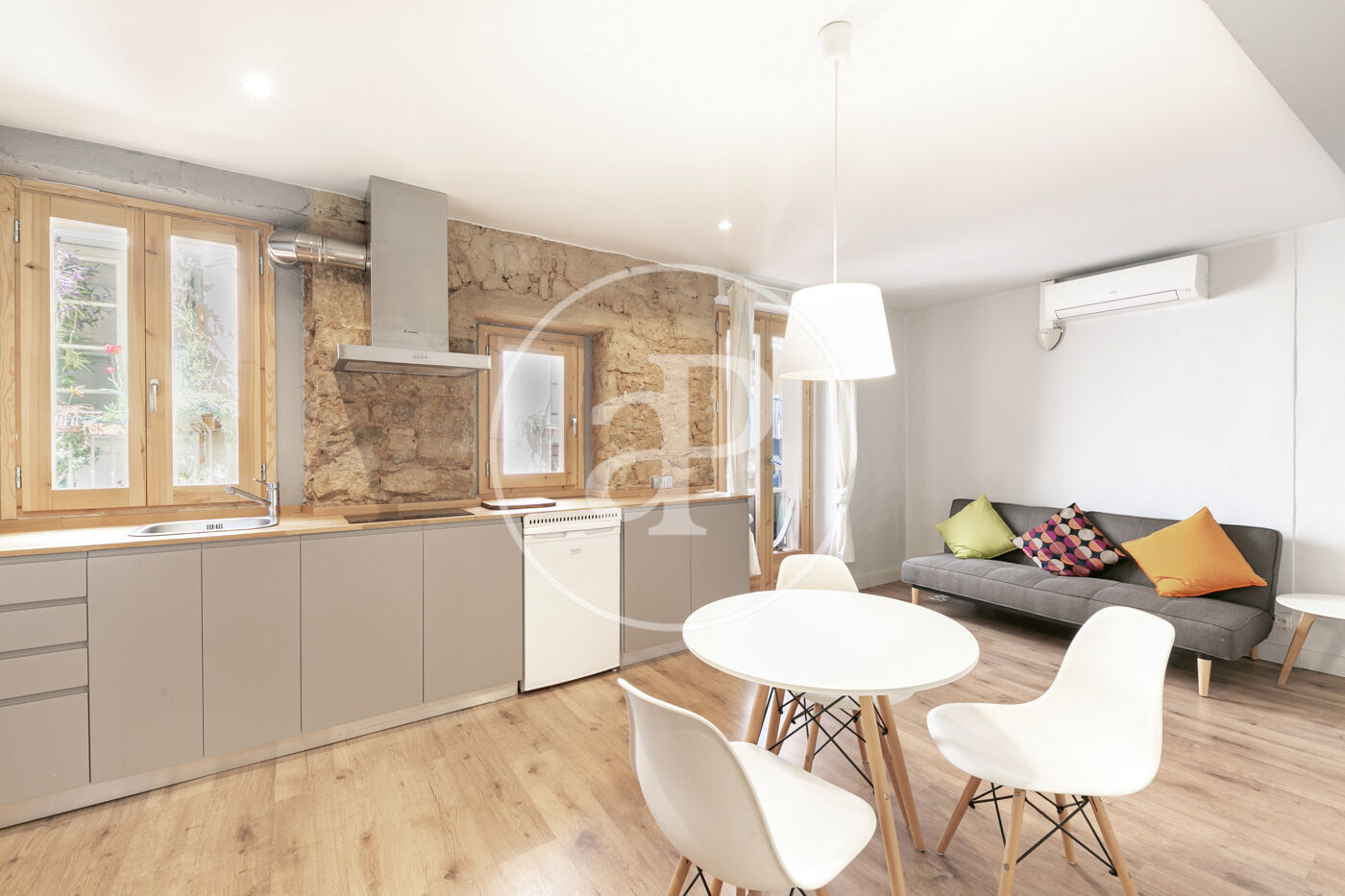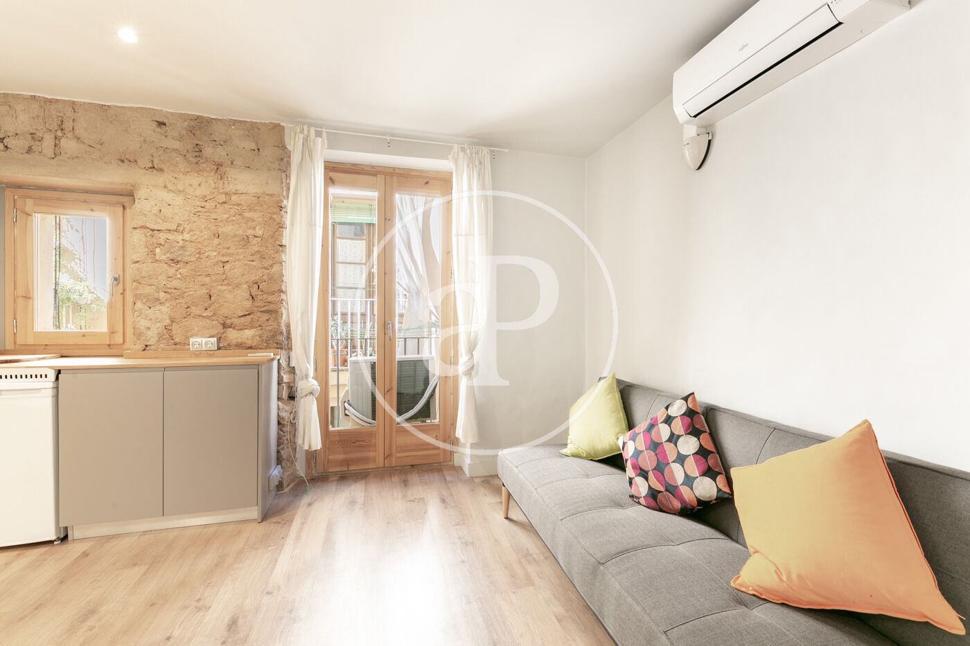 Suelo de parquet, paredes de obra vista y ventanas de madera. Split de aire frío y caliente