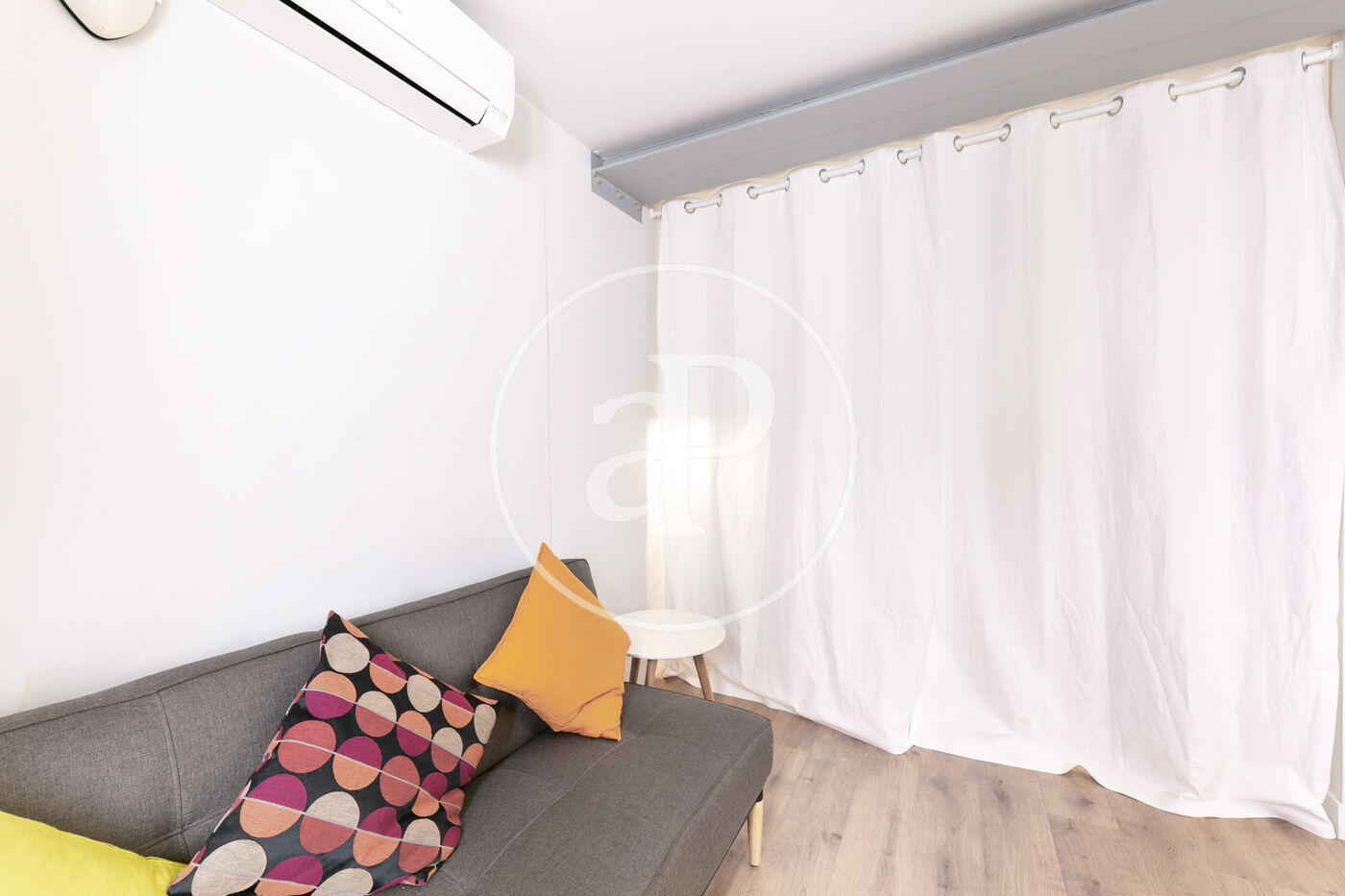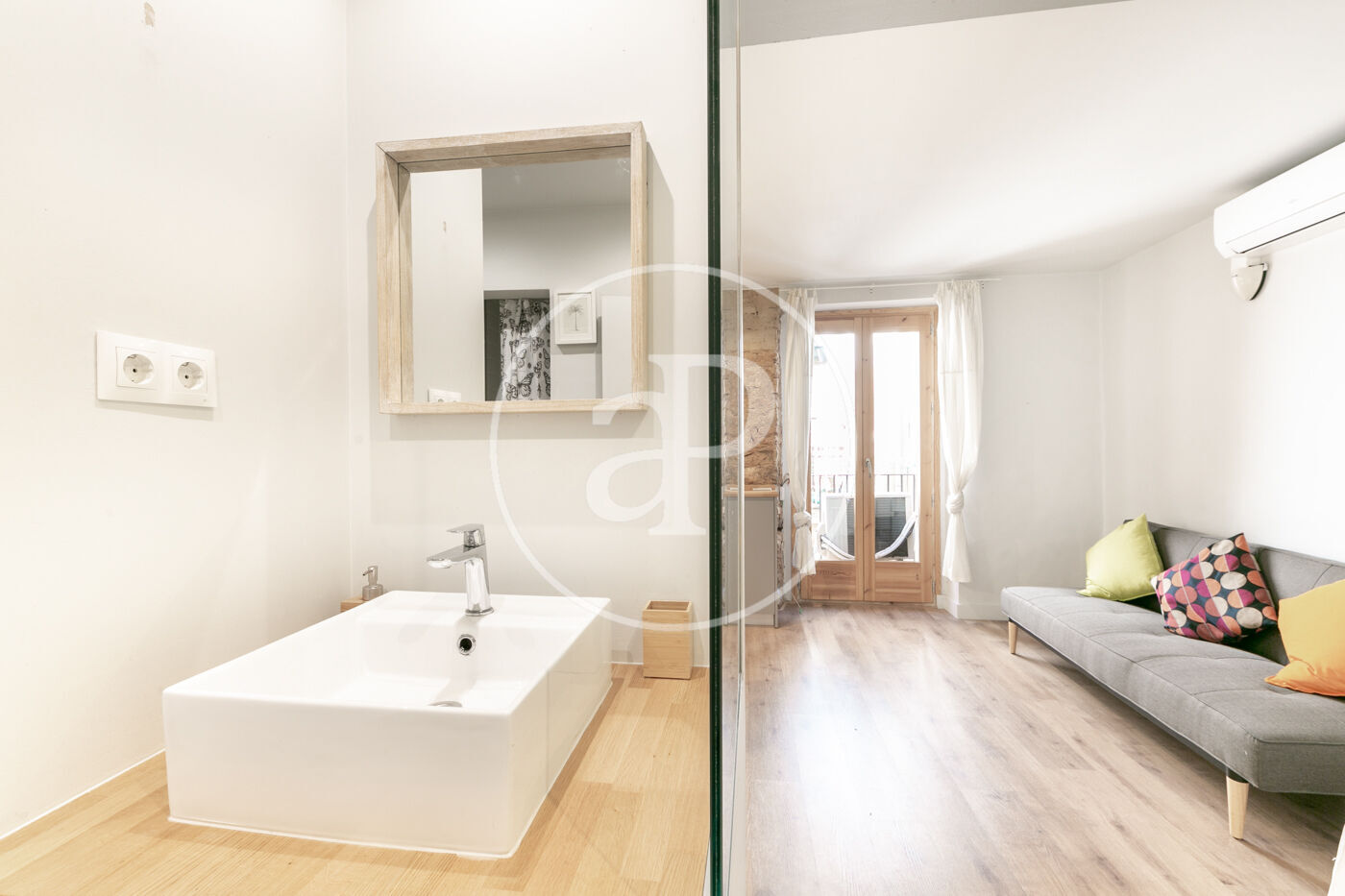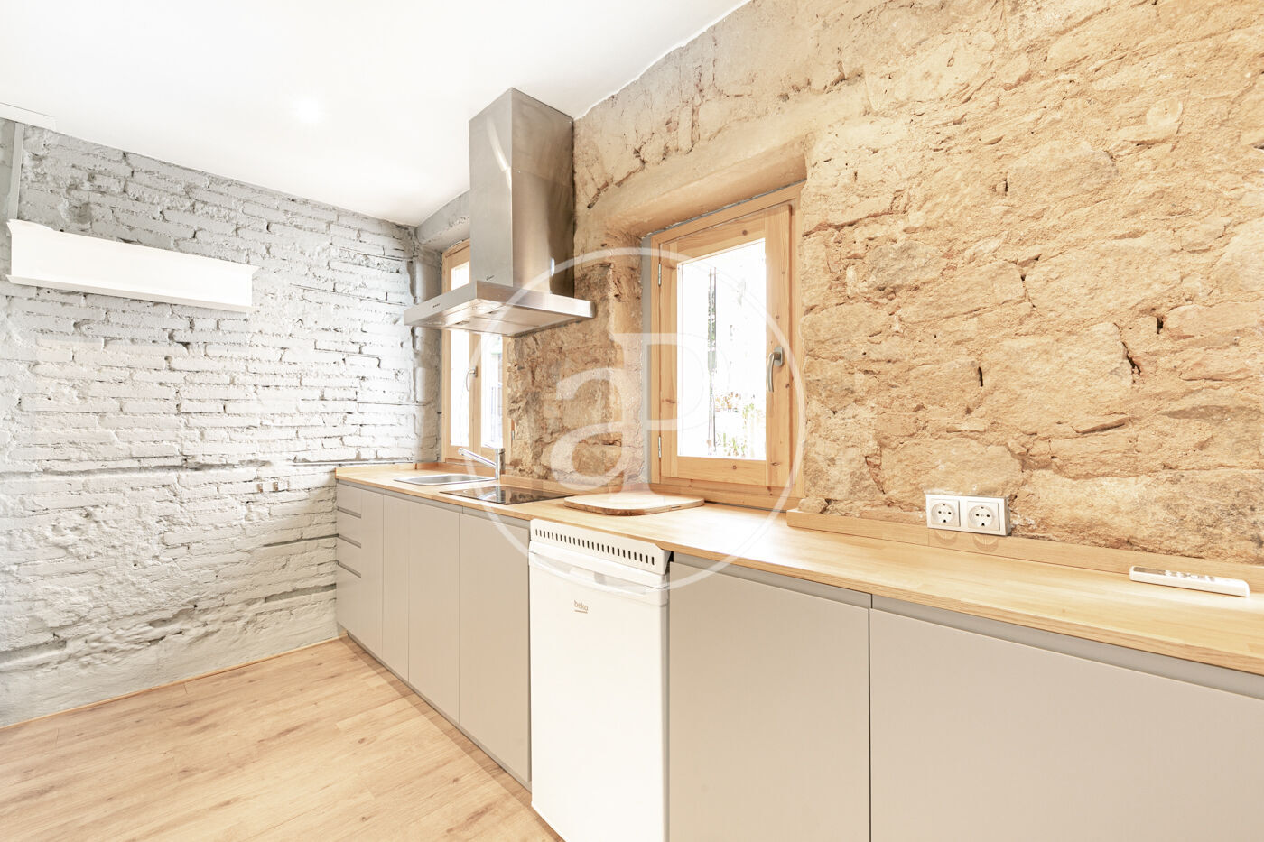 Suelo de parquet, paredes de obra vista y ventanas de madera. Split de aire frío y caliente