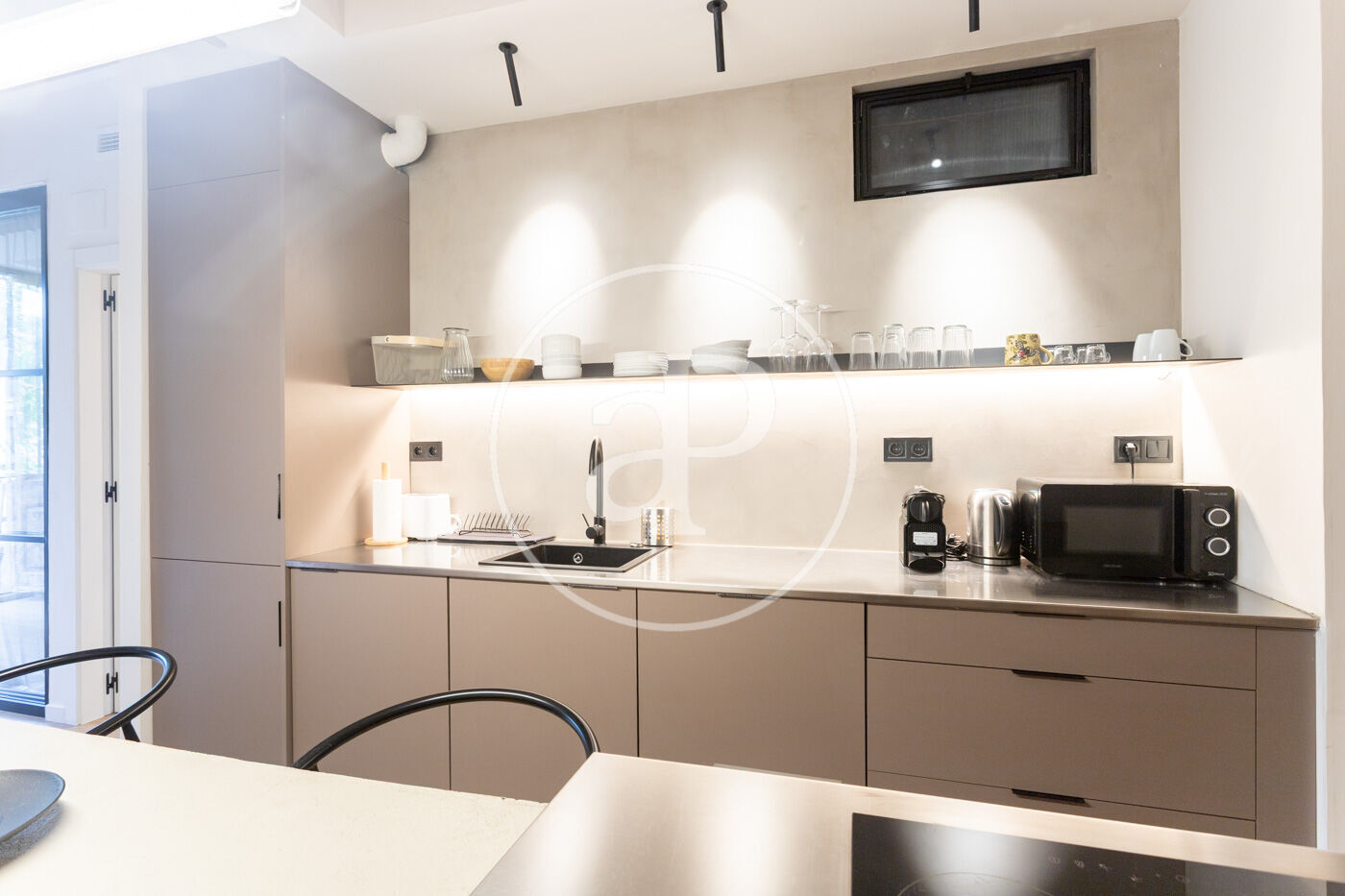La entrada del piso nos conduce a la zona de día, donde encontramos en un mismo ambiente el salón, comedor y la cocina abierta, totalmente equipada y de estilo industrial. Al lado está el baño completo con plato de ducha. La zona de noche está compuesta de un dormitorio doble exterior con armarios empotrados.