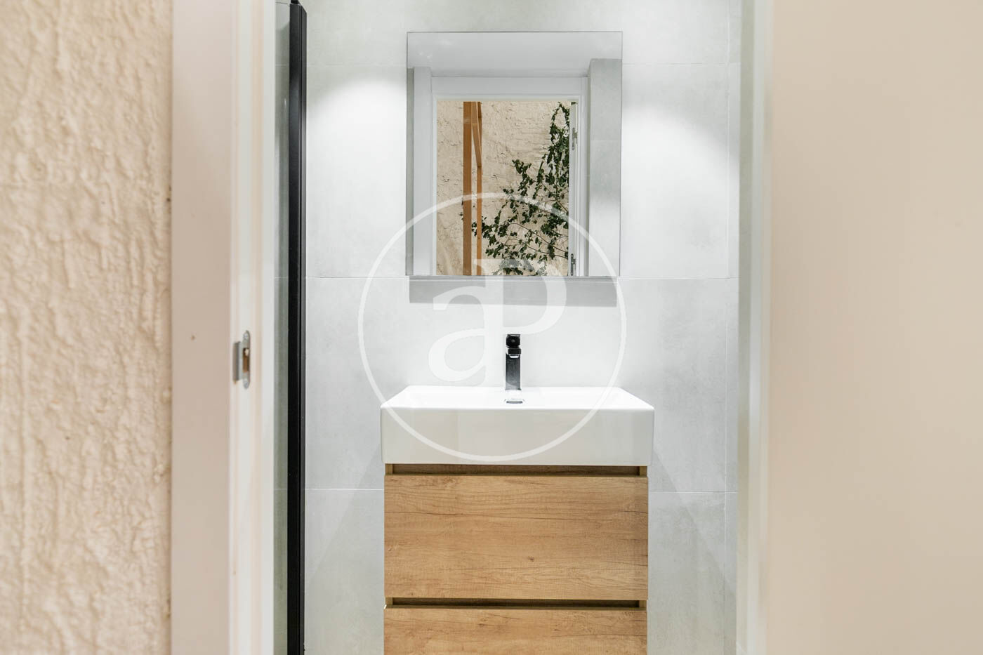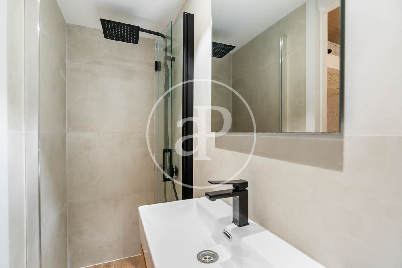 El baño, de estilo contemporáneo, ha sido renovado, manteniendo la armonía con el resto del loft.
