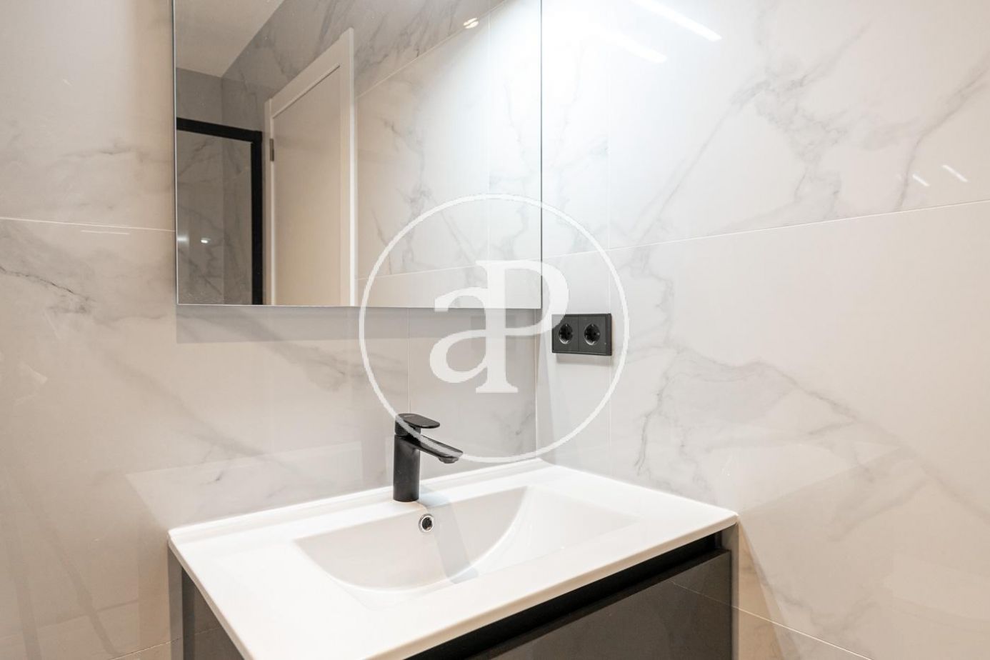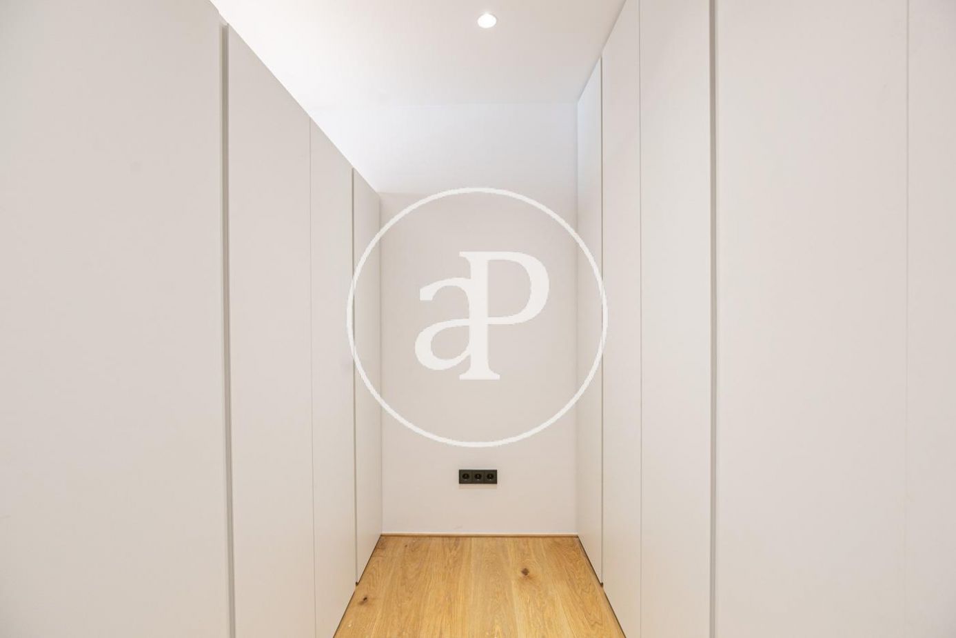 El piso se compone de un recibidor, un amplio salón comedor con salida a balcón, una cocina abierta integrada con encimera en mármol, placa de inducción y electrodomésticos de las mejores marcas. Cuenta con dos dormitorios exteriores dobles en suite con vestidor, uno de los cuales con acceso directo a balcón. Los dos baños presentan paredes con revestimiento porcelánico gran formato, grifería en negro y radiador de pared. Cuenta con suelos de parquet de roble natural, sistema de iluminación completo con focos en todas las estancias y dispone de sistema de calefacción, climatización y agua caliente por aerotermia.