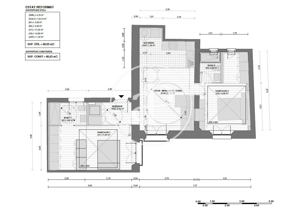 La vivienda, de 86m2 construidos según plano, ha sido íntegramente reformada empleando materiales y acabados de primera calidad. Cuenta con un diseño moderno y funcional en perfecta armonía con sus elementos originales como los techos con bóveda catalana y vigas de madera y las paredes de piedra y ladrillo vistos perfectamente recuperados. Destaca por su luminosidad siendo todas sus estancias exteriores.