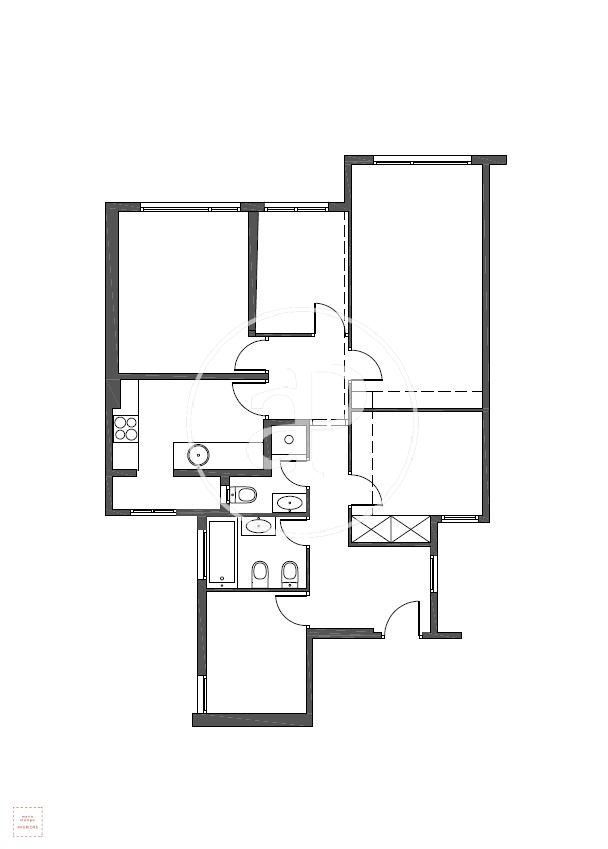 Consta de salón-comedor, cocina con zona de aguas, cuatro habitaciones: tres son individuales y una doble, tres de ellas a la calle y una a patio de luces. Además dispone de dos baños completos.