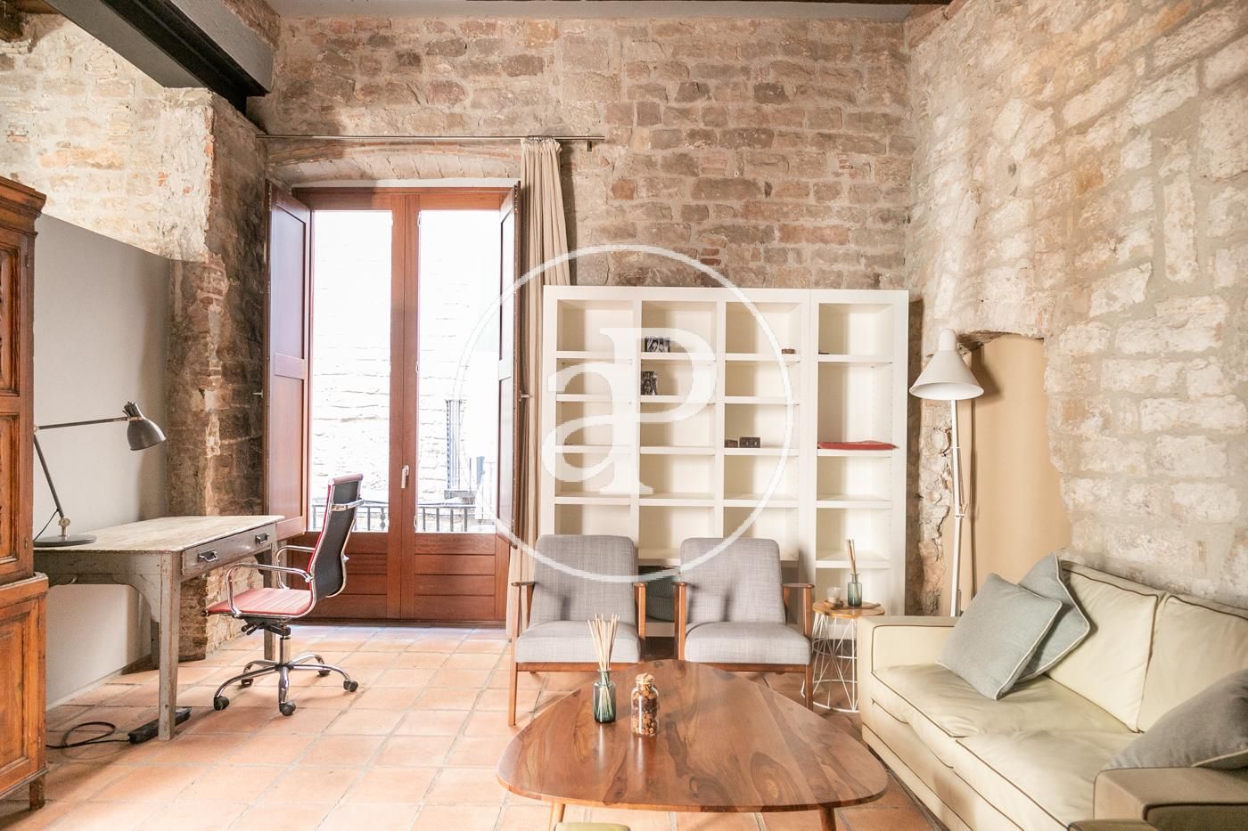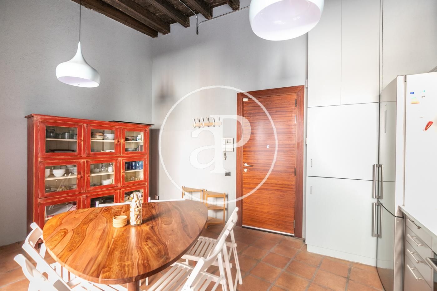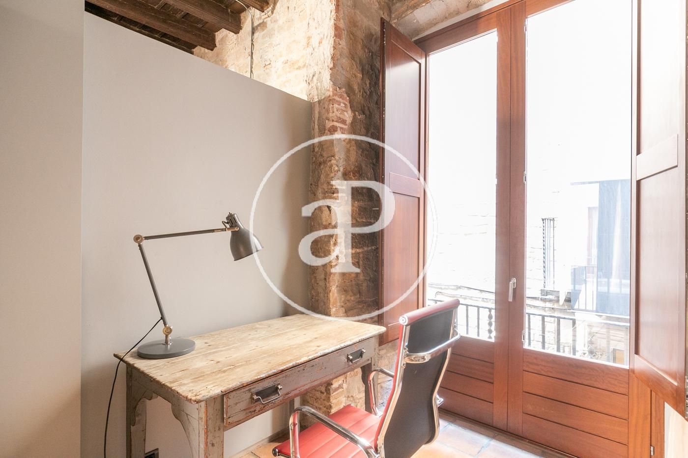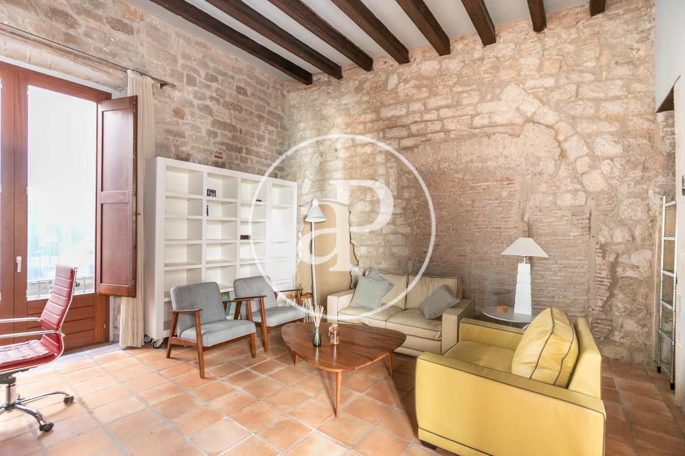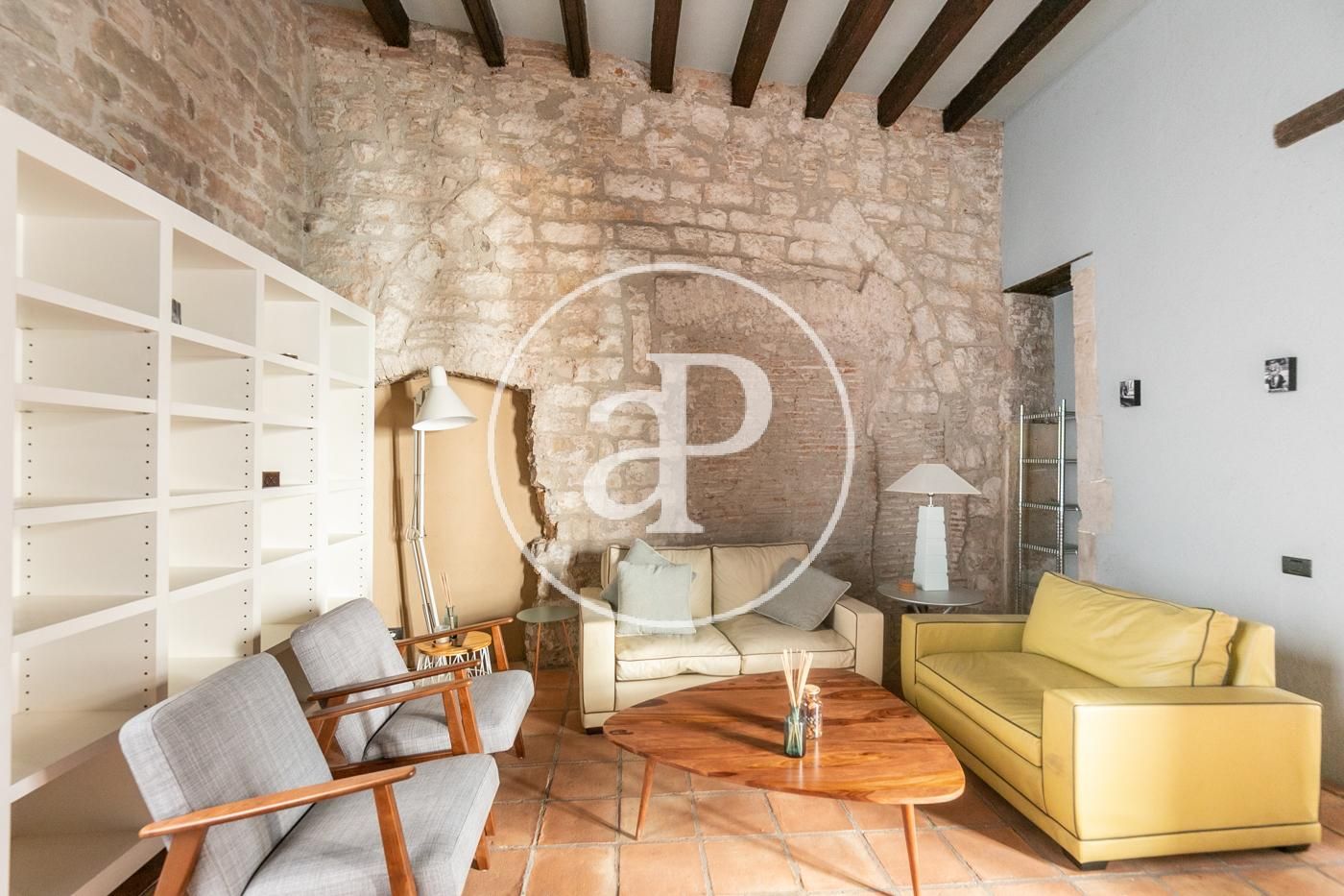 En el emblemático barrio Gótico de Barcelona, a pocos metros de la Plaza Sant Jaume y de la Catedral, se encuentra este histórico palacete gótico rehabilitado con materiales de primera calidad y convertido en pisos que son auténtica obra de arte. Este inmueble, de gran valor arquitectónico, fue rehabilitado en el año 2000 respetando íntegramente su estructura original, y cuenta con arcos, columnas y artesonados del siglo XV. El piso, consta de un espacio abierto de 77m². El techo es de vigas de 6 metros de altura. Su cocina-office y su amplio salón, tienen vistas al bonito y luminoso patio principal de la finca. Tiene un acogedor dormitorio en suite con baño completo. La calefacción es individual de suelo radiante. También dispone de aire acondicionado. Este piso tiene la posibilidad de ser unido al piso contiguo. La finca tiene servicio de conserjería y cada vivienda dispone de un trastero. Hay parking para bicis y motos. Es un lugar privilegiado para disfrutar de la tranquilidad del interior de sus muros y del ambiente de sus calles repletas de historia, comercios y restaurantes.