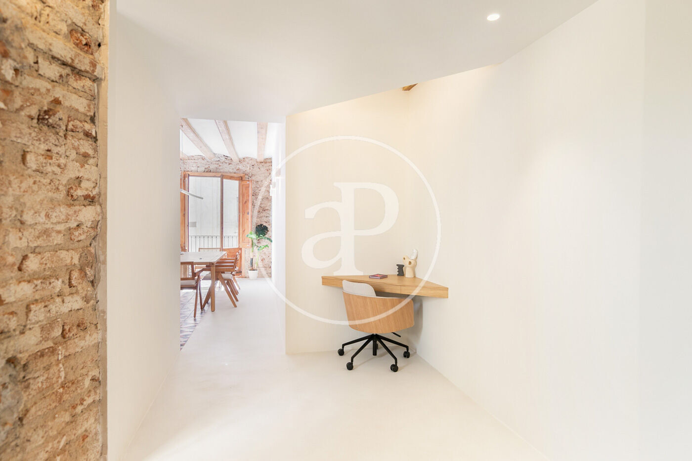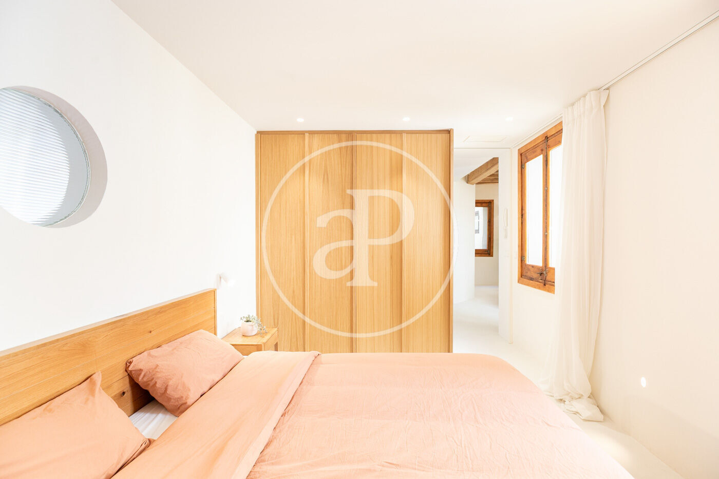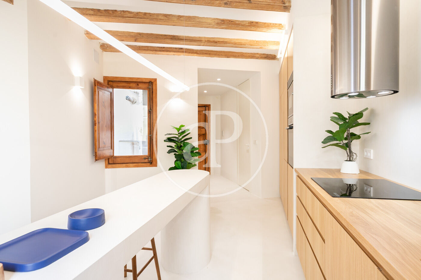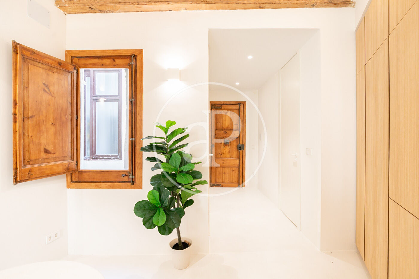 Ubicado en una planta alta de un edificio rehabilitado, sin ascensor, este apartamento ha sido completamente renovado con un proyecto arquitectónico que realza la luz y la amplitud. Dispone de un dormitorio independiente, un espacio diáfano que integra salón, recibidor y cocina, y conserva elementos originales como carpinterías, vigas vistas y mosaicos hidráulicos, que se mezclan de forma armónica con acabados actuales de líneas sobrias y sofisticadas. La vivienda se entrega totalmente amueblada y equipada con electrodomésticos de alta gama, lista para entrar a vivir desde el primer día, sin necesidad de añadir nada más.