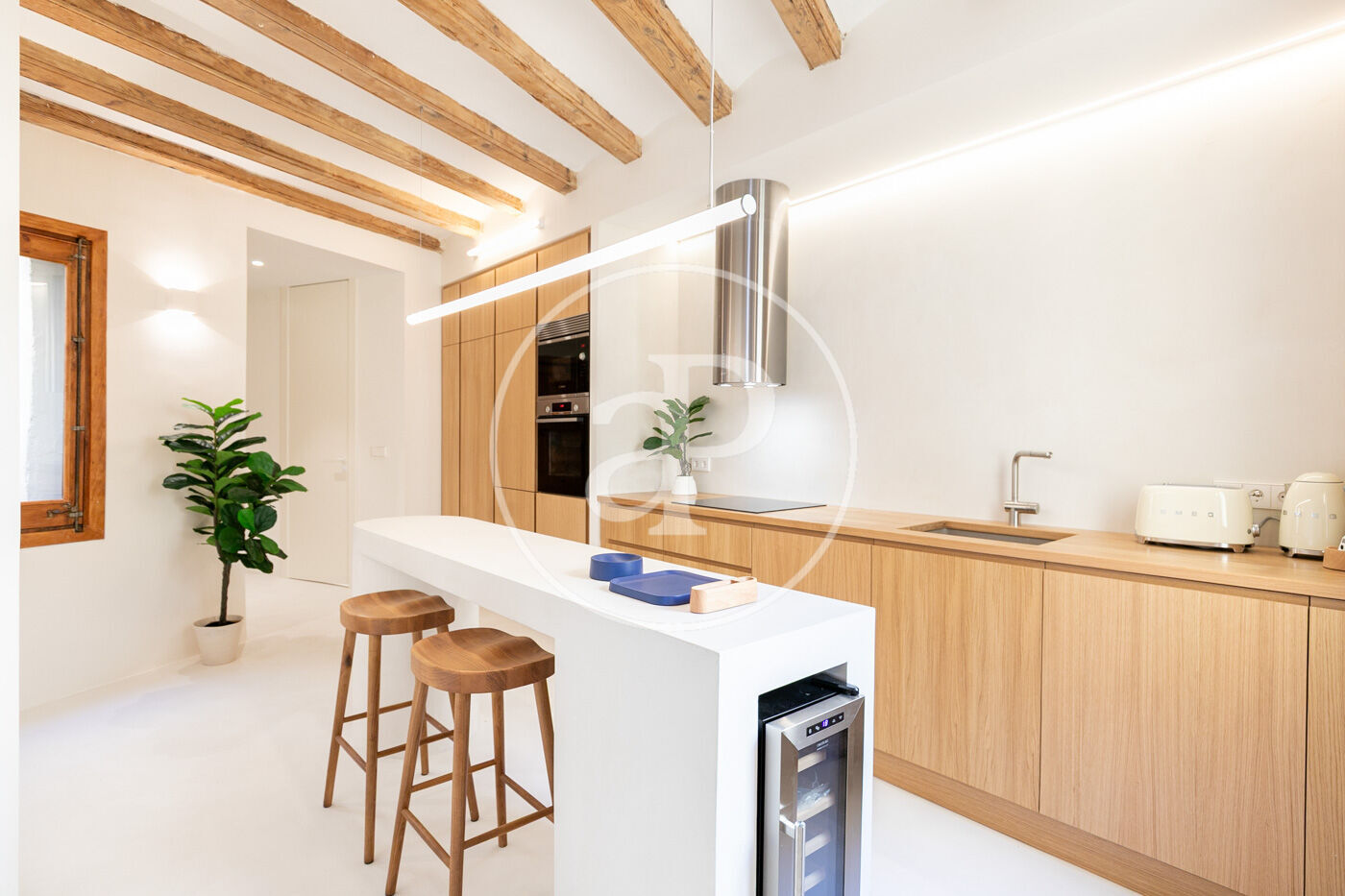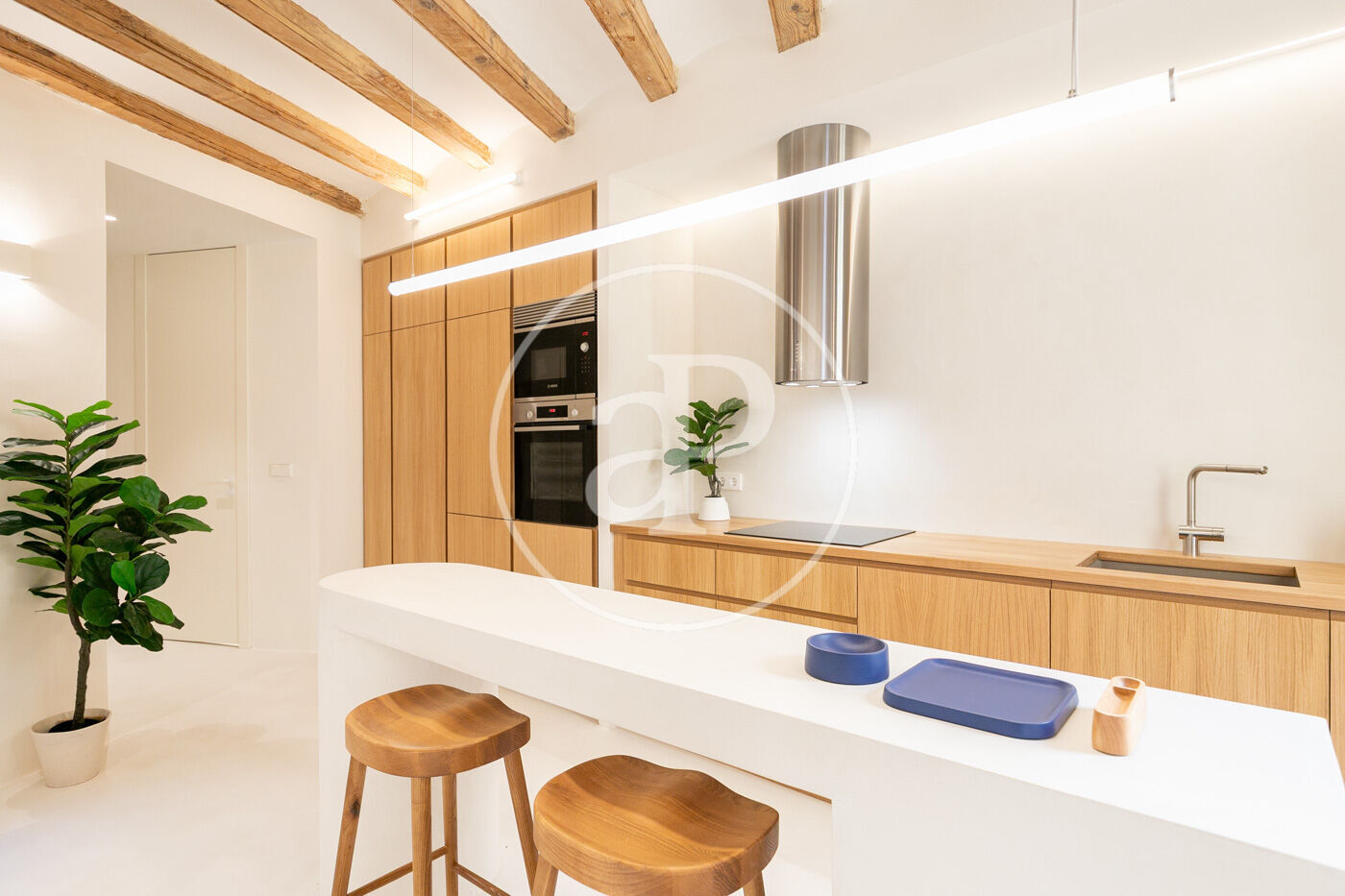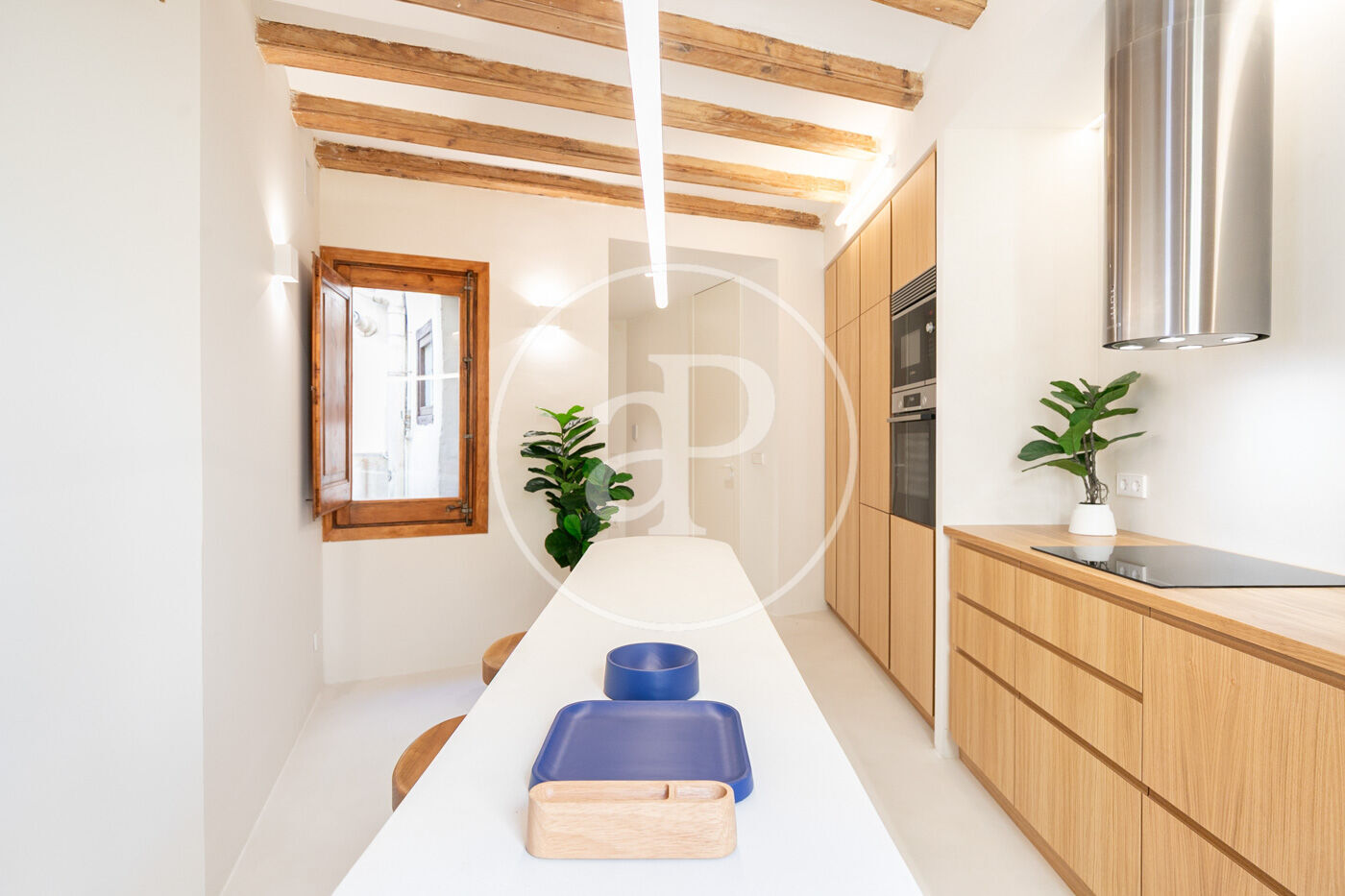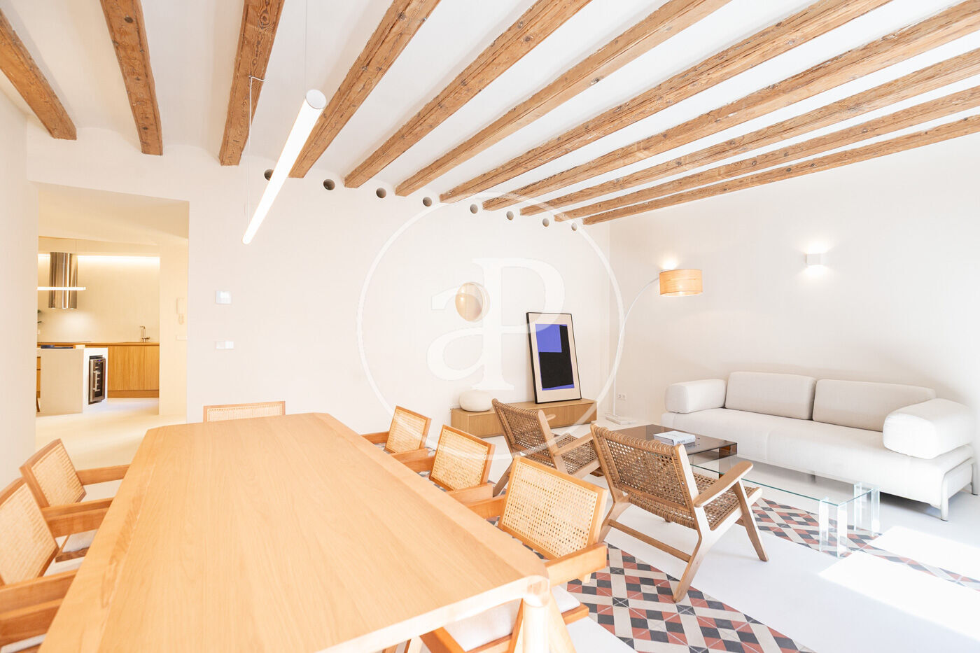 Ubicado en una planta alta de un edificio rehabilitado, sin ascensor, este apartamento ha sido completamente renovado con un proyecto arquitectónico que realza la luz y la amplitud. Dispone de un dormitorio independiente, un espacio diáfano que integra salón, recibidor y cocina, y conserva elementos originales como carpinterías, vigas vistas y mosaicos hidráulicos, que se mezclan de forma armónica con acabados actuales de líneas sobrias y sofisticadas. La vivienda se entrega totalmente amueblada y equipada con electrodomésticos de alta gama, lista para entrar a vivir desde el primer día, sin necesidad de añadir nada más.