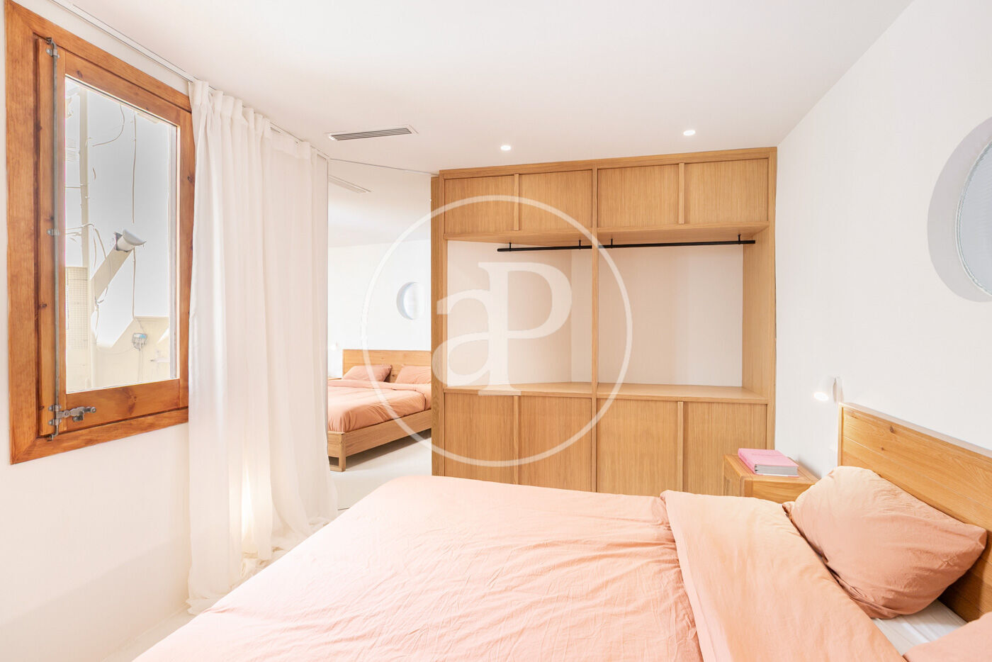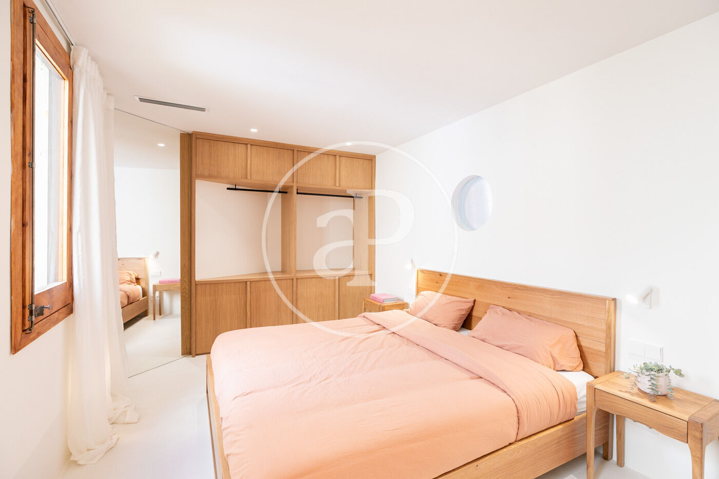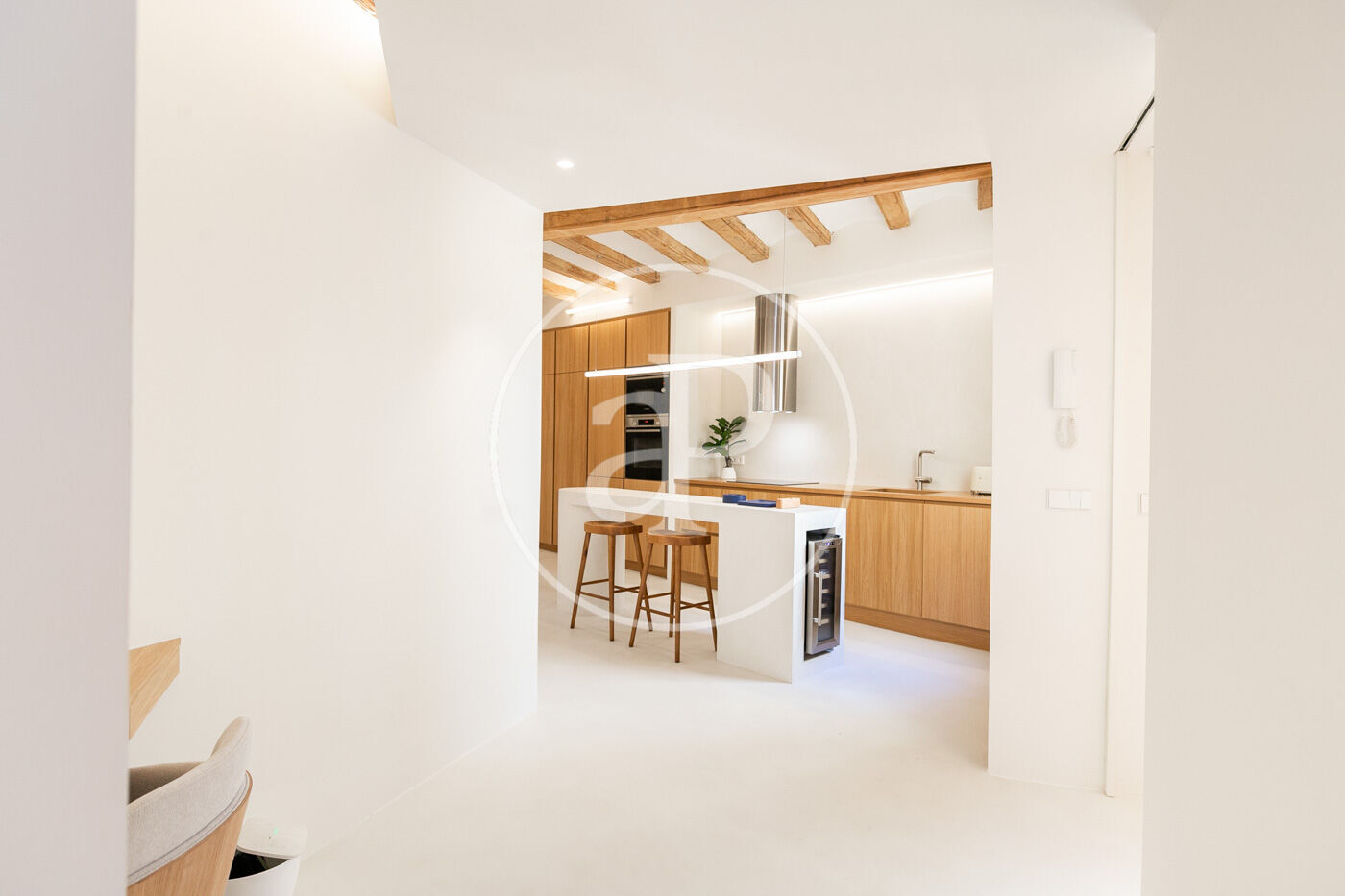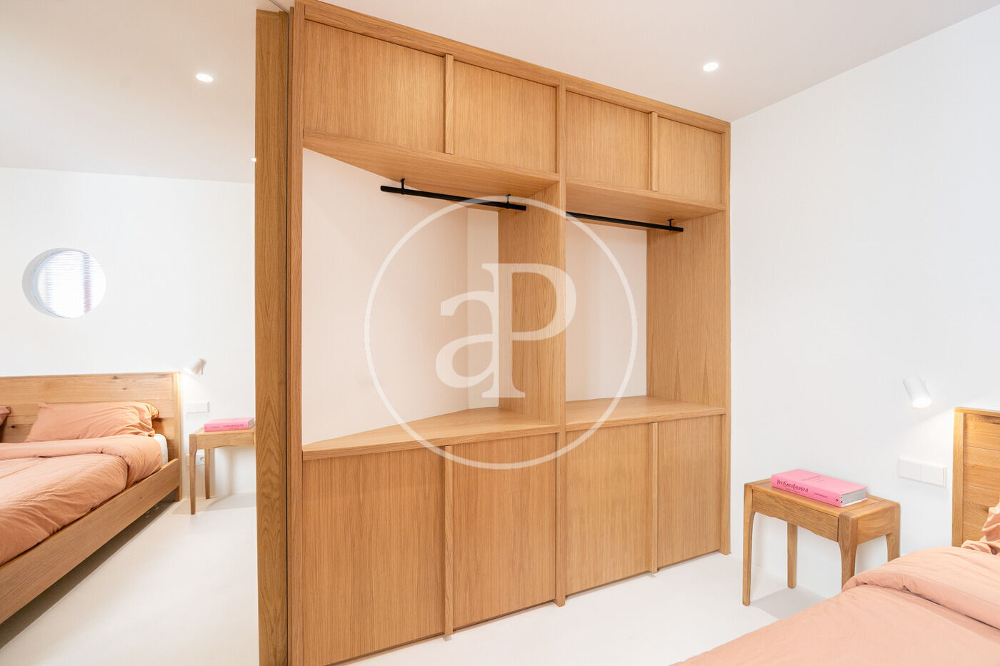 Ubicado en una planta alta de un edificio rehabilitado, sin ascensor, este apartamento ha sido completamente renovado con un proyecto arquitectónico que realza la luz y la amplitud. Dispone de un dormitorio independiente, un espacio diáfano que integra salón, recibidor y cocina, y conserva elementos originales como carpinterías, vigas vistas y mosaicos hidráulicos, que se mezclan de forma armónica con acabados actuales de líneas sobrias y sofisticadas. La vivienda se entrega totalmente amueblada y equipada con electrodomésticos de alta gama, lista para entrar a vivir desde el primer día, sin necesidad de añadir nada más.