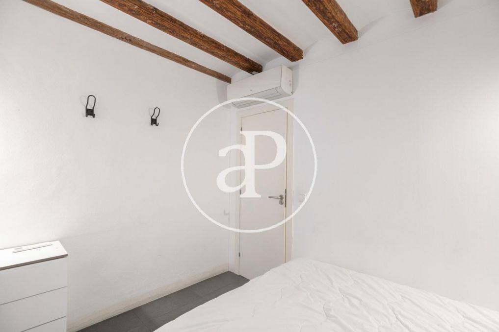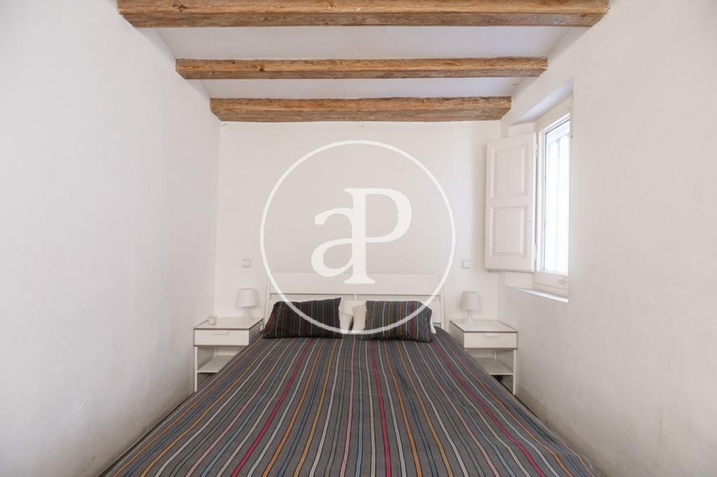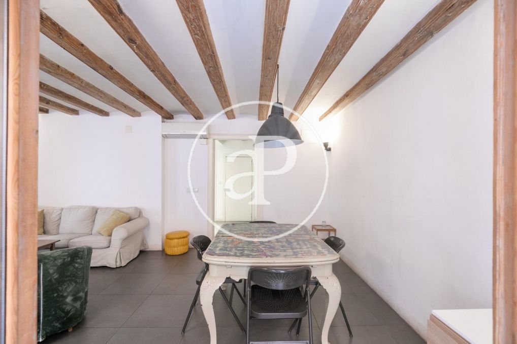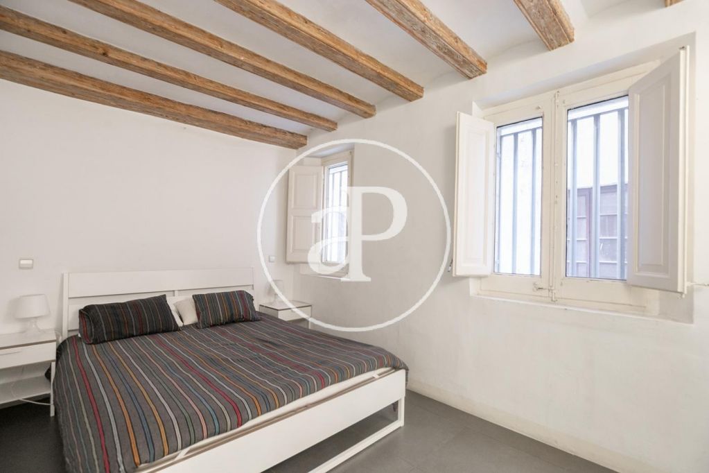 Se desarrolla en una sola planta, a la que se accede a través de un recibidor que nos conduce al amplio salón-comedor esquinero con acceso directo a balcones y techos de vigas vistas de madera, y al pasillo que conduce a la zona de noche y cocina. La zona de noche consta 4 habitaciones todas dobles, todas exteriores y que dan a una tranquila calle perpendicular a Sant Pau. Cuenta además con 2 baños completos con ducha y un aseo, completamente reformados, y una cocina totalmente equipada y con espacio para mesa de comedor, recientemente reformada. El piso cuenta con aire acondicionado por split en el salón comedor y en todos los dormitorios.