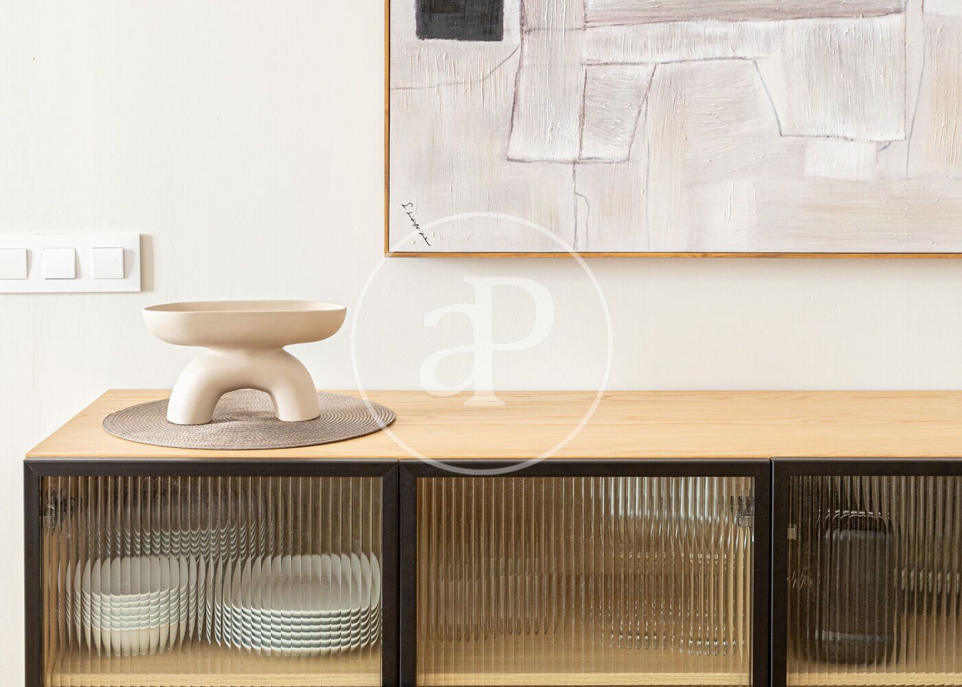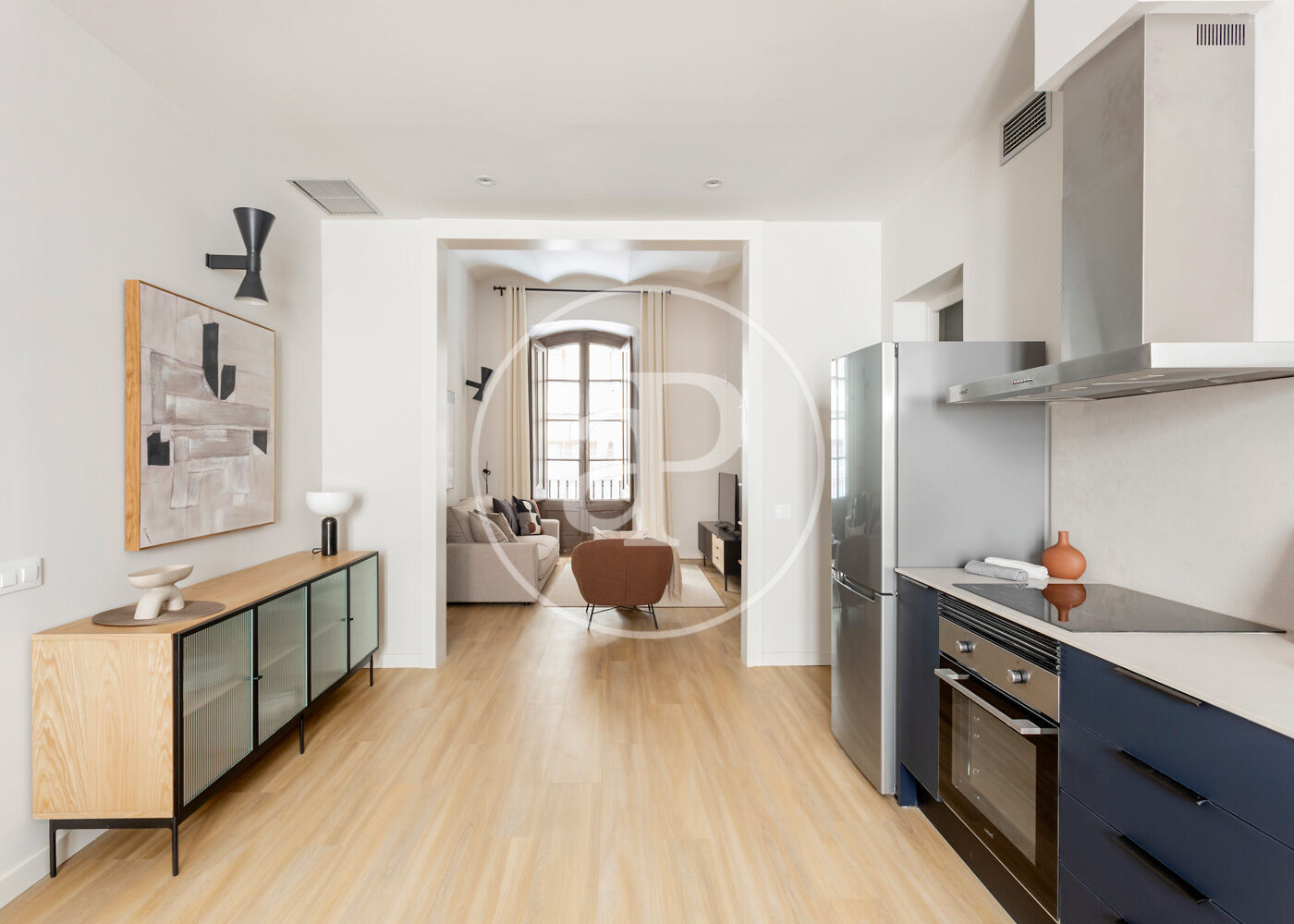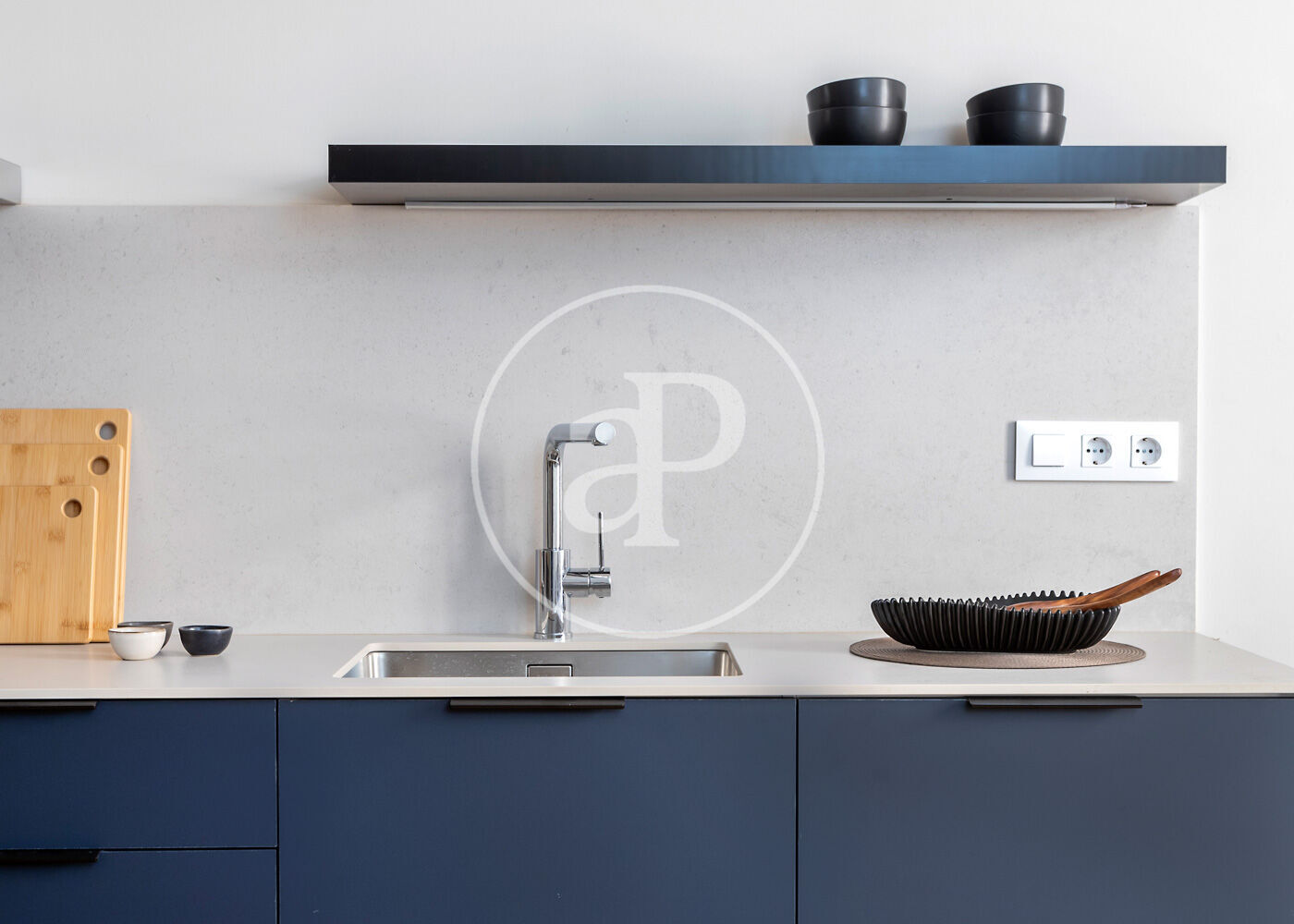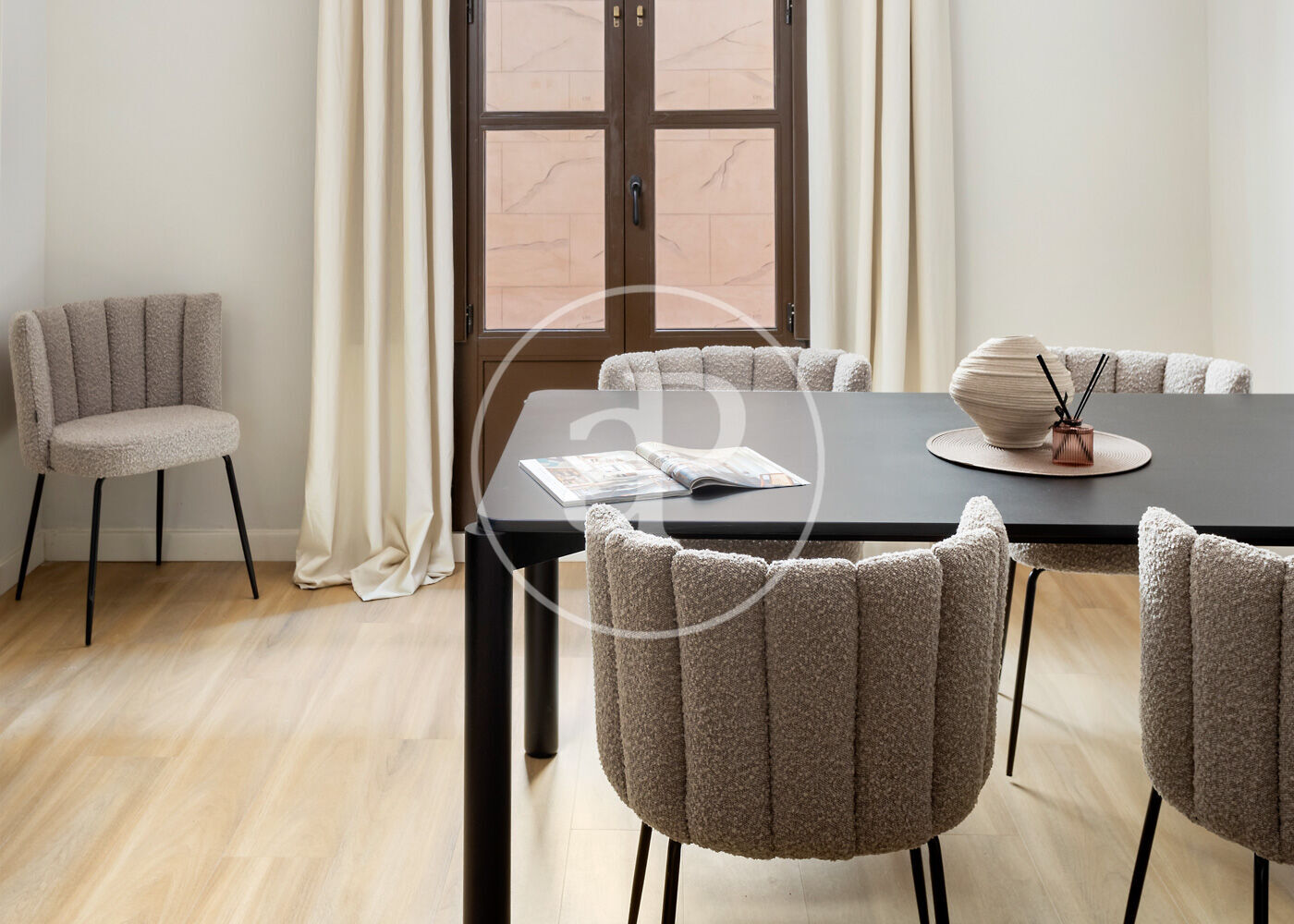Este moderno y acogedor piso de 97 m² en el barrio Gótico de Barcelona destaca por su elegante paleta de colores y su excelente ubicación. Al entrar, te recibe un luminoso salón comedor con un cómodo sofá y un comedor junto a un ventanal con marcos de madera. La cocina americana, totalmente equipada con electrodomésticos de alta gama, se integra perfectamente en el espacio.