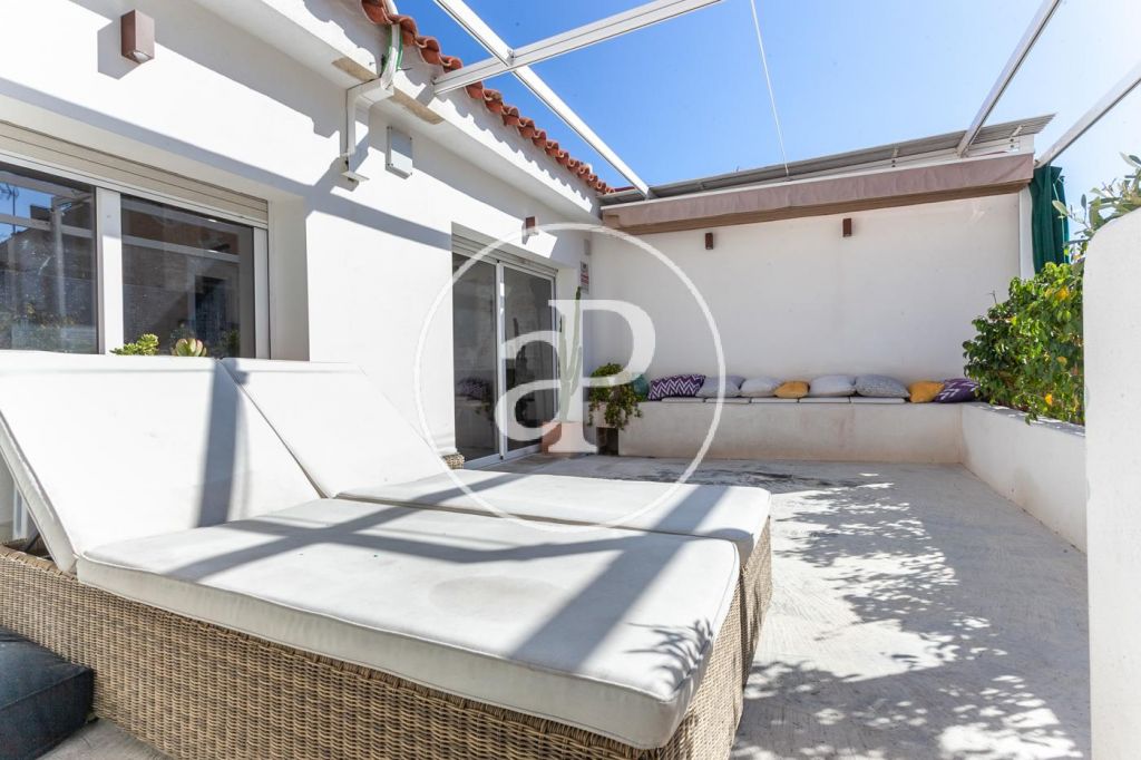 La zona de día consta de un luminoso salón-comedor con chimenea, cocina americana abierta al salón totalmente equipado con electrodomésticos- mobiliario de alta gama, zona despacho, baño con bañera y acceso a la agradable terraza equipada con tumbonas, sofá, barbacoa y ducha.