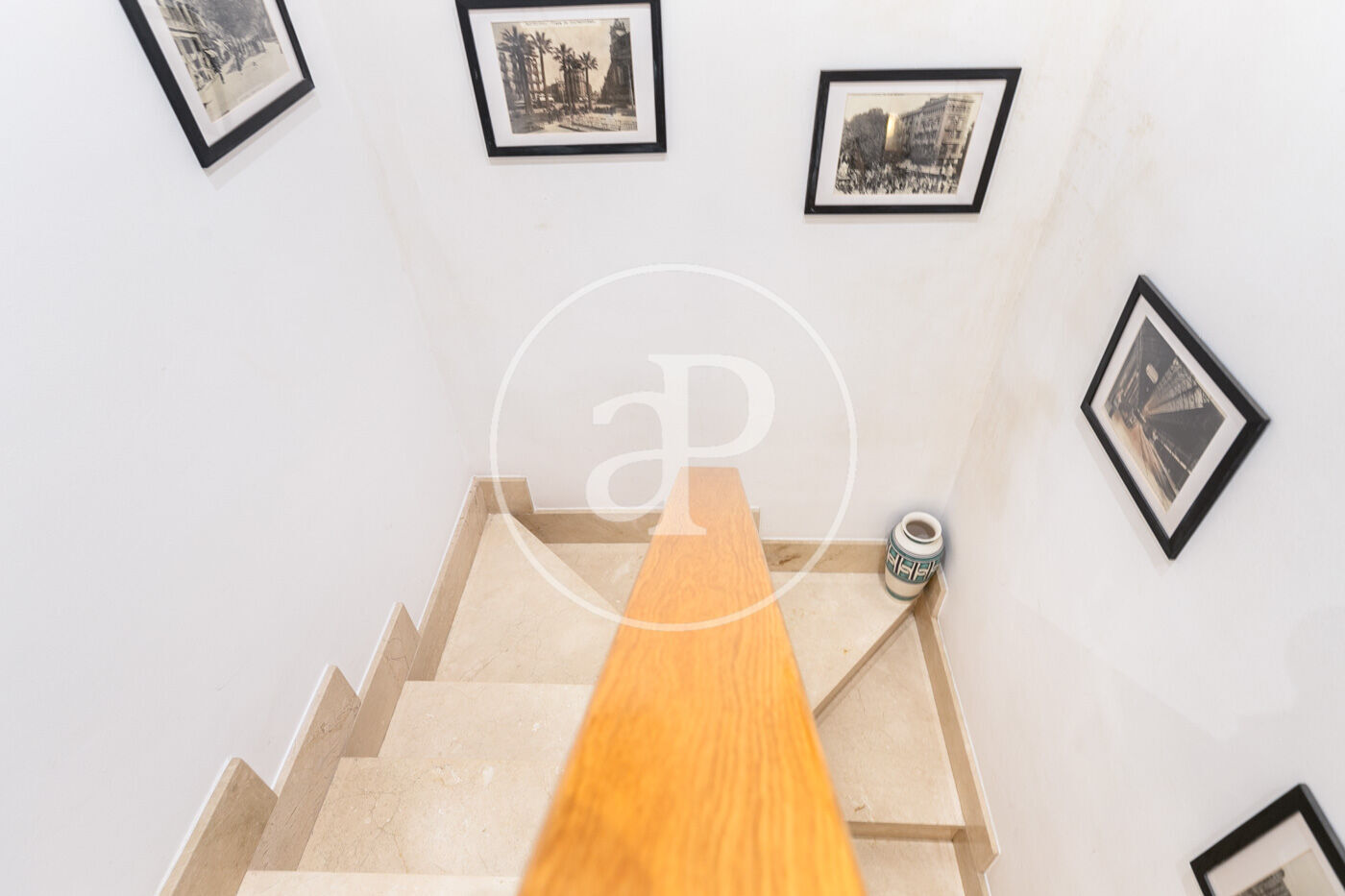 Piso amueblado en un edificio modernista de la Vila de Gràcia, catalogado por patrimonio. Se encuentra en calle muy tranquila, en una zona muy bien comunicada, con todo tipo de accesos al transporte público, rodeada de comercios. El piso se encuentra en la entreplanta del edificio, con una superficie de 150m2 más 50 m2 de un jardín privado muy disfrutable. El piso se distribuye en una zona de día con un amplio y luminoso salón-comedor, con techos artesonados y pintados a mano que tiene vistas al jardín, y con una cocina independiente y luminosa, totalmente equipada con electrodomésticos de alta gama y con vistas directas y acceso al jardín. En la zona de noche el piso tiene cuatro habitaciones y un vestidor. La habitación principal es amplia y exterior con un techo artesonado y pintado a mano. El amplio baño, con un techo artesonado y pintado a mano, queda contiguo y dispone de instalaciones nuevas. Esta zona tiene además dos habitaciones, una con amplias y cómodas literas y otra con una cama doble, ambas con armarios que comparten un baño completo con instalaciones nuevas. Dispone también de una habitación destinada a despacho y otra habitación amplia de uso como vestidor con armarios de suelo a techo de madera. En el pasillo de acceso a la zona de noche hay techos artesonados pintados a mano y una gran cristalera de colores típica del modernismo. A través de una de las habitaciones se accede a una planta inferior que tiene un uso como sala polivalente. Todo el piso dispone de suelo de parquet nuevo, calefacción radial y aire acondicionado por split en el salón. Es un piso muy exclusivo para aquellas personas que valoren el encanto de vivir en una casa modernista con jardín, dentro de una zona tranquila y bien comunicada. El alquiler incluye gastos de comunidad, IBI, servicios de limpieza (a convenir días) y servicio de mantenimiento de jardinería. No se admiten mascotas. La finalidad del contrato es temporal. La realidad del mobiliario puede no corresponder exactamente con las fotografías mostradas en este anuncio.* En cumplimiento de la Ley 12/2023 y la Llei 18/2007 informamos que:Índice de R.P.LL: 15,00 € / m2 Precio de referencia estatal 1.857,00 €