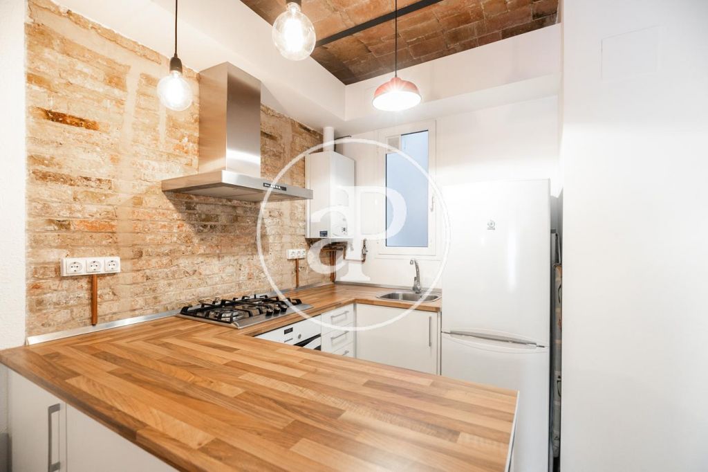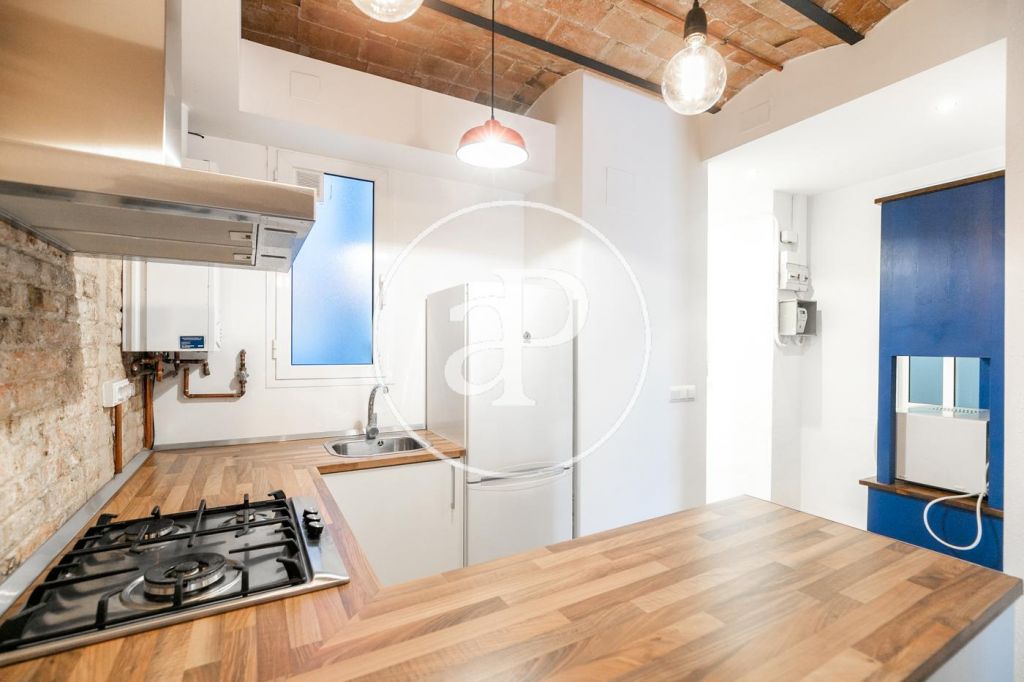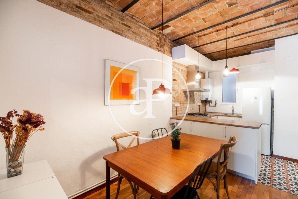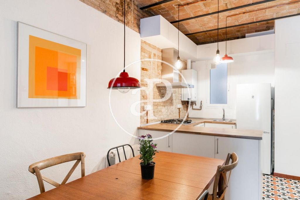 En el atractivo y céntrico barrio de Poble Sec, rodeado de todo tipo de servicios, con diferentes opciones de transporte público y muy cercano a la playa, encontramos este piso totalmente reformado y amueblado de 50m2. Cocina totalmente equipada abierta al bonito comedor con techos de bóveda vista tipo catalana y un salón con un sofá y televisión. Dos habitaciones, una doble y una individual con una litera con dos camas y armarios. Un baño completo. Calefacción por gas, aire acondicionado, suelos de parquet y ascensor. Disponibilidad inmediata.