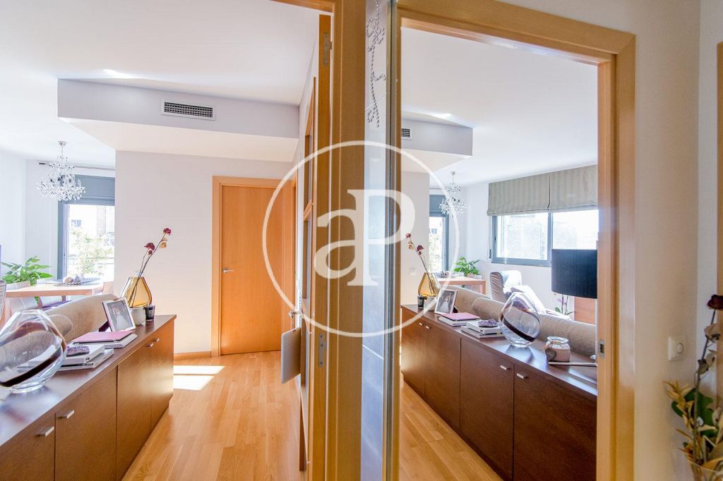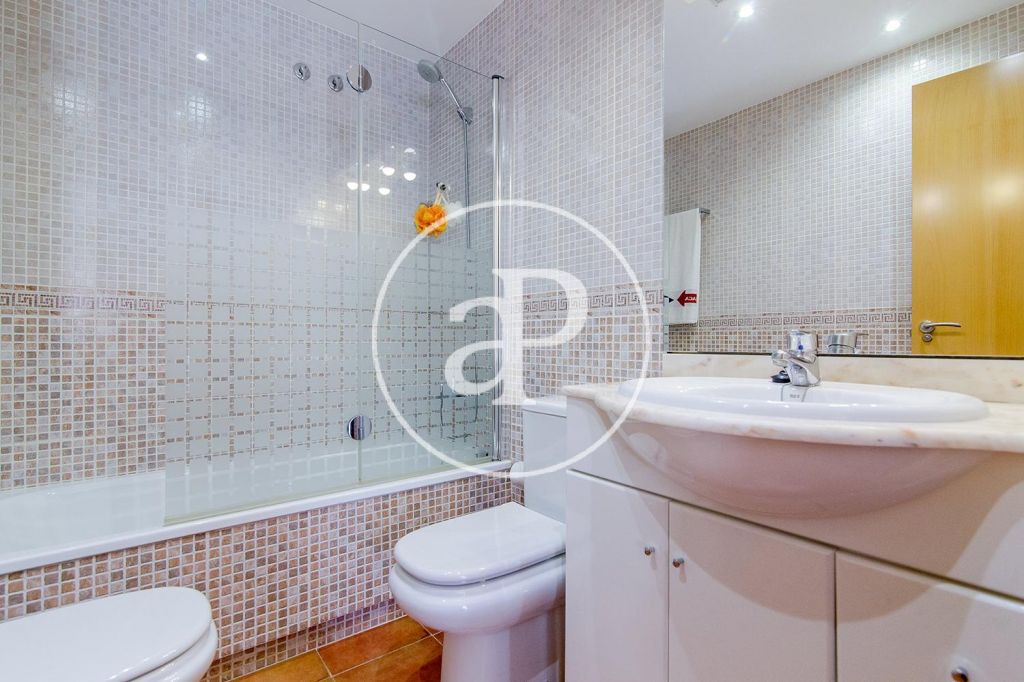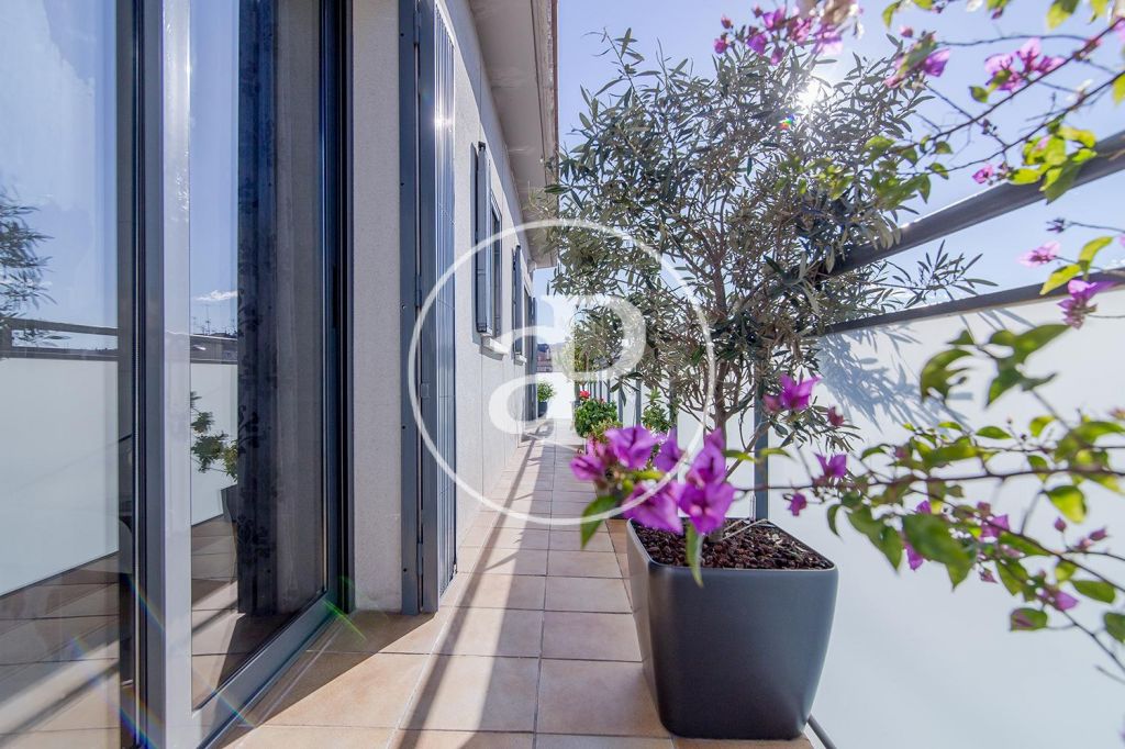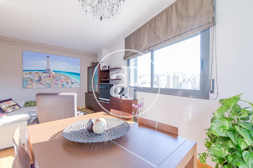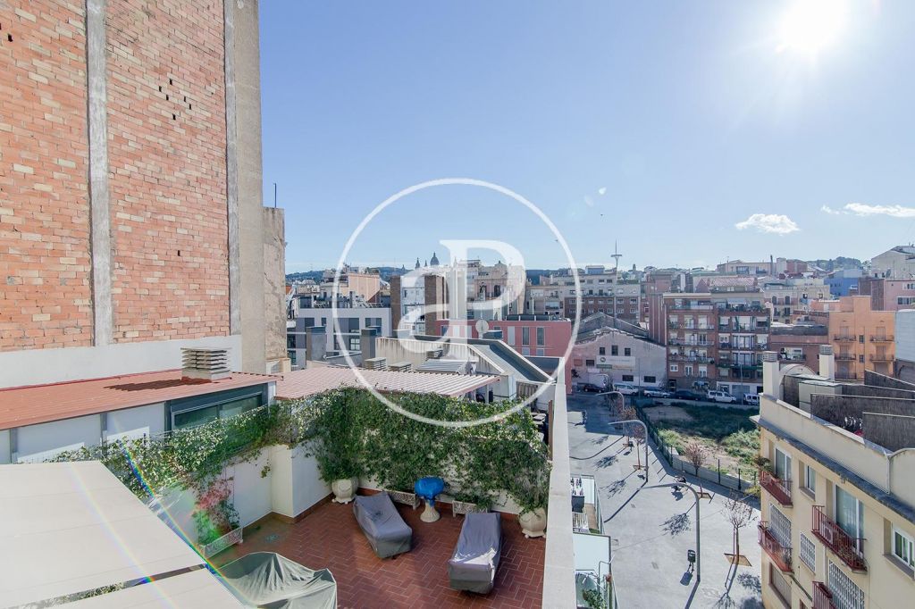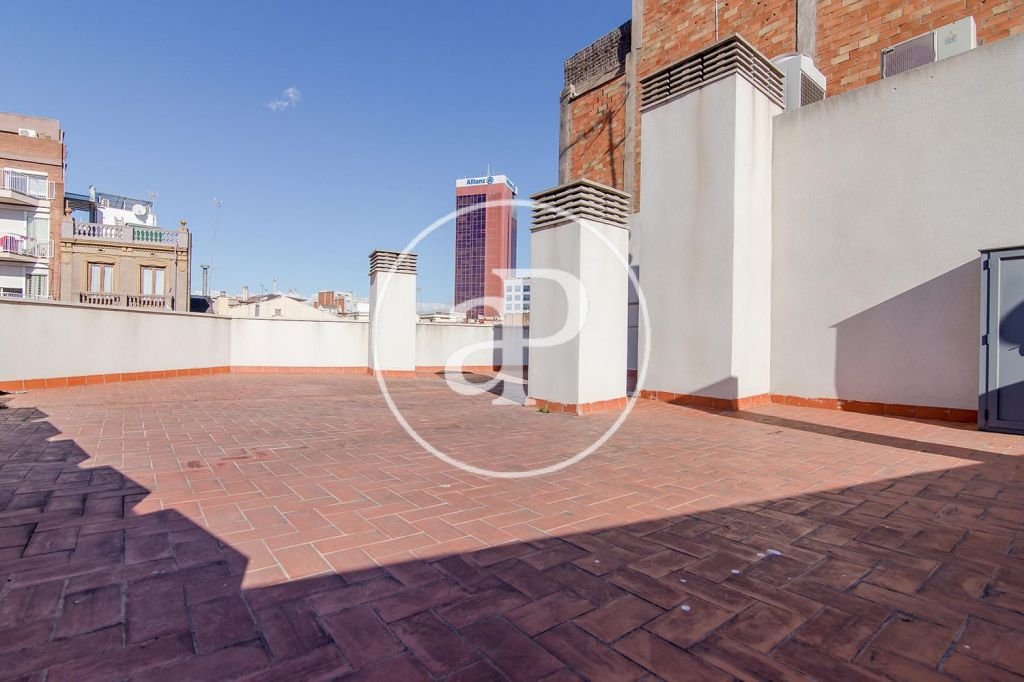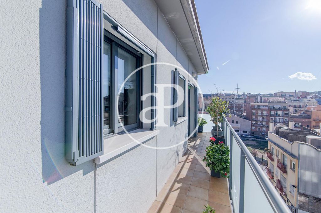 Magnífico piso/ático de alto standing en alquiler situado en la última planta de una finca semi-nueva con ascensor. El apartamento se encuentra en una zona muy céntrica a tan solo unos pasos de Plaza España, el centro comercial Las Arenas y con excelentes comunicaciones con el transporte público (metro, bus, Renfe). El piso orientado a tres vientos goza de magnifica luz natural durante todo el día en todas las estancias y de unas impresionantes vistas a Montjuic. La vivienda totalmente reformada consta de aproximadamente 90m2 distribuidos en un amplio salón-comedor, cocina independiente totalmente equipada, una habitación office, una habitación individual, un dormitorio doble y dos baños completos (uno de ellos en suite). Consta además de suelos de parqué, aire acondicionado y calefacción por conducto y un largo balcón que rodea toda la vivienda. La finca posee una gran terraza de uso comunitario.