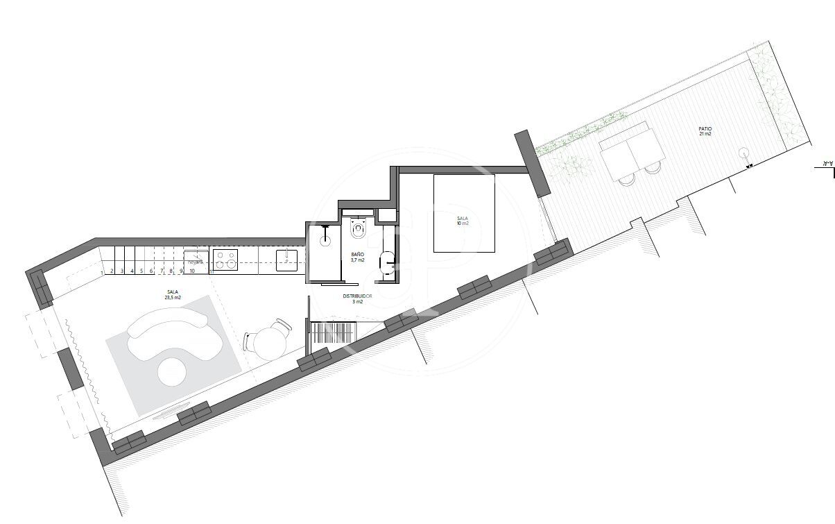 El espacio se distribuye en dos plantas. La planta baja, de 41m2 en la que encontramos, la cocina abierta al salón comedor, baño, habitación doble con acceso directo a un jardín de 21m2.