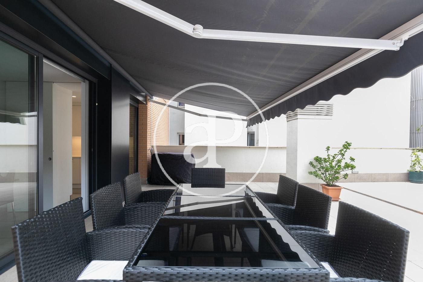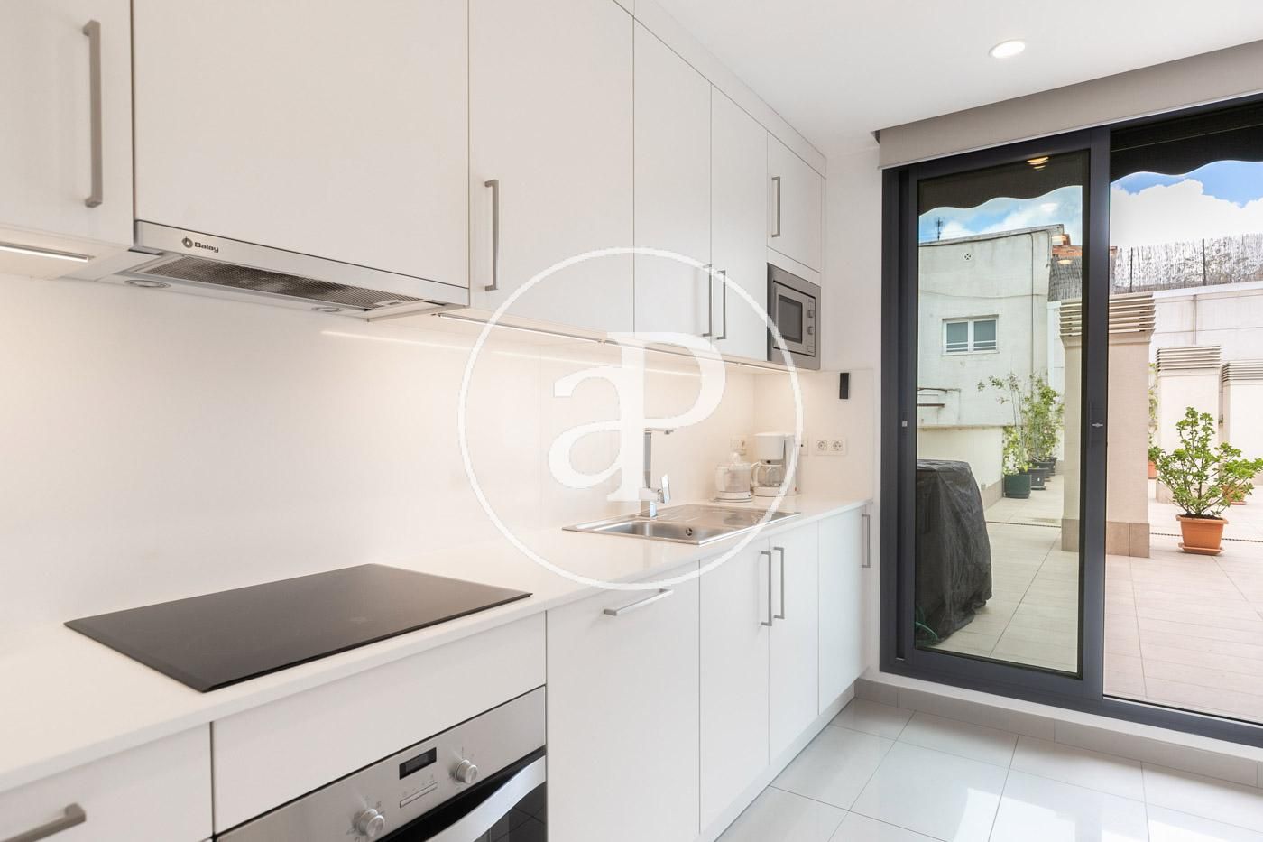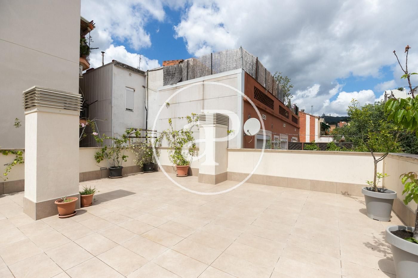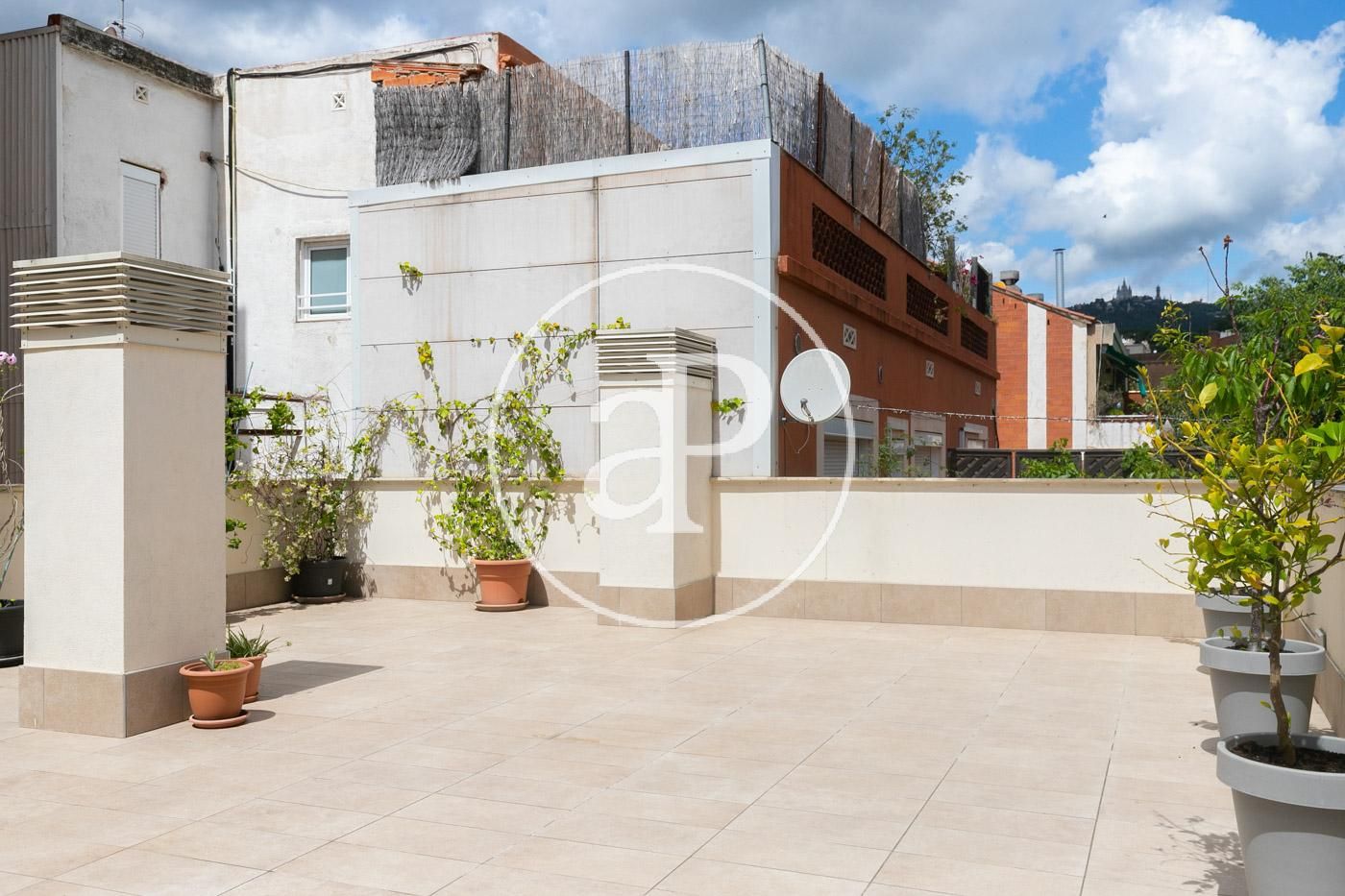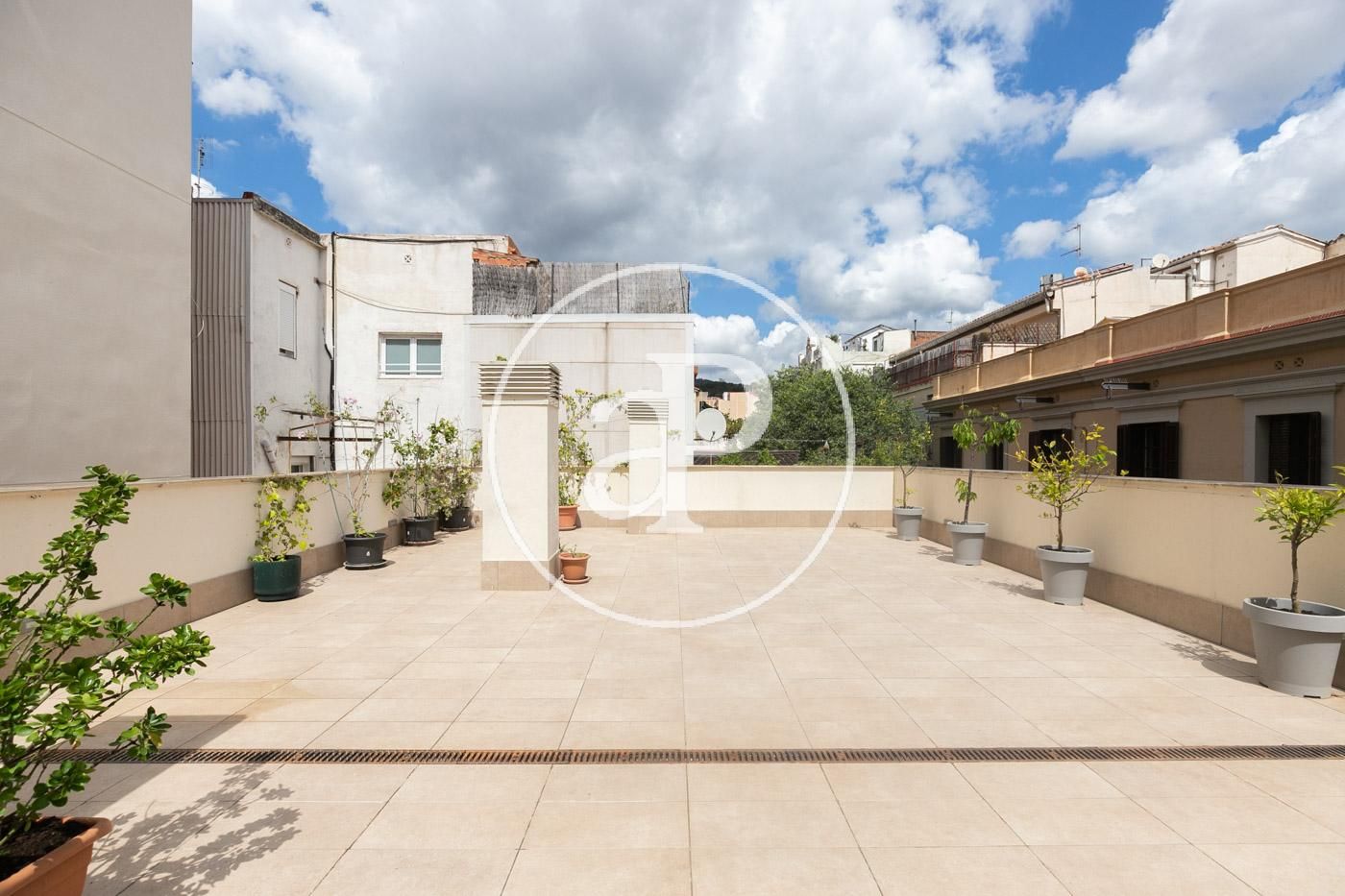 Fantástica vivienda amueblada situada en una finca nueva en la calle Guillem Tell a dos pasos de Plaza Molina, de las estaciones de FGC de Gracia y Sant Gervasi, muy cerca de los numerosos comercios locales de Gracia y del Barrio de Putxet i Farró. La vivienda de 90m2 aproximadamente, lista para entrar a vivir, consta de un acogedor y luminoso salón-comedor con salida a una magnífica terraza de 112m2 con vistas a la montaña del Tibidabo, cocina semi-independiente con salida a la terraza y equipada con electrodomésticos y menaje, un dormitorio en suite con armarios empotrados y baño completo con ducha, dos habitaciones dobles con armarios y un baño completo con ducha. Todas las habitaciones son exteriores. La vivienda se entrega totalmente amueblada e incluye un sofá cama, elementos de decoración, además de todo lo necesario para entrar a visir desde el primer día como ropa de cama, menaje, cubertería, etc. Dispone de suelos de parquet, aire acondicionado y calefacción por conductos. Hay plaza de parquing opcional. Un lugar ideal para vivir.
