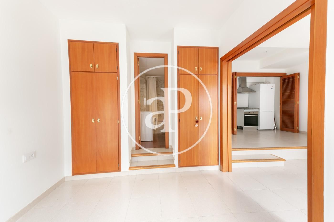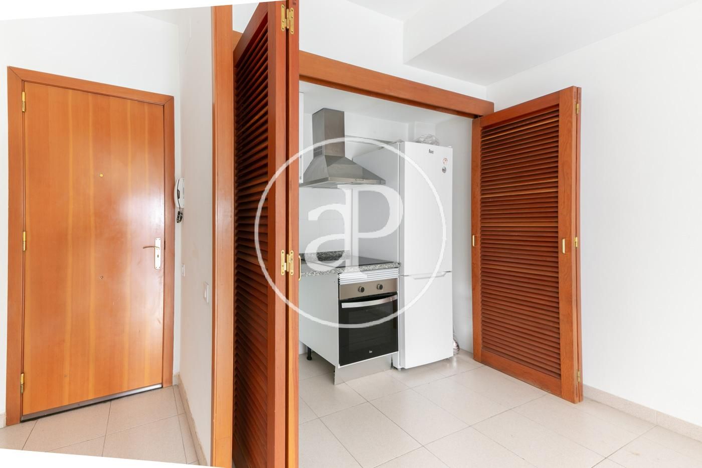 El recibidor tiene un armario empotrado que da paso a través de un escalón al salón-comedor con vistas a la calle y cocina equipada que puede ocultarse detrás de unas puertas correderas.