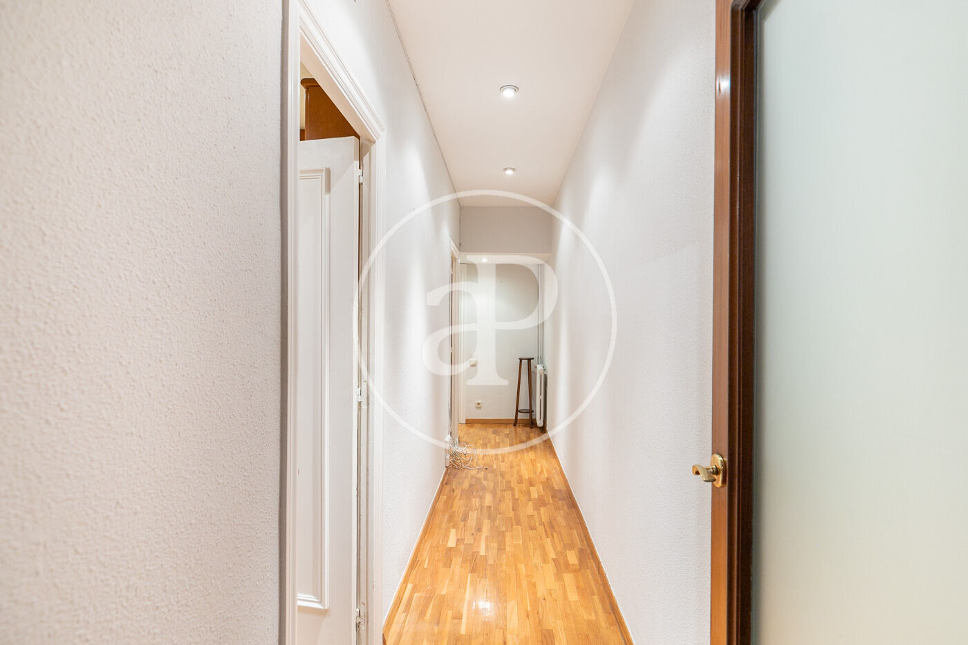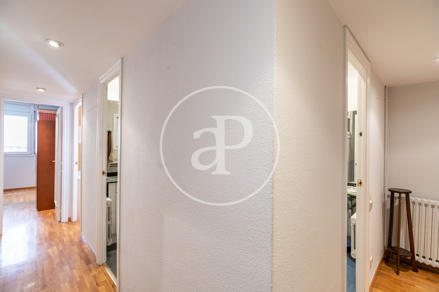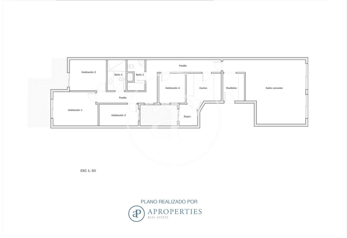 Al entrar, encontramos del lado derecho un salón-comedor amplio y luminoso orientado a General Mitre. Del lado izquierdo, un pasillo que conduce a la cocina con office y zona de lavadero. A continuación, los cuatro dormitorios, dos de ellos individuales e interiores y dos dobles exteriores. Desde uno de los dormitorios se accede a la terraza muy agradable. La vivienda cuenta con dos baños completos, uno con ducha y el otro con bañera.