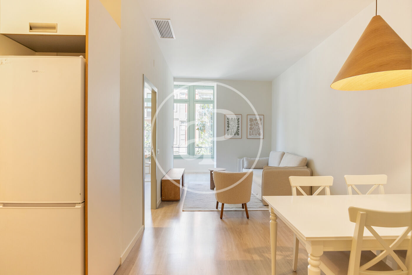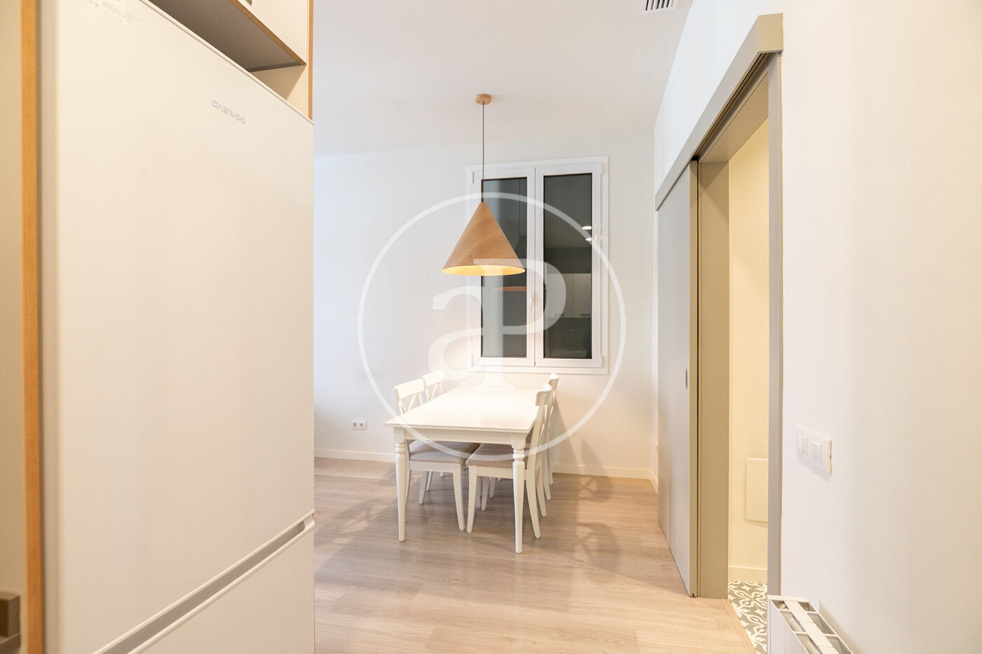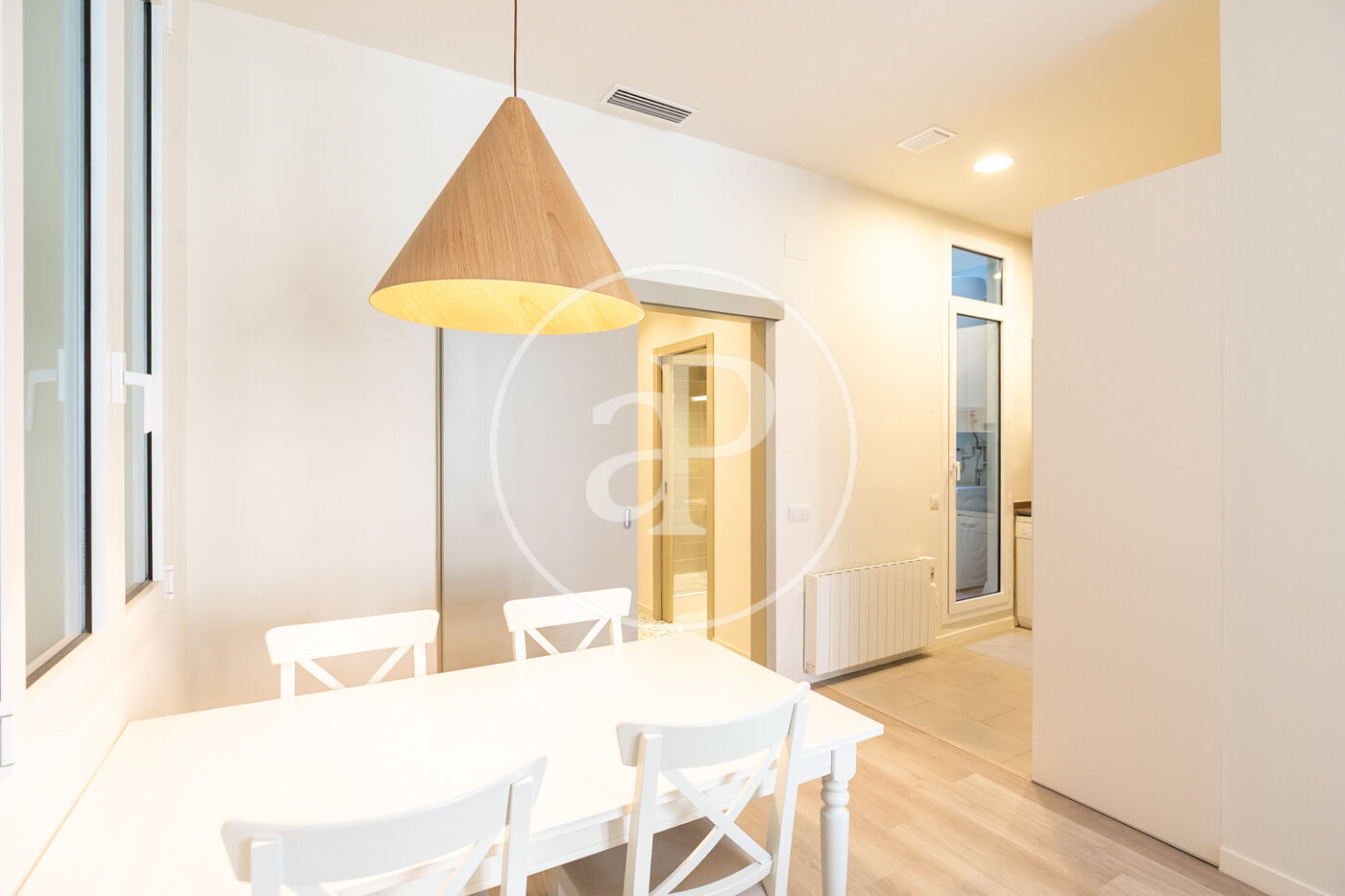 Entrando a la vivienda encontramos una bonita cocina abierta al salón con equipada con electrodomésticos de primeras marcas, en el salón hay 2 ventanales con orientacion oeste a calle Gran de Gracia con agradable luz de tardes y zona de estudio.