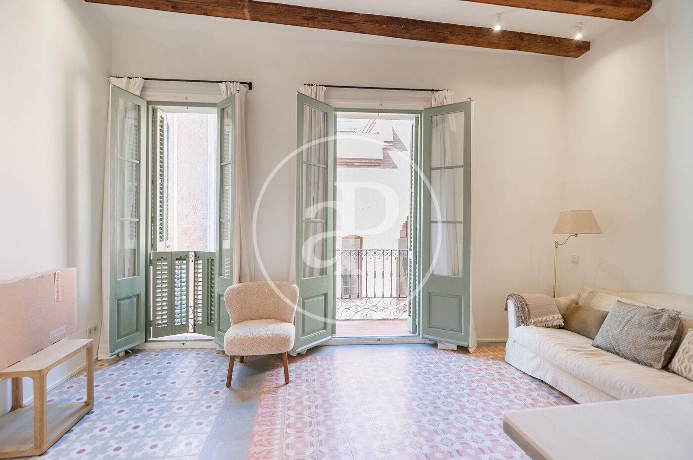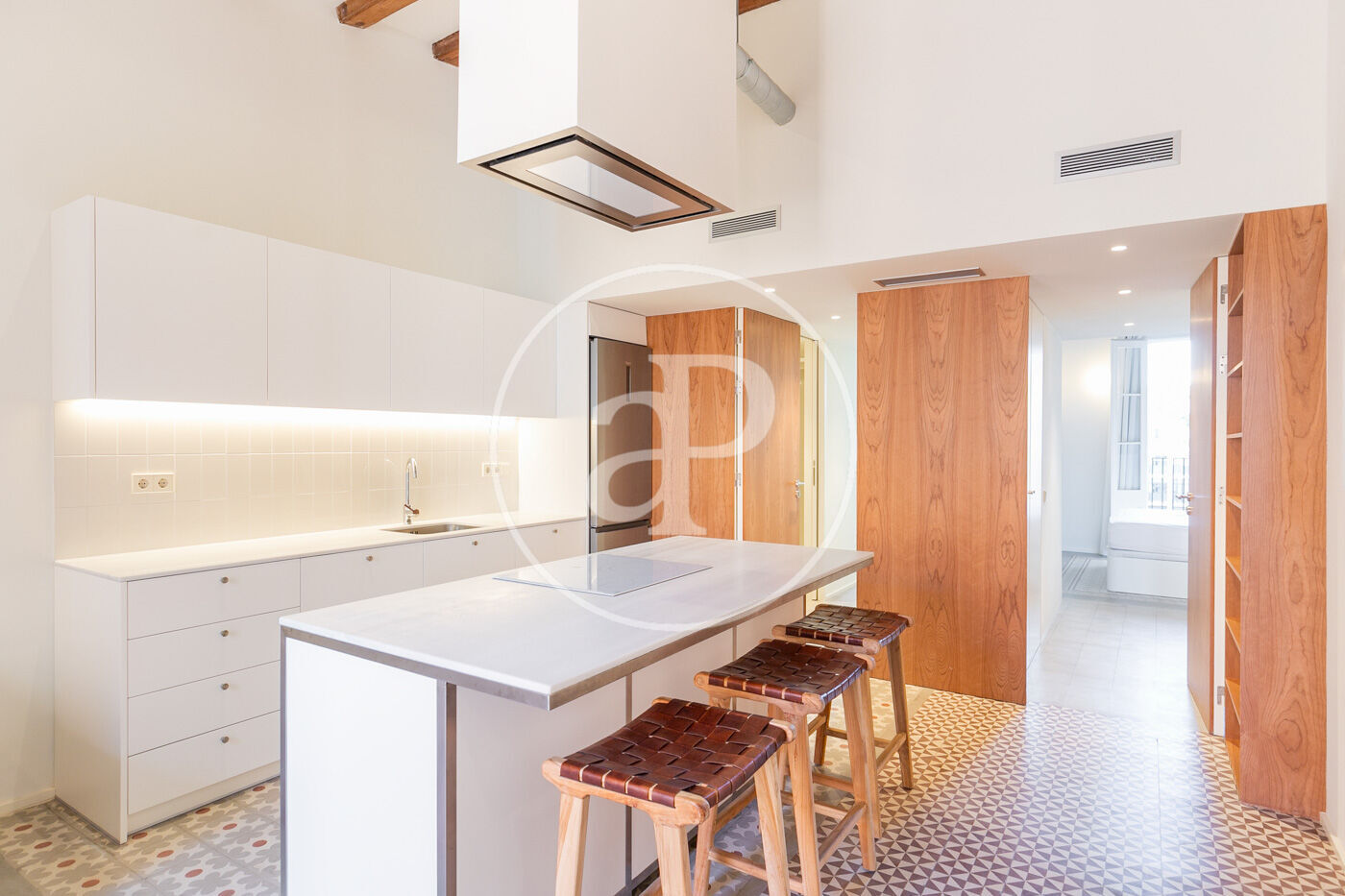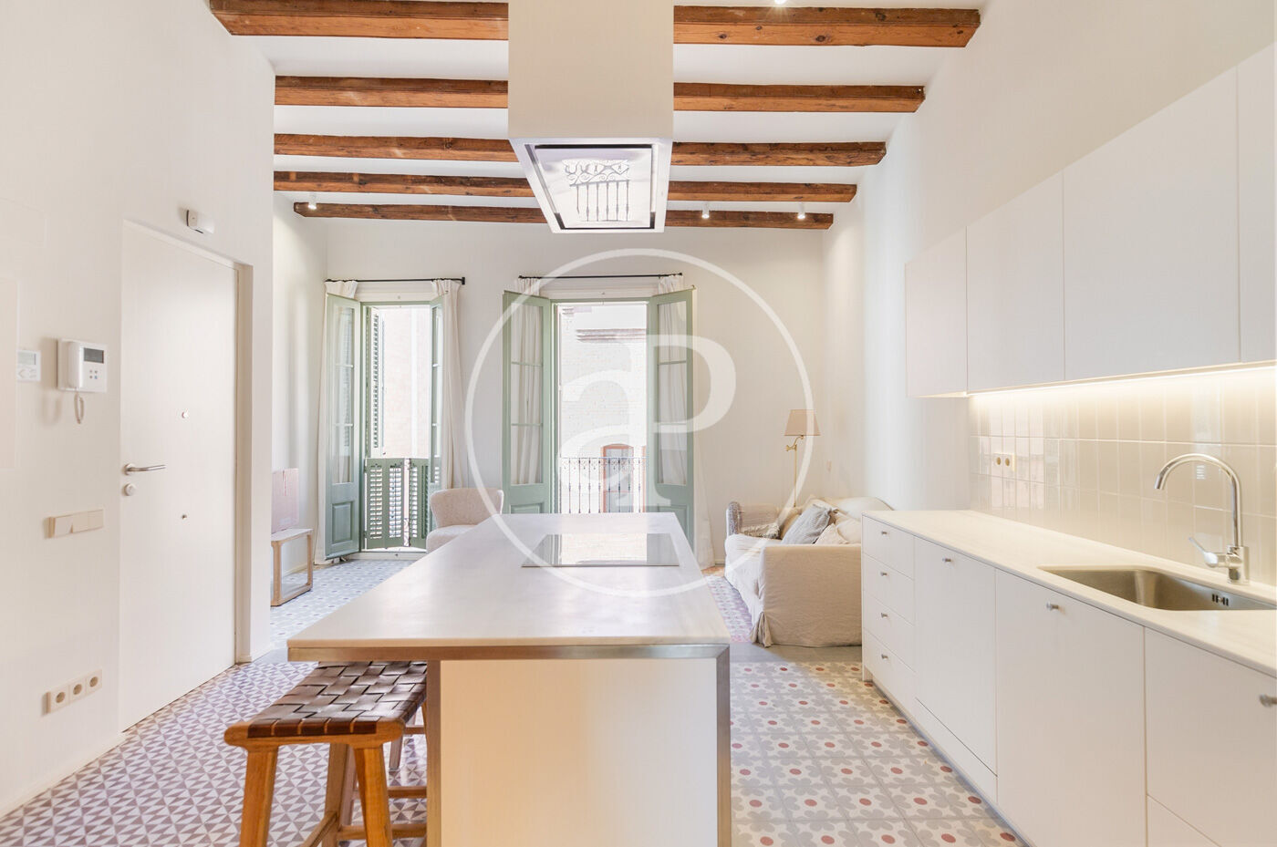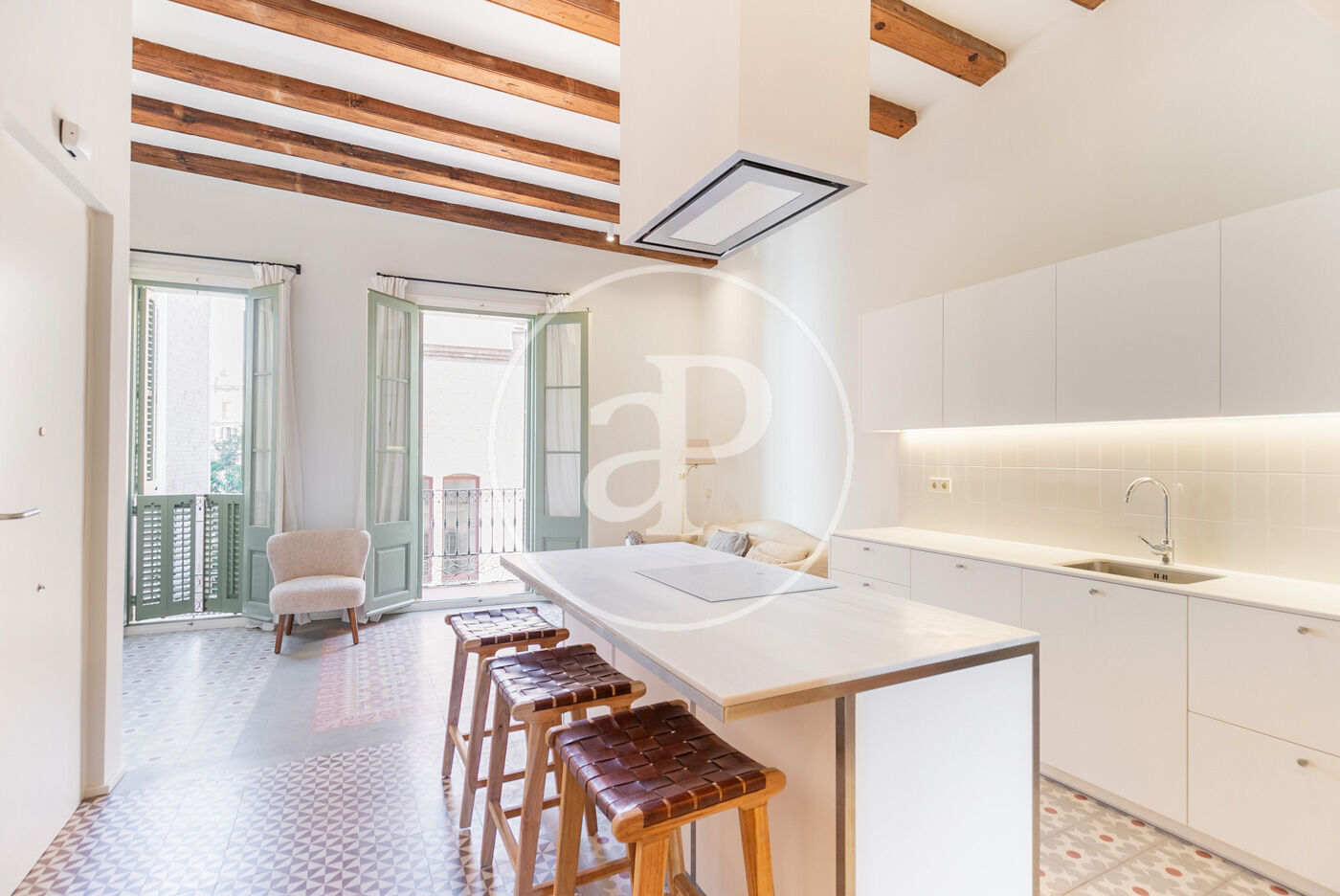 Se trata de un bonito piso recién reformado a estrenar, conservando la belleza de los elementos arquitectónicos de una finca del año 1870 rehabilitada, el piso se ubica en una cuarta planta real sin ascensor, en el que se han conservado los suelos hidráulicos y las vigas de madera de los techos.