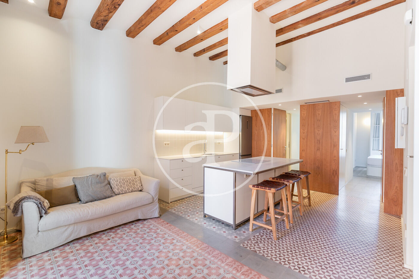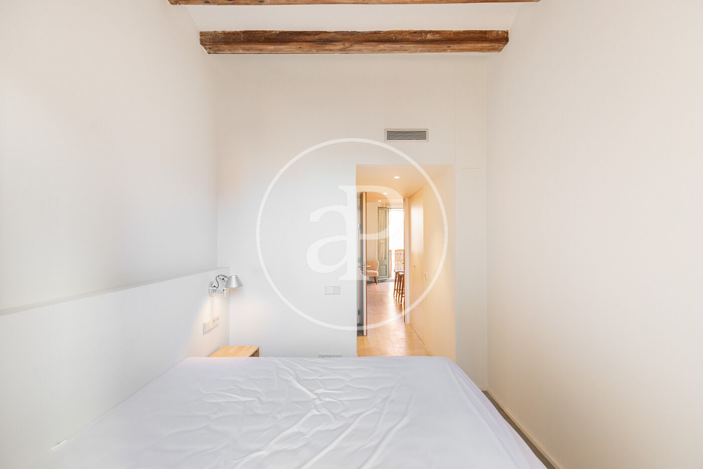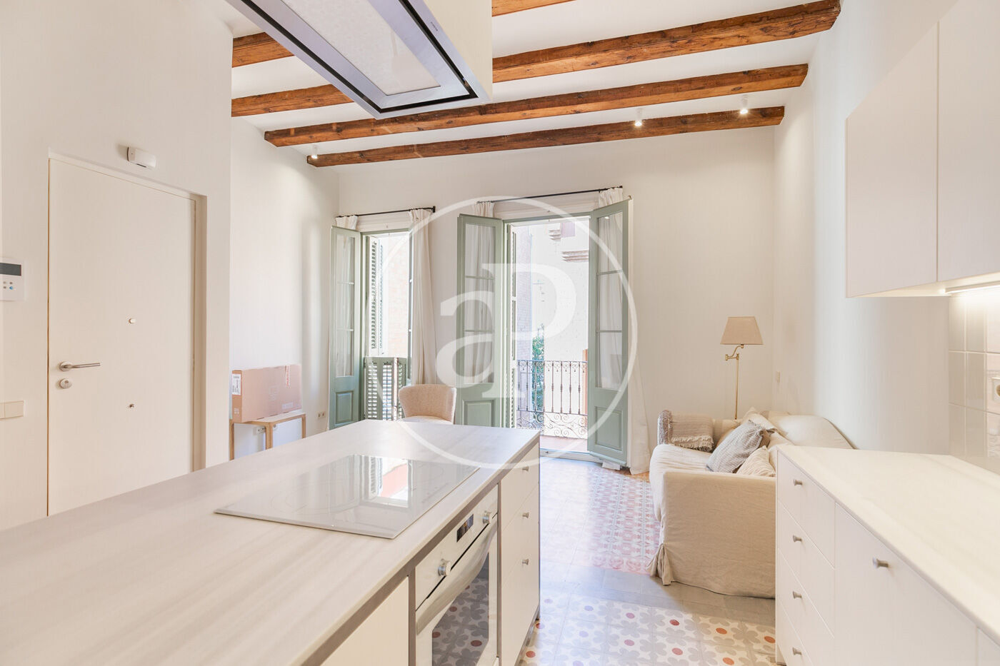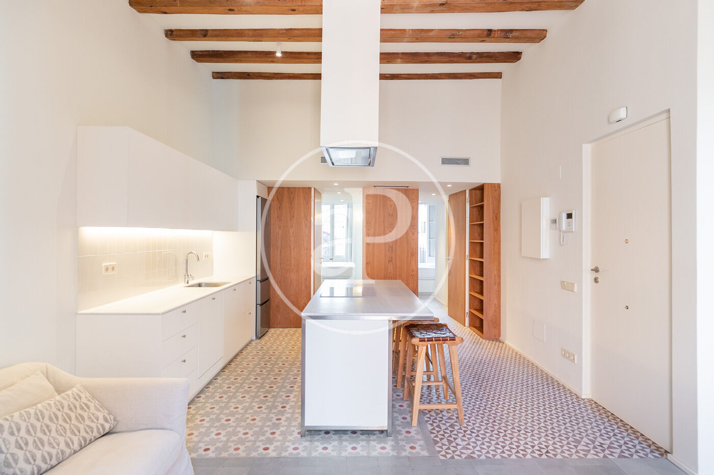 Se trata de un bonito piso recién reformado a estrenar, conservando la belleza de los elementos arquitectónicos de una finca del año 1870 rehabilitada, el piso se ubica en una cuarta planta real sin ascensor, en el que se han conservado los suelos hidráulicos y las vigas de madera de los techos.